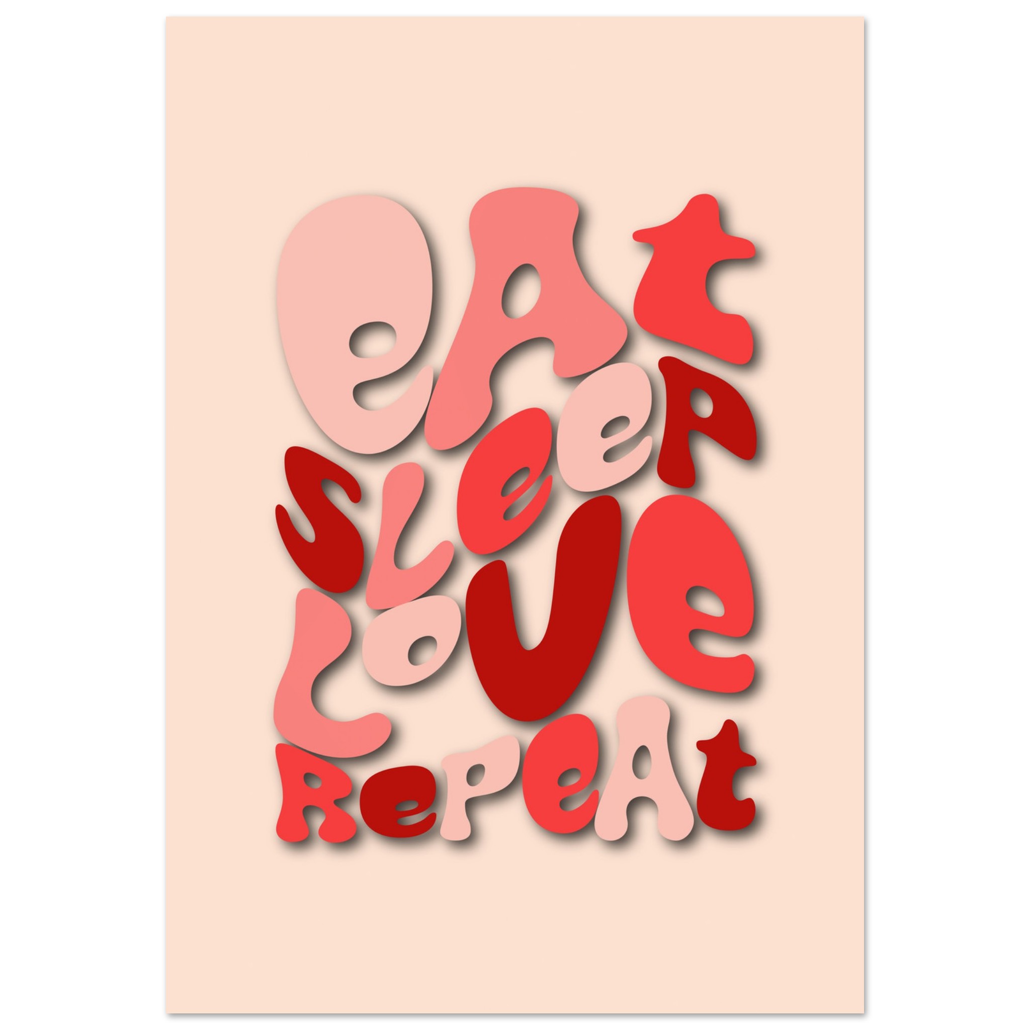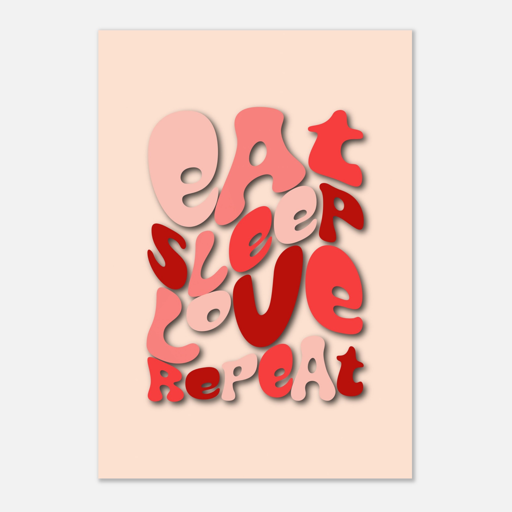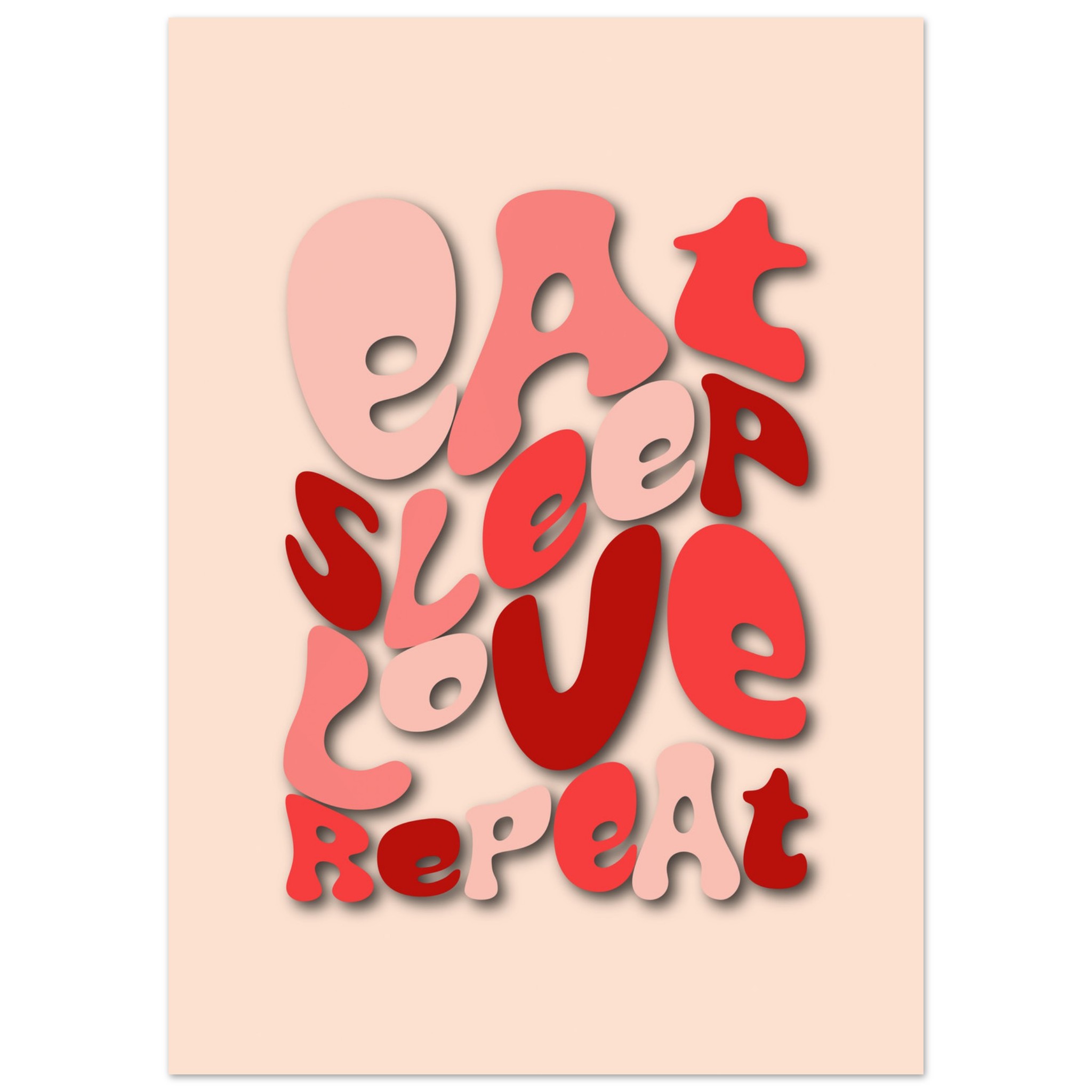 Lev livet fullt ut med vårt moderna och färgstarka konstverk som hyllar de enkla glädjeämnena i livet. ’EAT SLEEP LOVE REPEAT’ är inte bara en dekorativ detalj, utan också en daglig påminnelse om att njuta av varje stund. Den lekfulla designen och de varma tonerna gör att den passar perfekt i de flesta rum, vare sig det är i vardagsrummet, köket eller sovrummet. Denna poster är tryckt på premium matt papper för att garantera bästa möjliga kvalitet och färgåtergivning. Välj mellan en stilren vit eller klassisk svart träram för att komplettera din inredning.