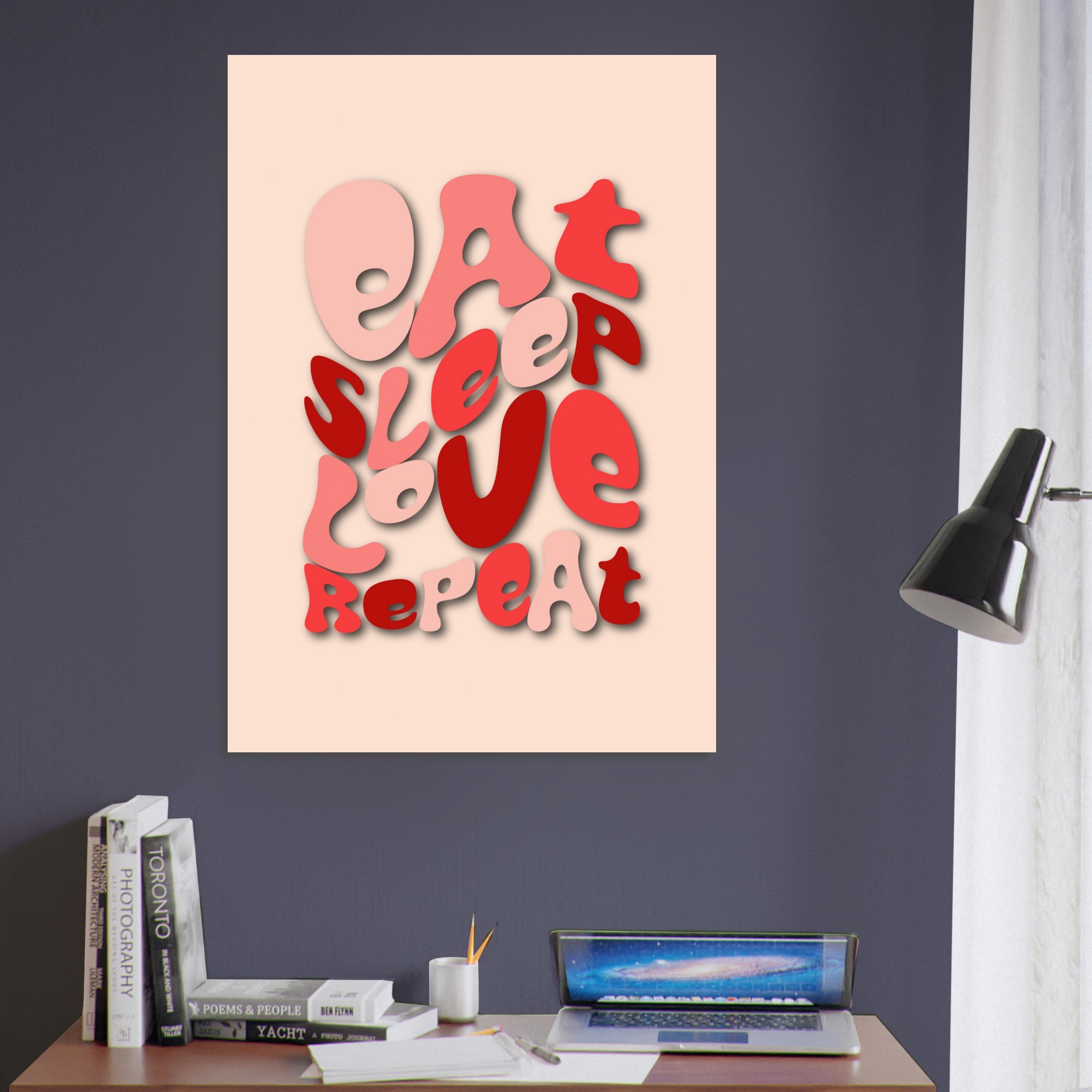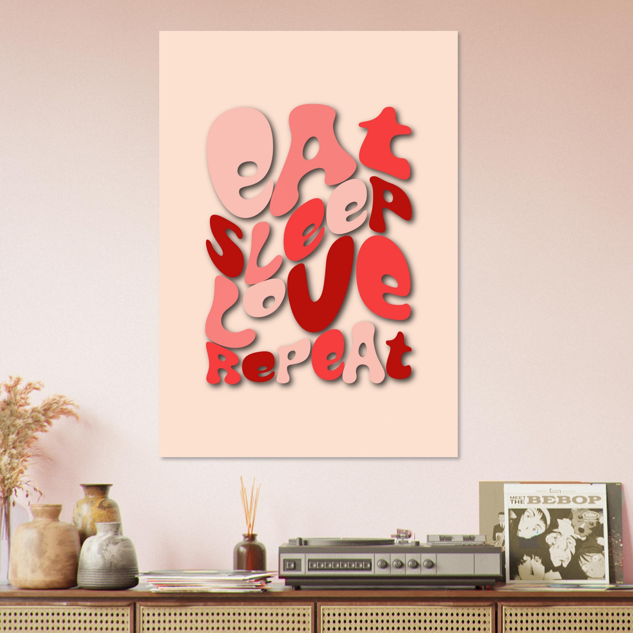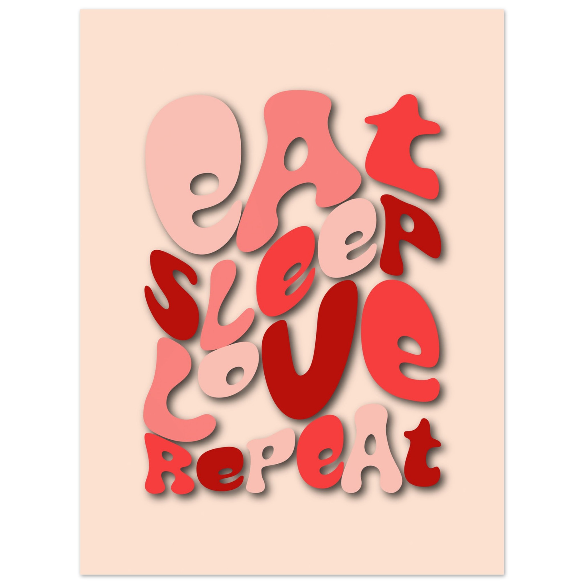 Lev livet fullt ut med vårt moderna och färgstarka konstverk som hyllar de enkla glädjeämnena i livet. ’EAT SLEEP LOVE REPEAT’ är inte bara en dekorativ detalj, utan också en daglig påminnelse om att njuta av varje stund. Den lekfulla designen och de varma tonerna gör att den passar perfekt i de flesta rum, vare sig det är i vardagsrummet, köket eller sovrummet. Denna poster är tryckt på premium matt papper för att garantera bästa möjliga kvalitet och färgåtergivning. Välj mellan en stilren vit eller klassisk svart träram för att komplettera din inredning.