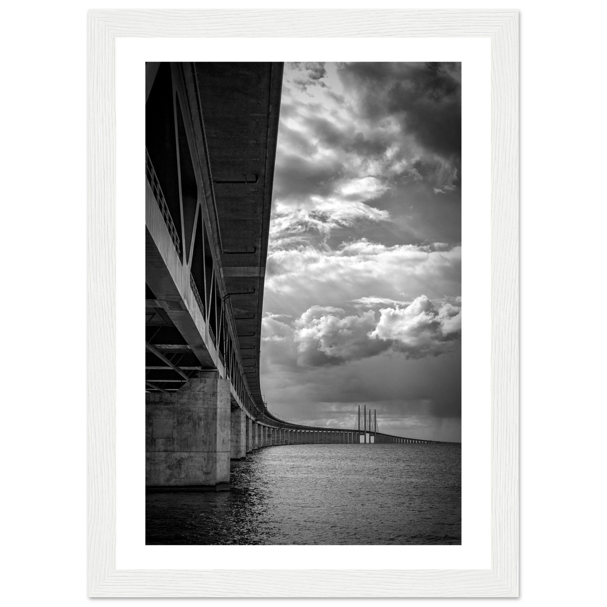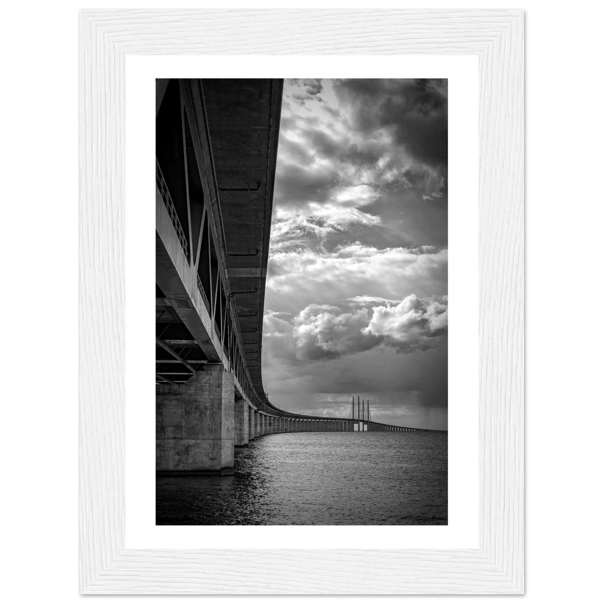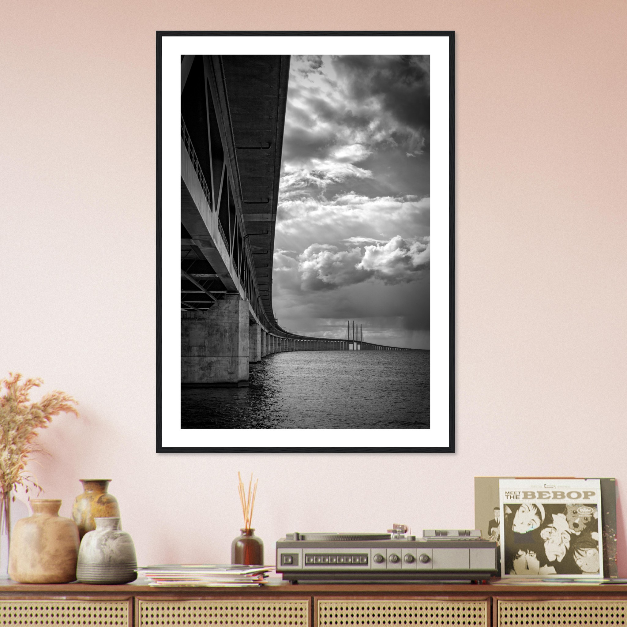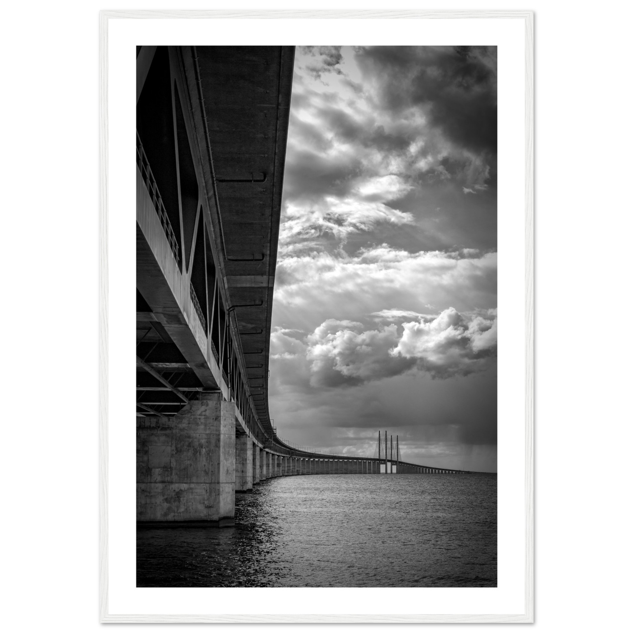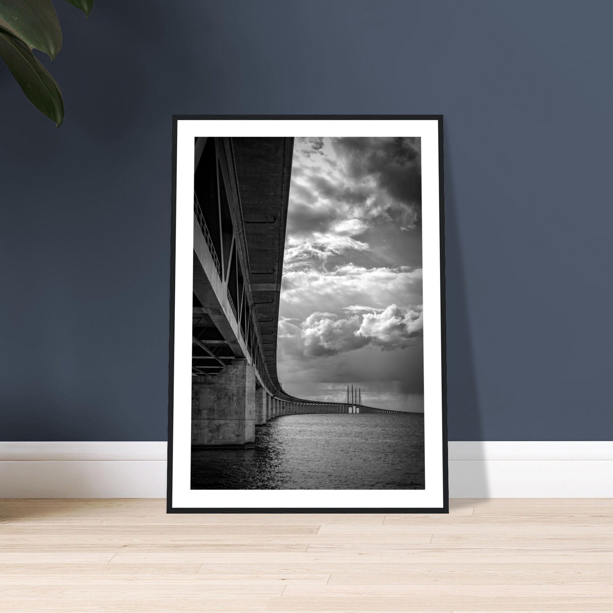 Denna storslagna svartvita poster presenterar Öresundsbron, det anmärkningsvärda byggnadsverket som förbinder Sverige och Danmark. Med dramatiska moln i bakgrunden och en kraftfull komposition som leder betraktarens öga längs brons sträckning ut mot horisonten, fångar denna bild essensen av nordisk ingenjörskonst och design. Den är perfekt för att ge en känsla av djup och perspektiv i alla utrymmen och passar väl in i både moderna och traditionella inredningsstilar.