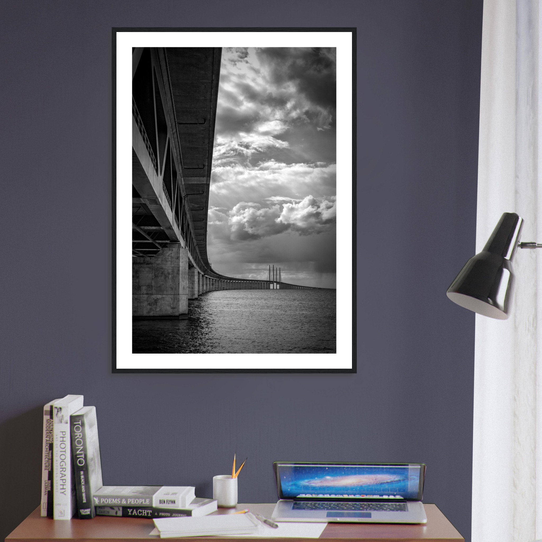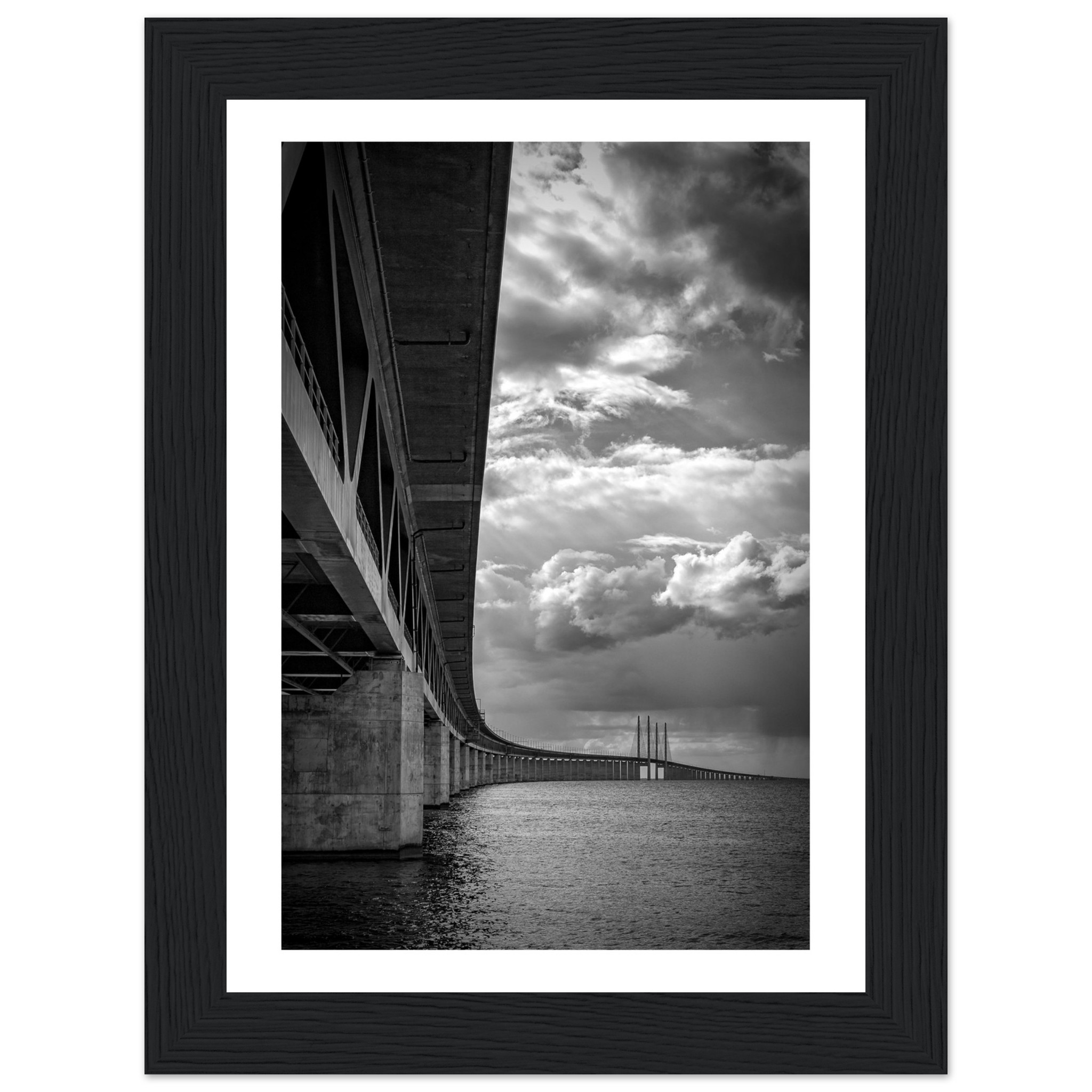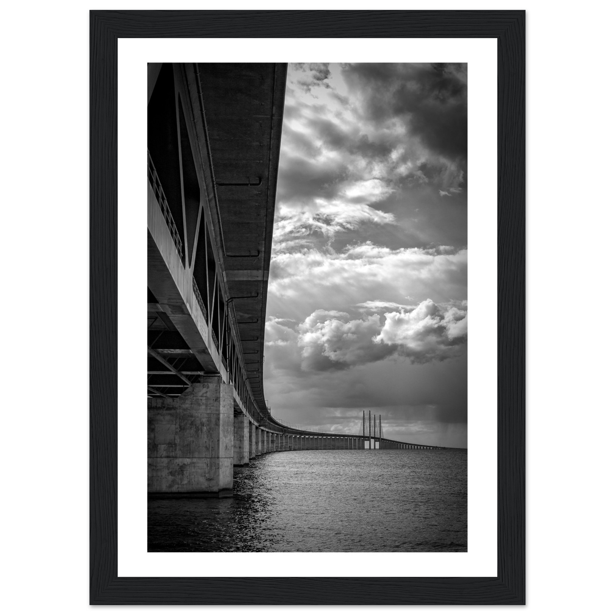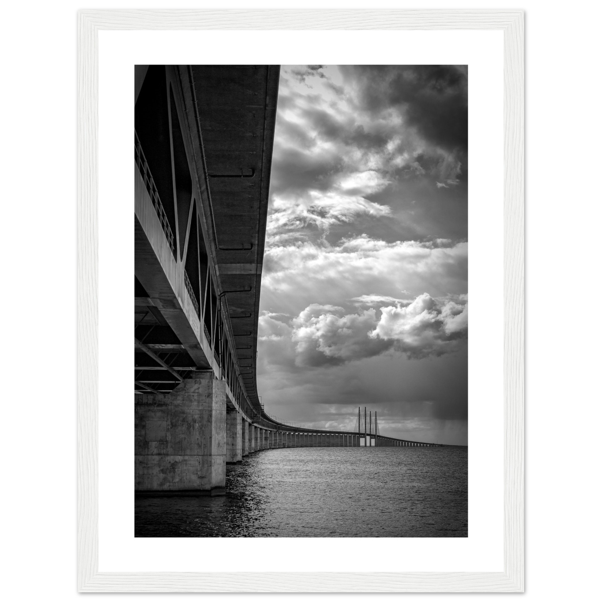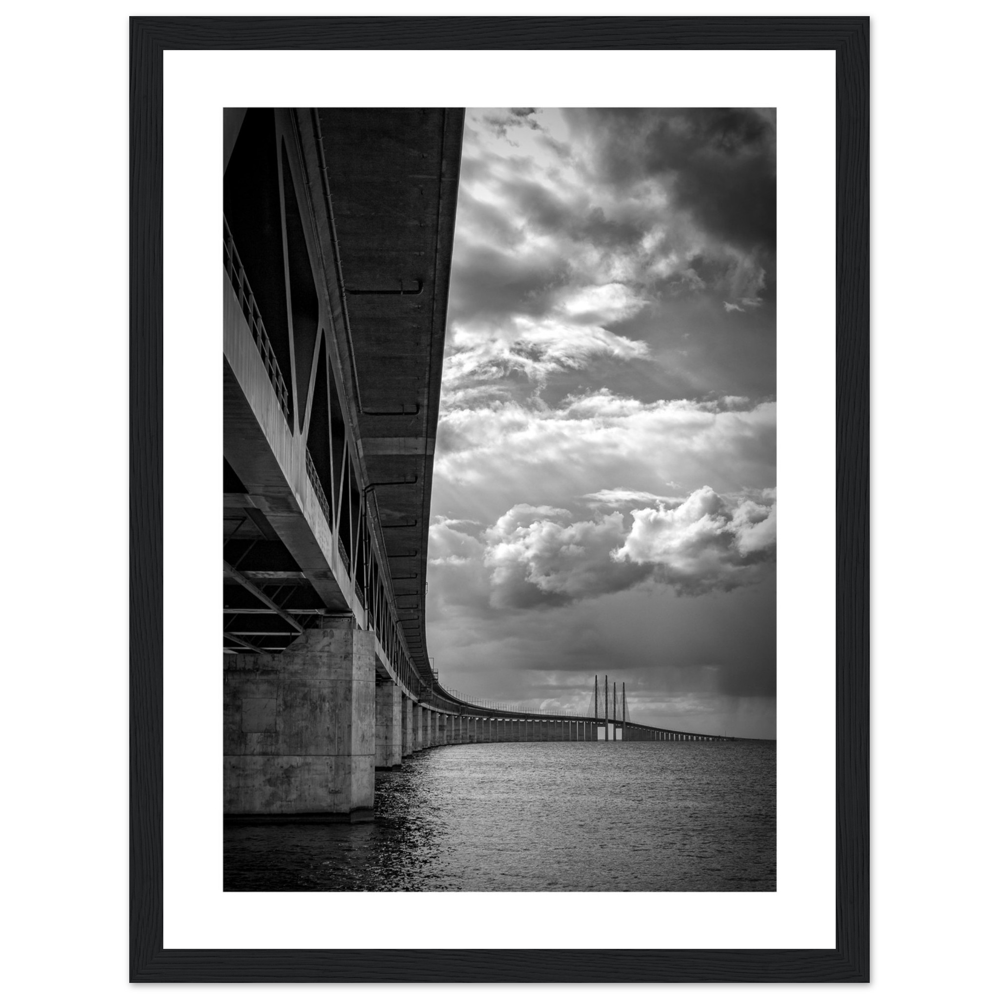 Denna storslagna svartvita poster presenterar Öresundsbron, det anmärkningsvärda byggnadsverket som förbinder Sverige och Danmark. Med dramatiska moln i bakgrunden och en kraftfull komposition som leder betraktarens öga längs brons sträckning ut mot horisonten, fångar denna bild essensen av nordisk ingenjörskonst och design. Den är perfekt för att ge en känsla av djup och perspektiv i alla utrymmen och passar väl in i både moderna och traditionella inredningsstilar.