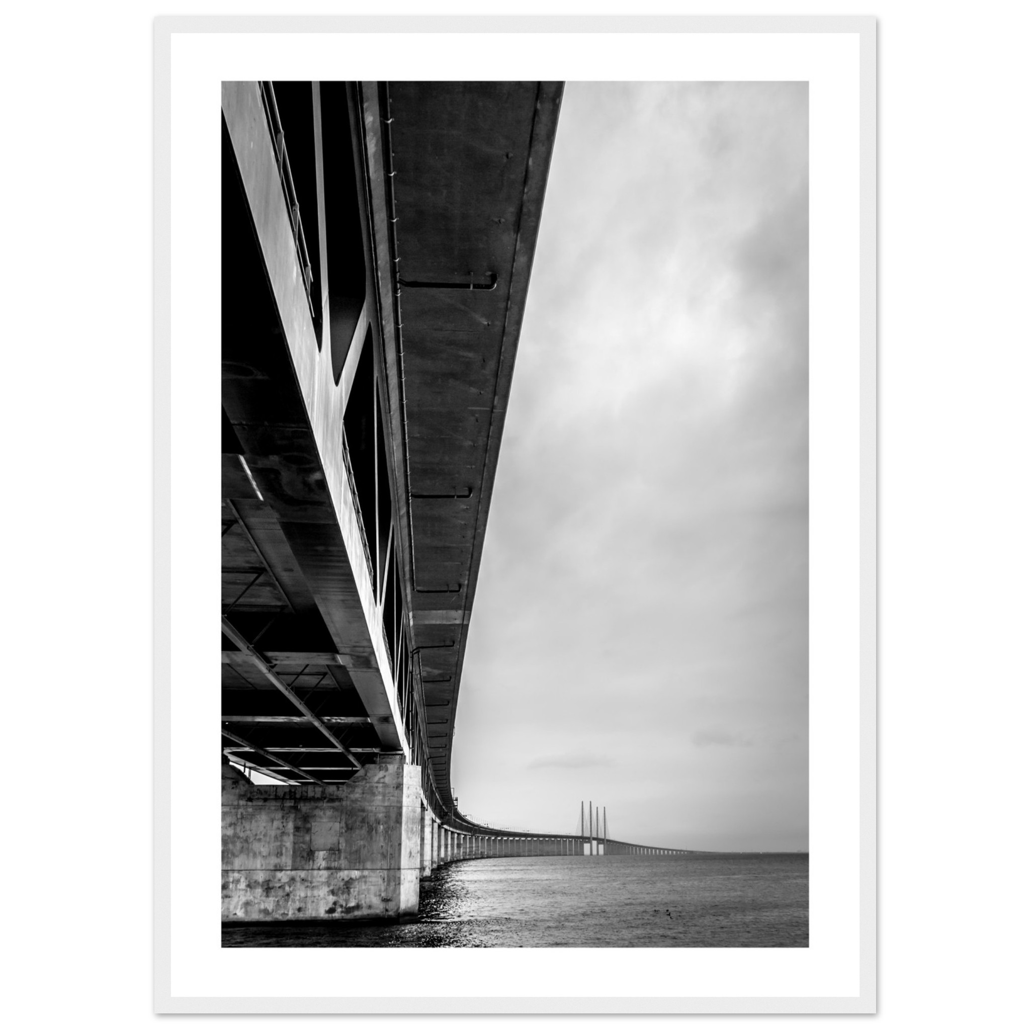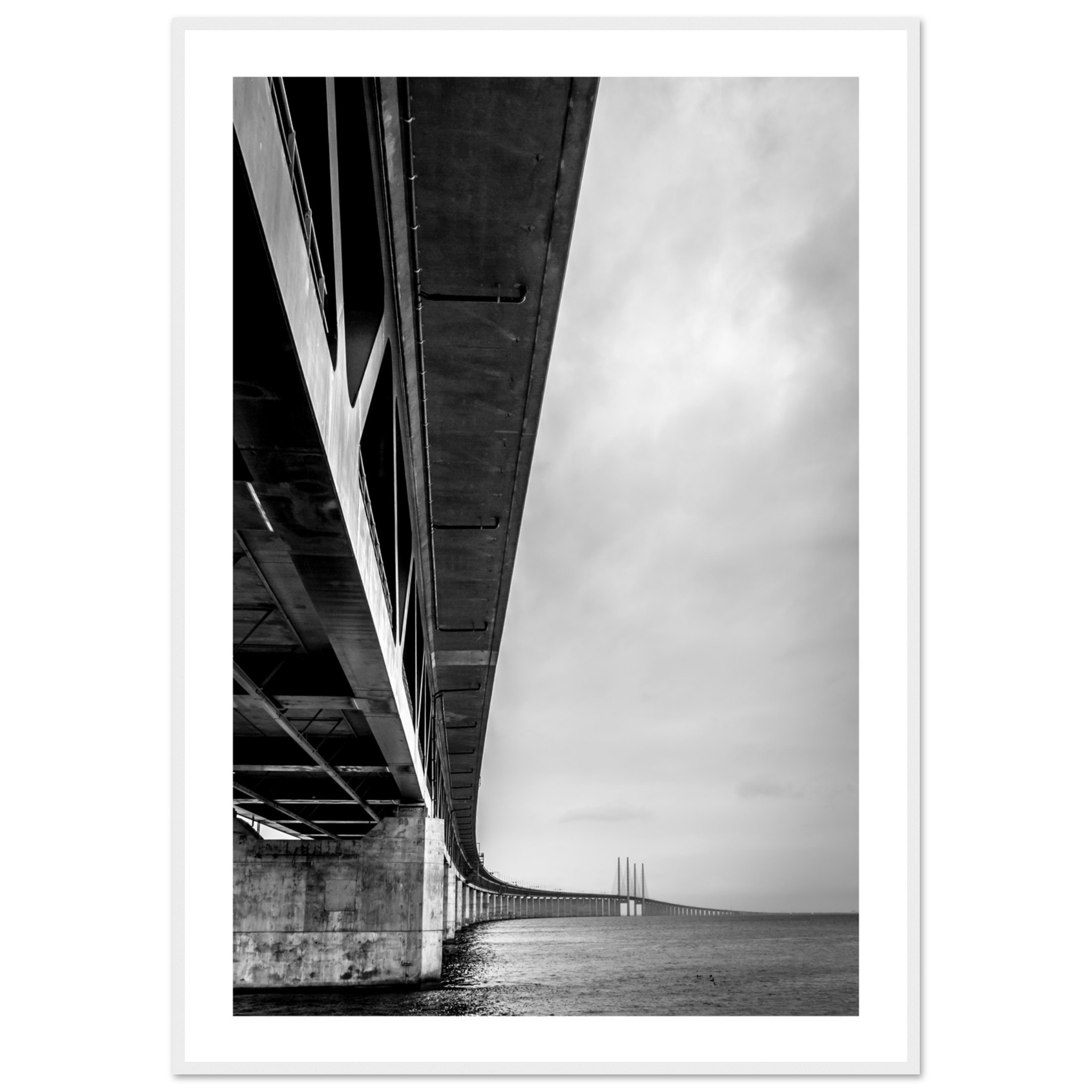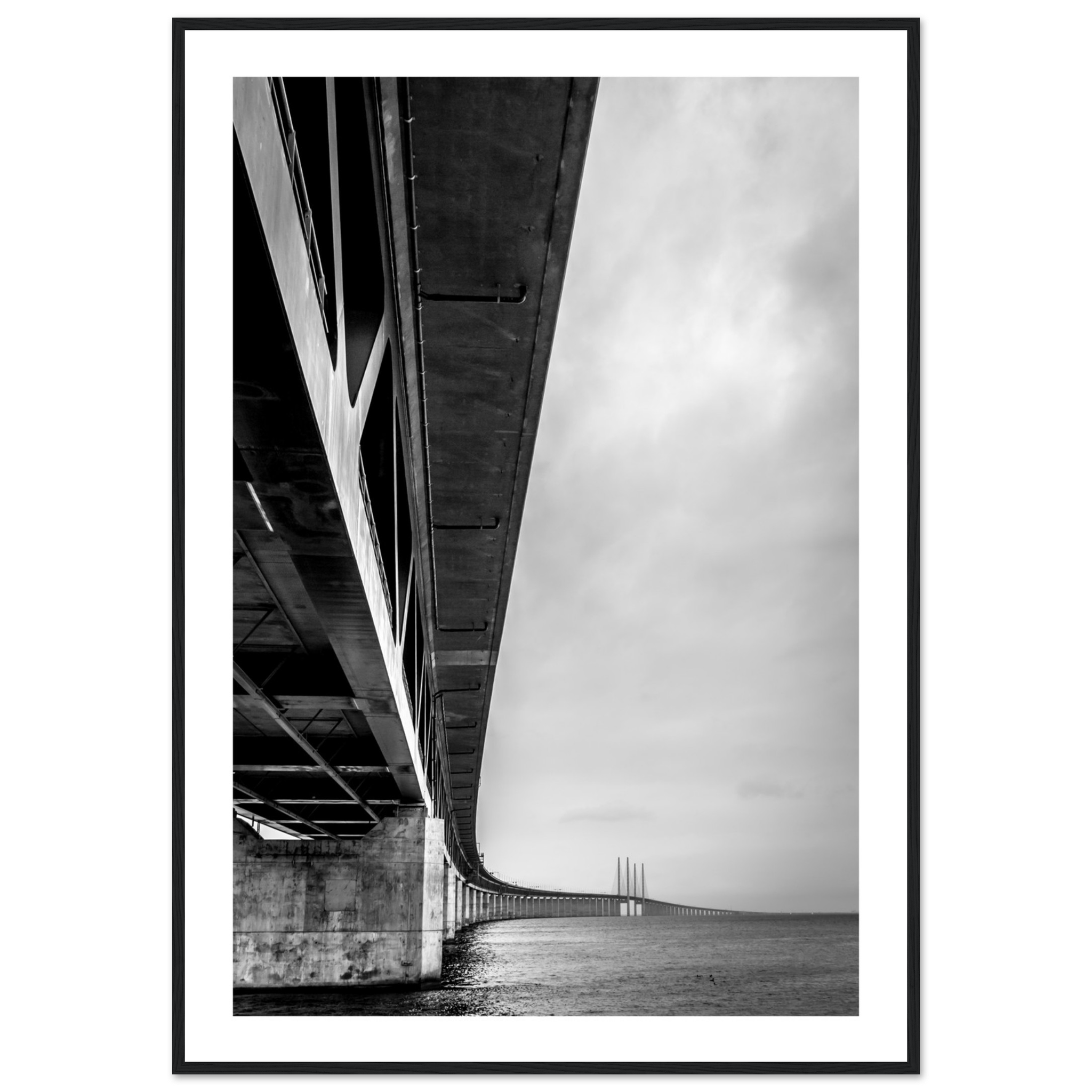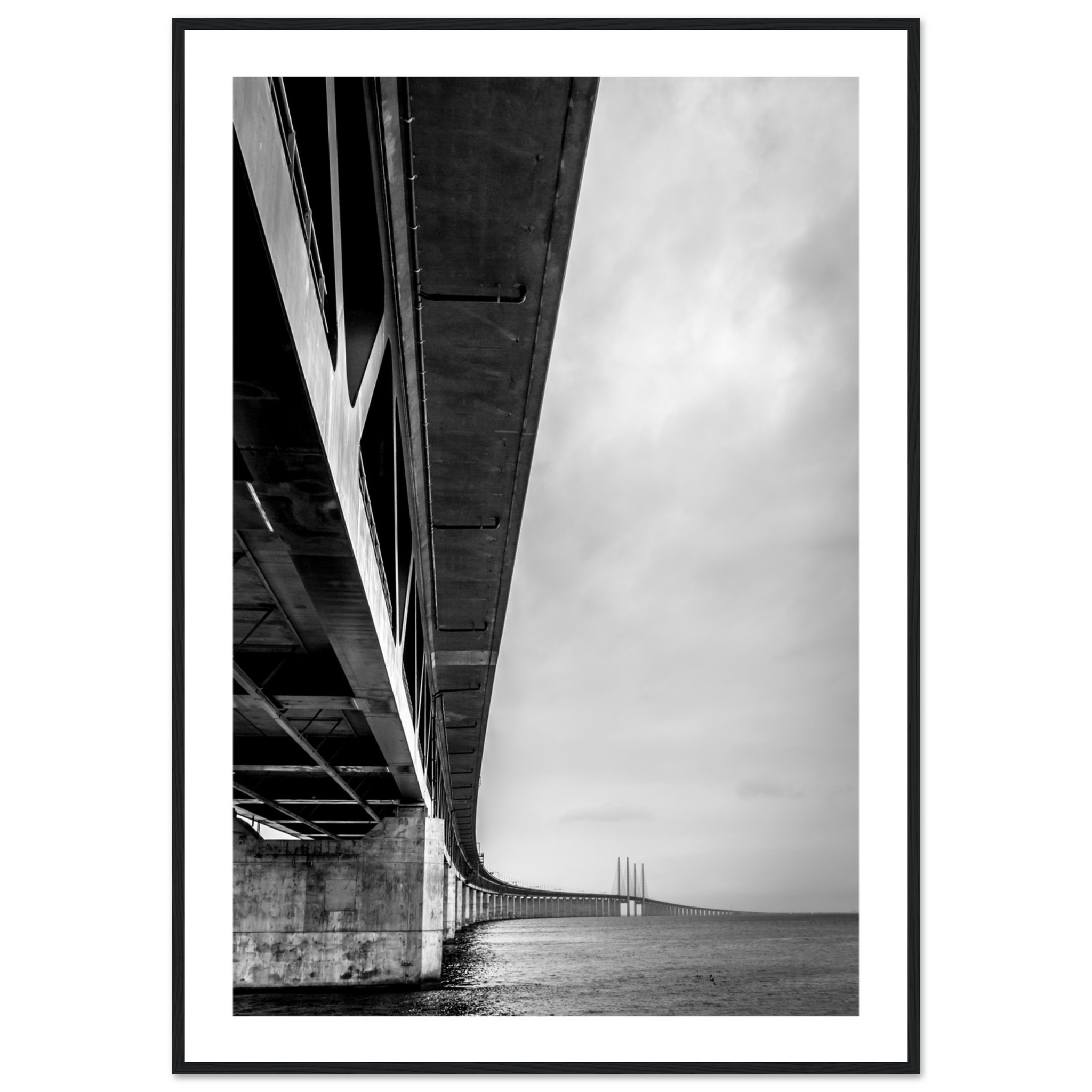 Detta svartvita fotografi presenterar den imponerande och ikoniska Öresundsbron, som med sin majestätiska struktur förbinder Sverige och Danmark. Bilden fångar brons långa svep över det lugna havet, med en dramatisk himmel som bakgrund. Den här fotot erbjuder en minimalistisk och ändå kraftfull hyllning till skandinavisk design och ingenjörskonst och är ett måste för alla som uppskattar moderna arkitektoniska underverk.