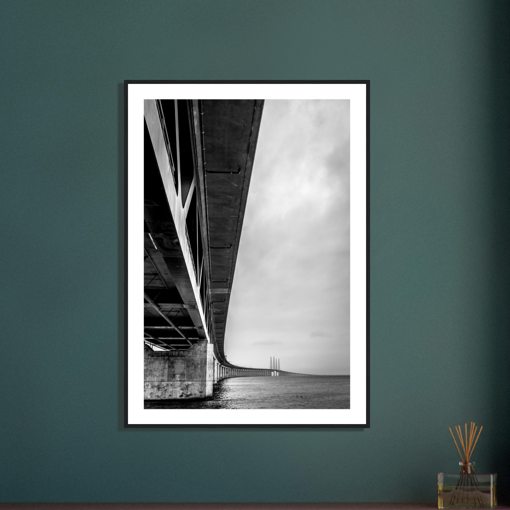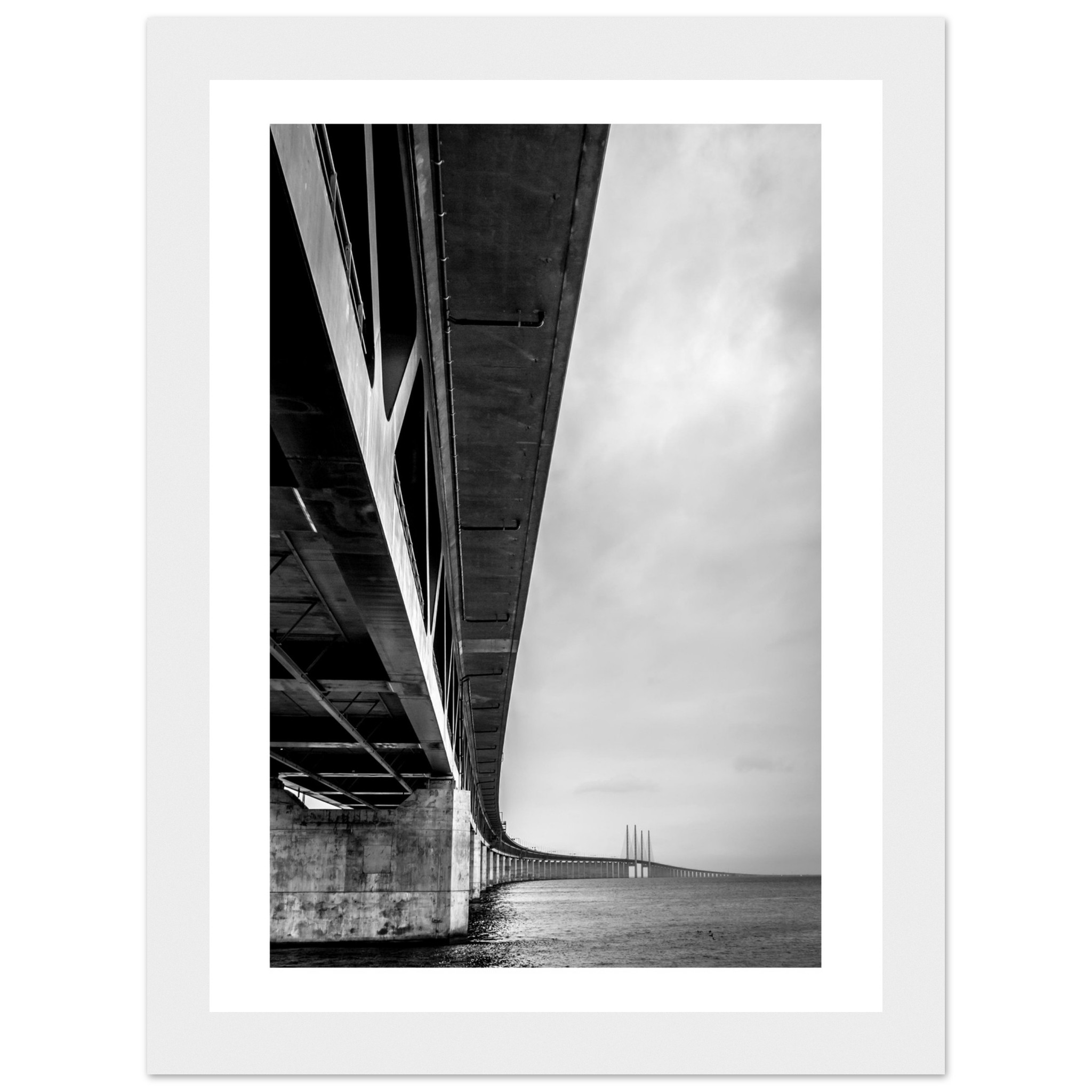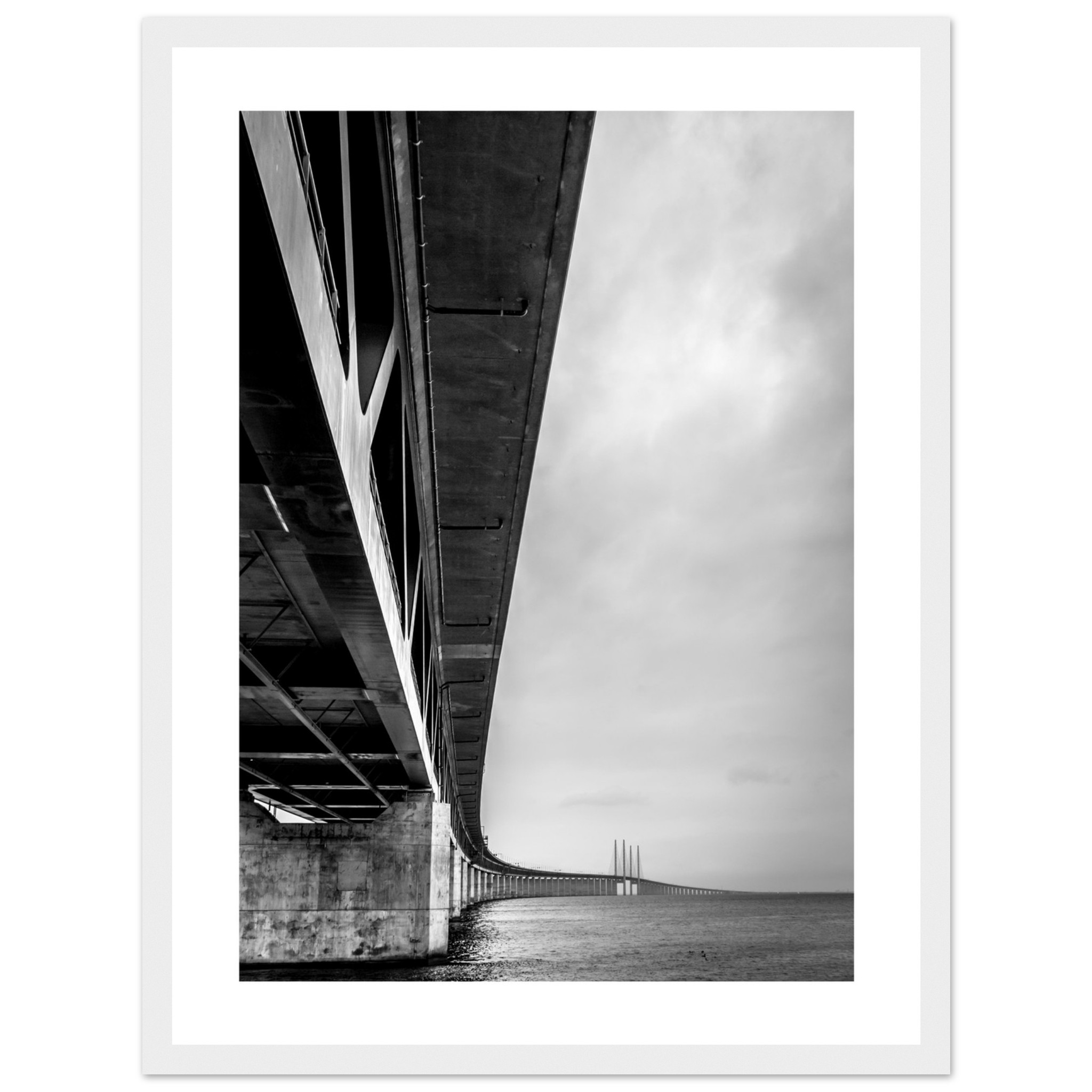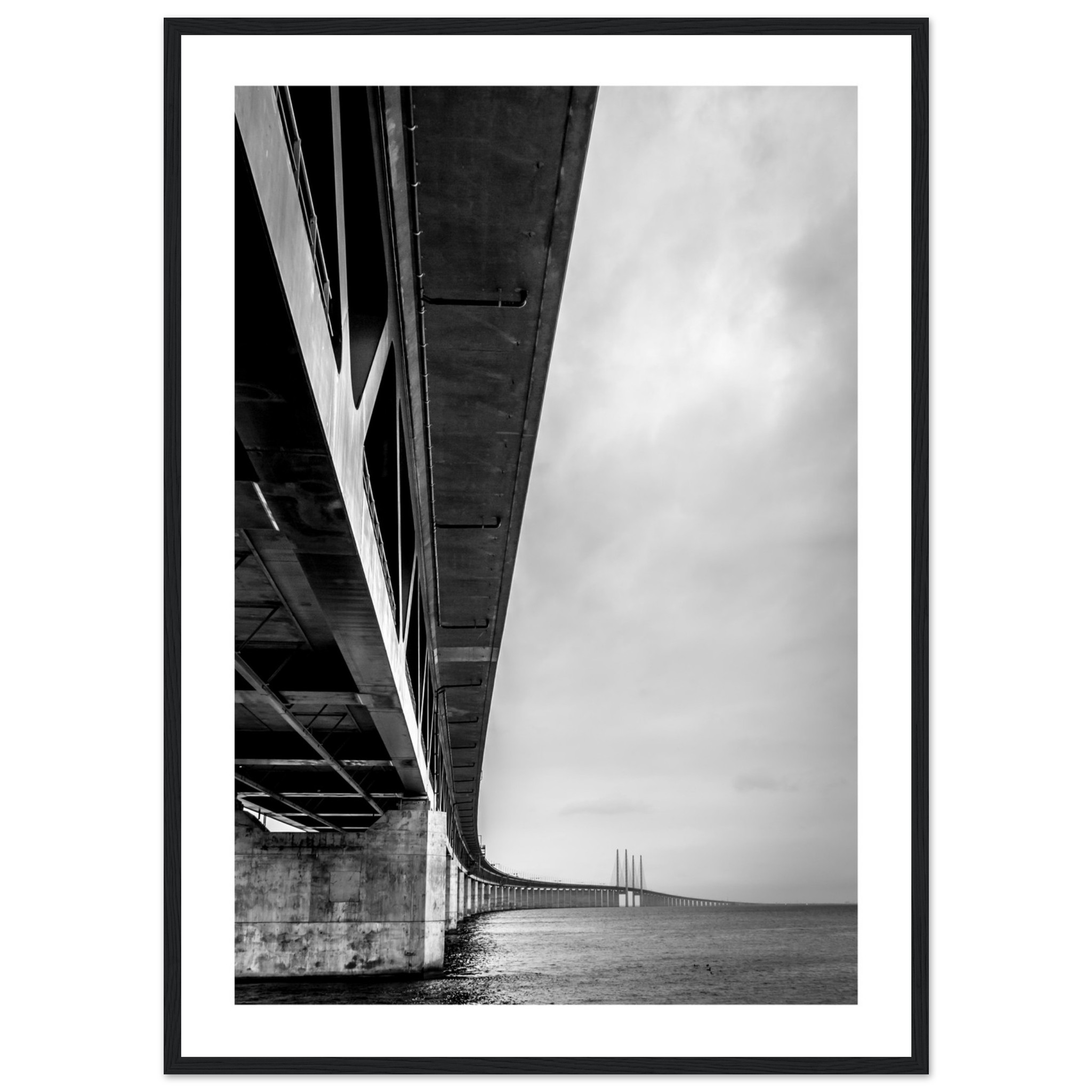 Detta svartvita fotografi presenterar den imponerande och ikoniska Öresundsbron, som med sin majestätiska struktur förbinder Sverige och Danmark. Bilden fångar brons långa svep över det lugna havet, med en dramatisk himmel som bakgrund. Den här fotot erbjuder en minimalistisk och ändå kraftfull hyllning till skandinavisk design och ingenjörskonst och är ett måste för alla som uppskattar moderna arkitektoniska underverk.