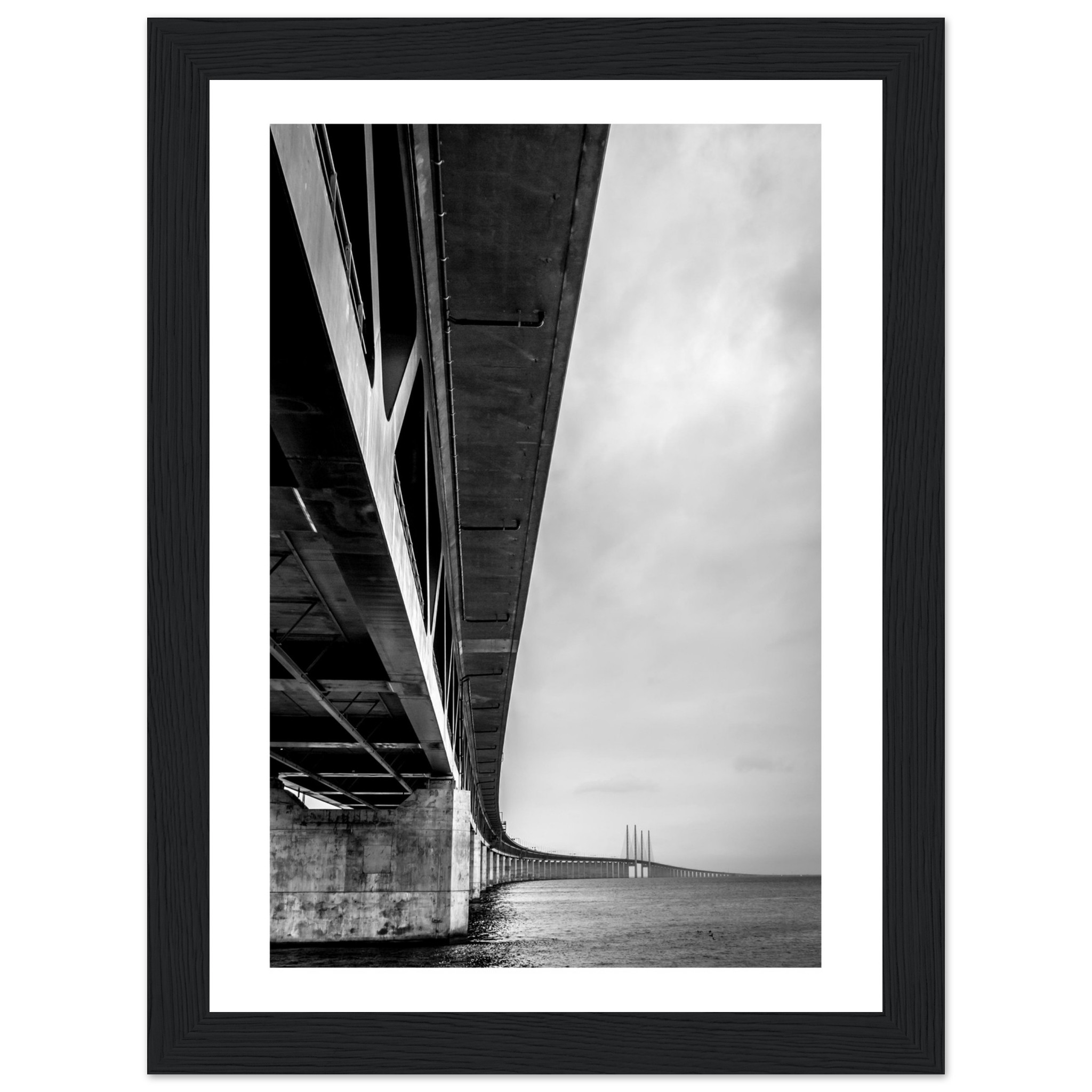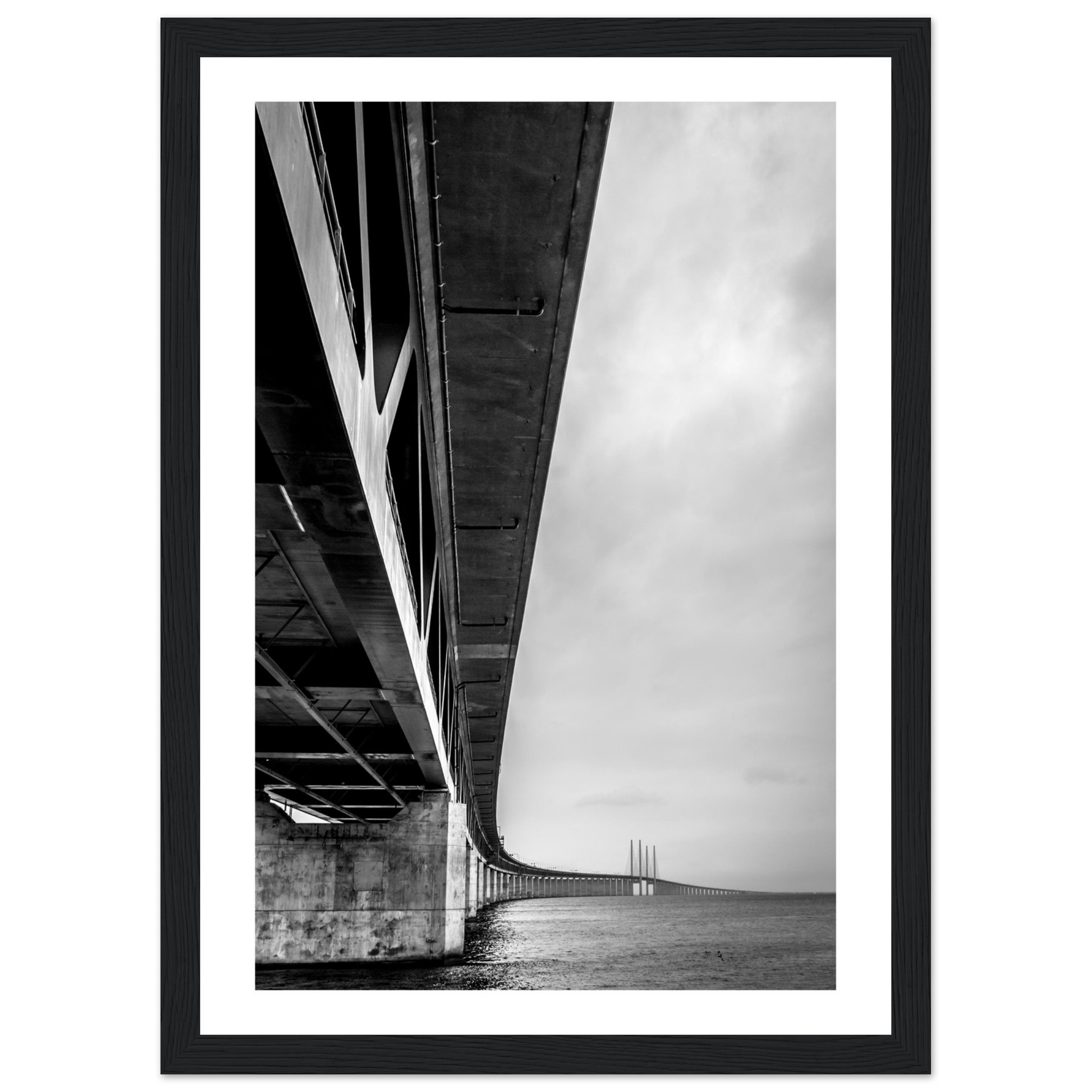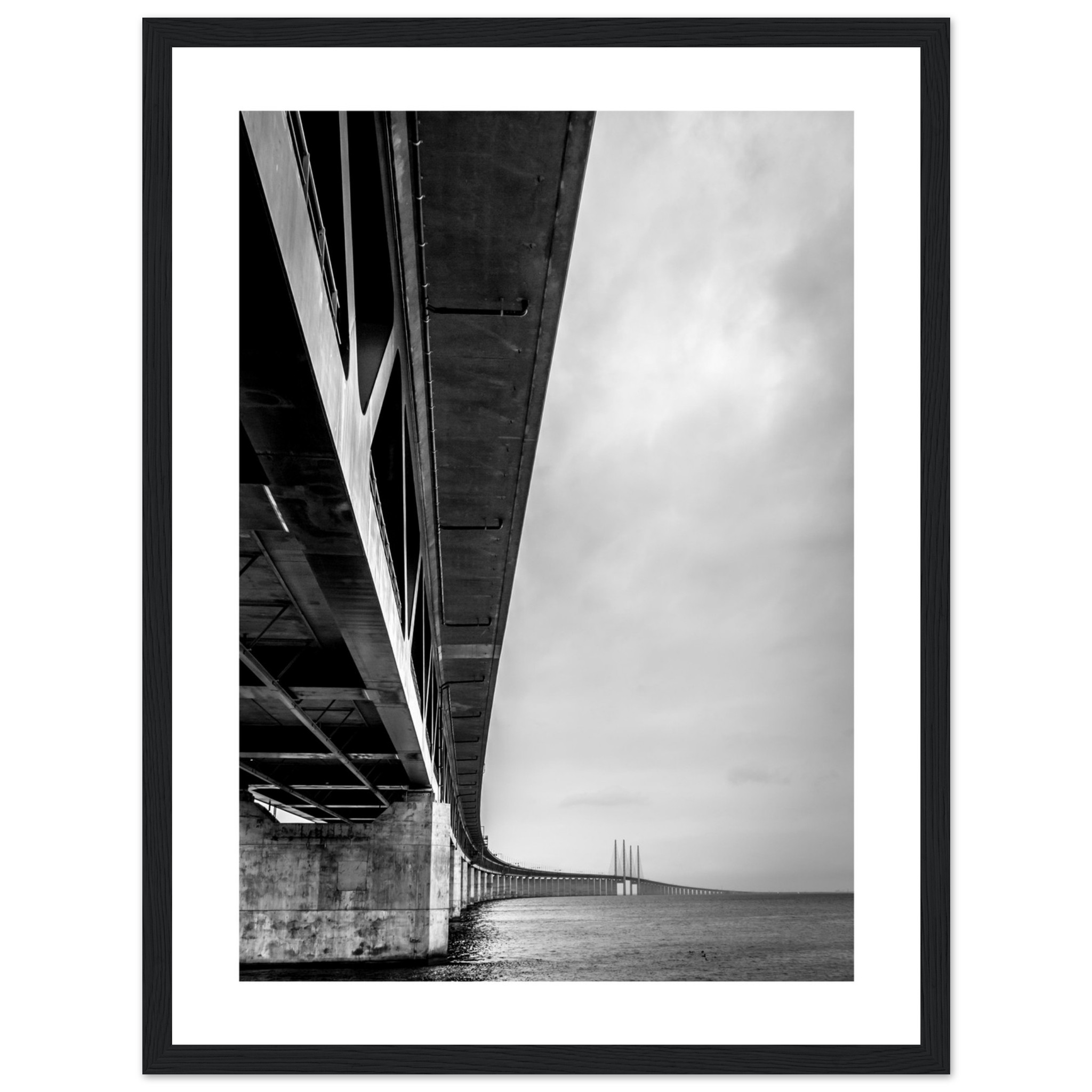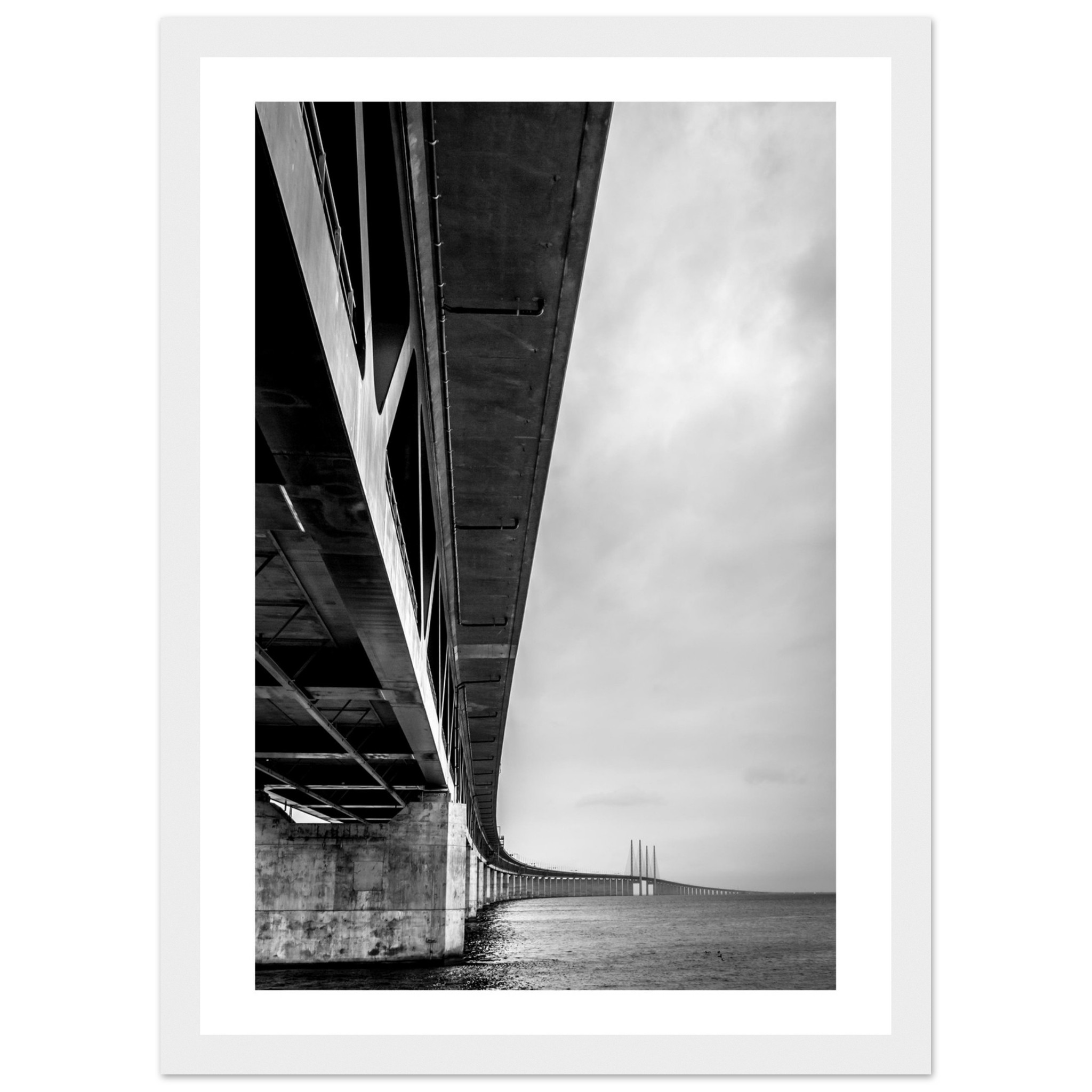 Detta svartvita fotografi presenterar den imponerande och ikoniska Öresundsbron, som med sin majestätiska struktur förbinder Sverige och Danmark. Bilden fångar brons långa svep över det lugna havet, med en dramatisk himmel som bakgrund. Den här fotot erbjuder en minimalistisk och ändå kraftfull hyllning till skandinavisk design och ingenjörskonst och är ett måste för alla som uppskattar moderna arkitektoniska underverk.