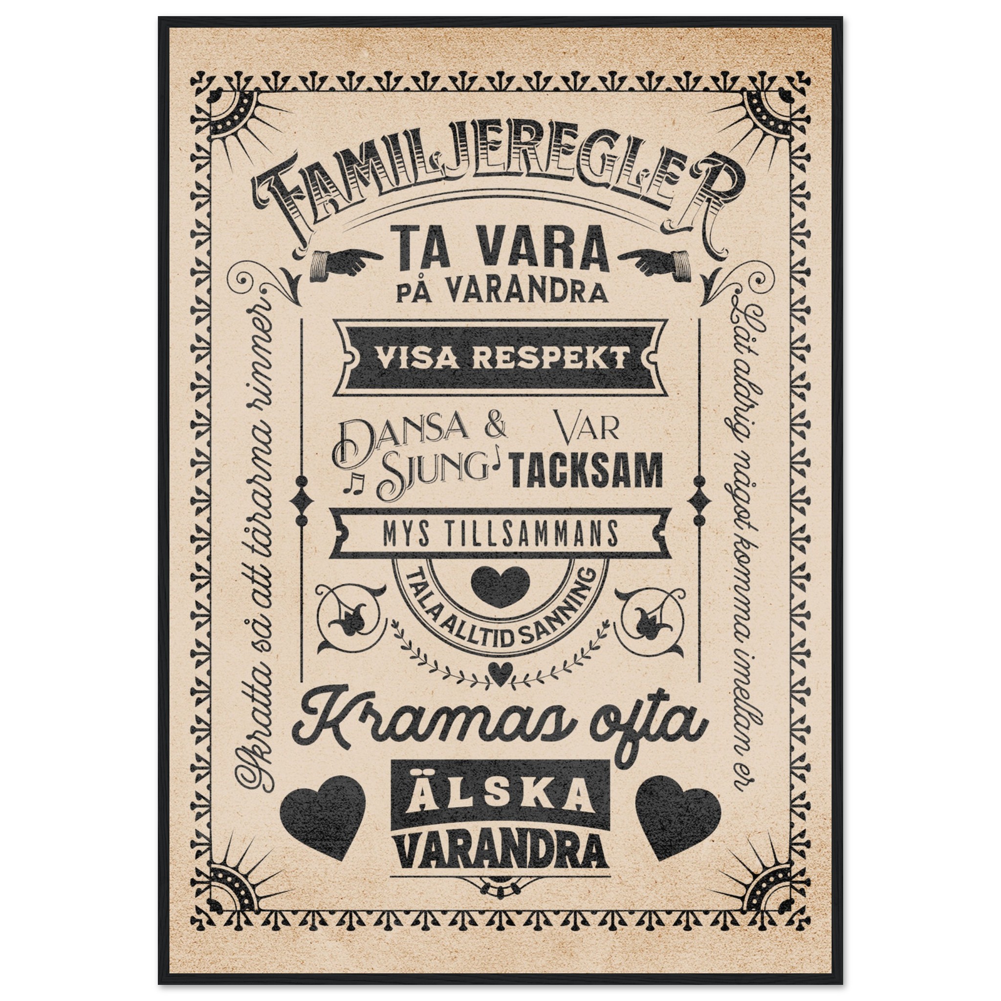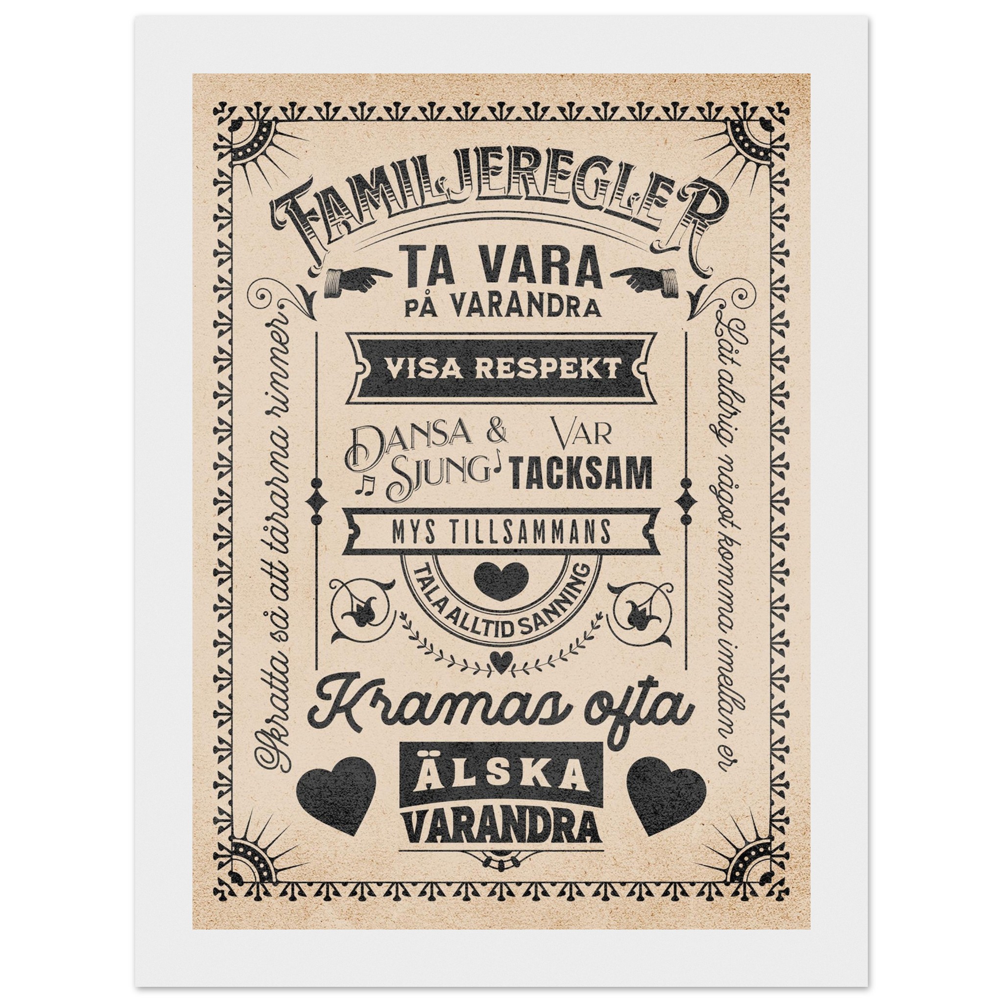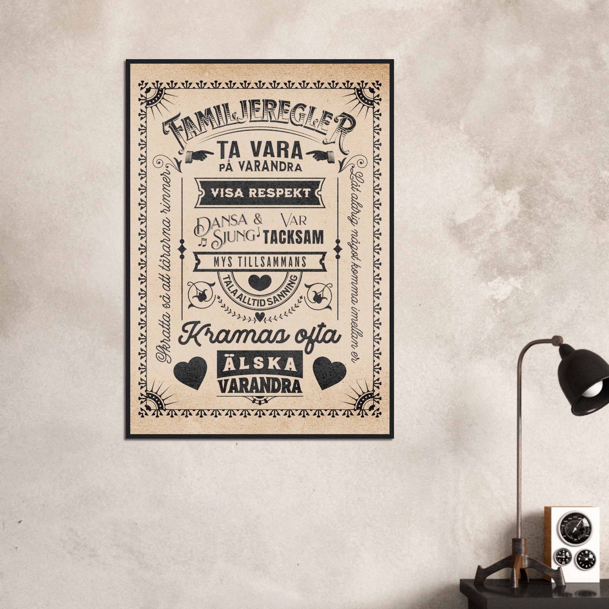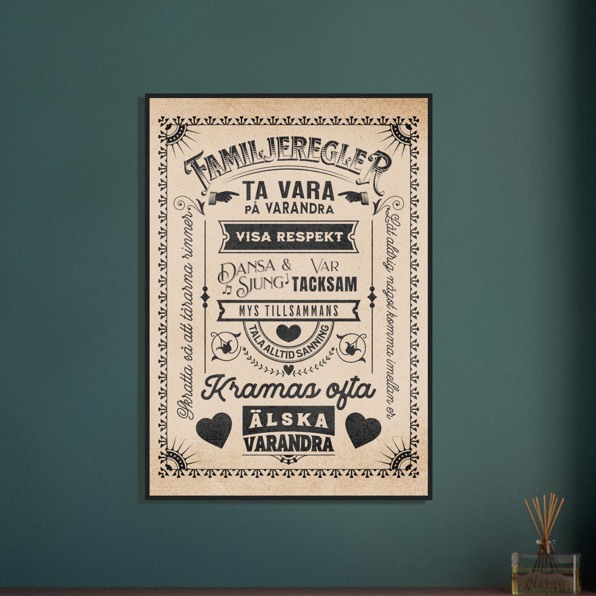 Många av oss bär dessa grundläggande familjeregler i hjärtat, men ibland behöver vi en vacker påminnelse på väggen. Denna poster är designad i en retro/vintage-stil och innehåller tidlösa regler som ”Älska varandra”, ”Visa respekt” och ”Ta vara på varandra”. Ett perfekt tillskott för att sprida värme och kärlek i ditt hem.