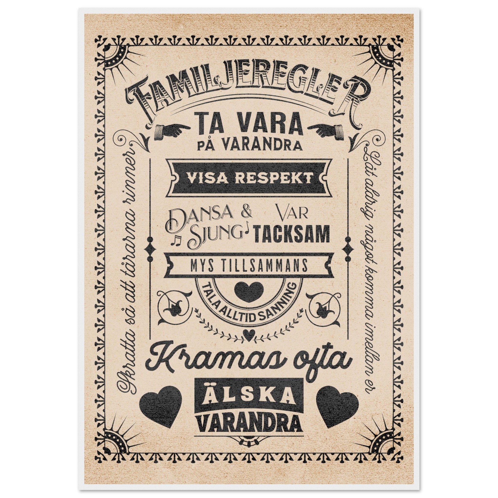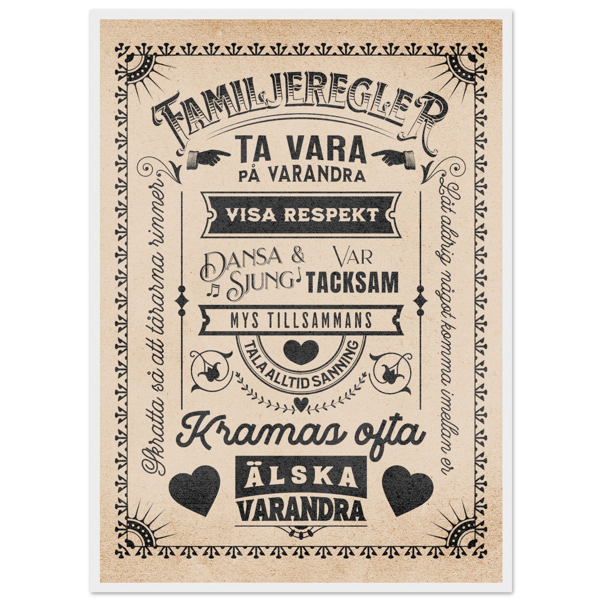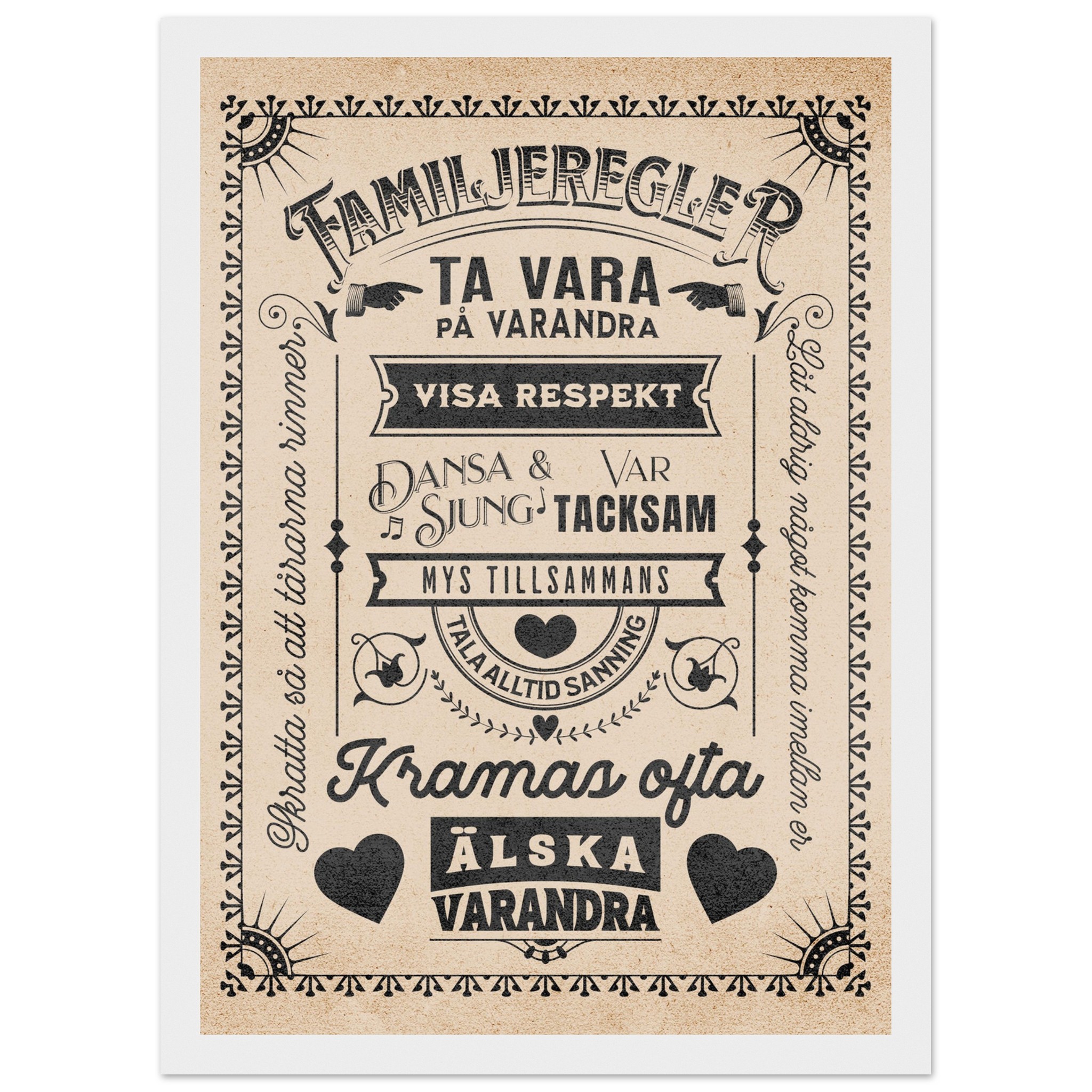 Många av oss bär dessa grundläggande familjeregler i hjärtat, men ibland behöver vi en vacker påminnelse på väggen. Denna poster är designad i en retro/vintage-stil och innehåller tidlösa regler som ”Älska varandra”, ”Visa respekt” och ”Ta vara på varandra”. Ett perfekt tillskott för att sprida värme och kärlek i ditt hem.