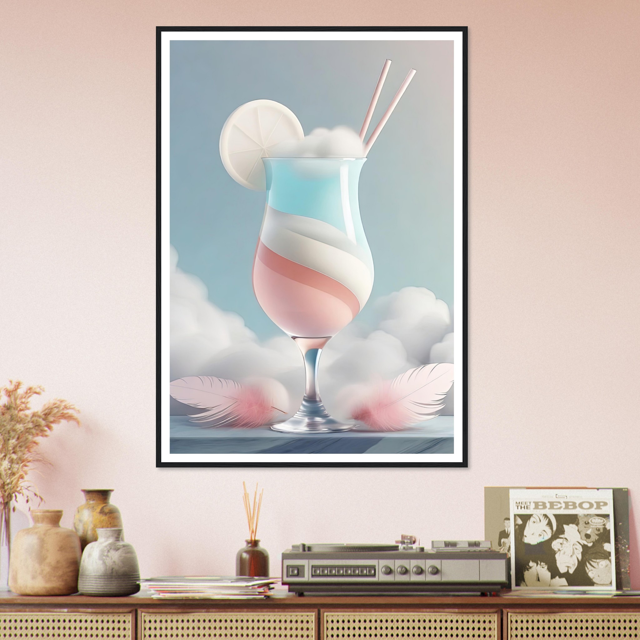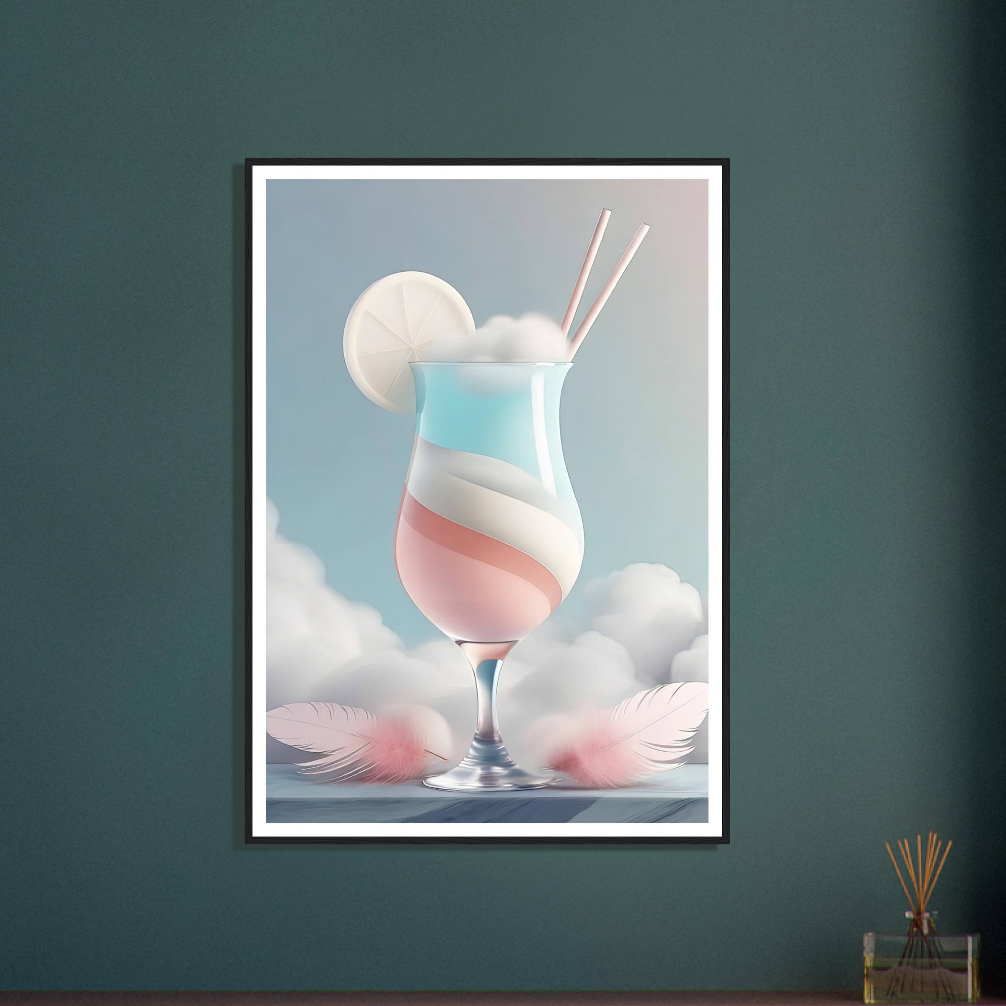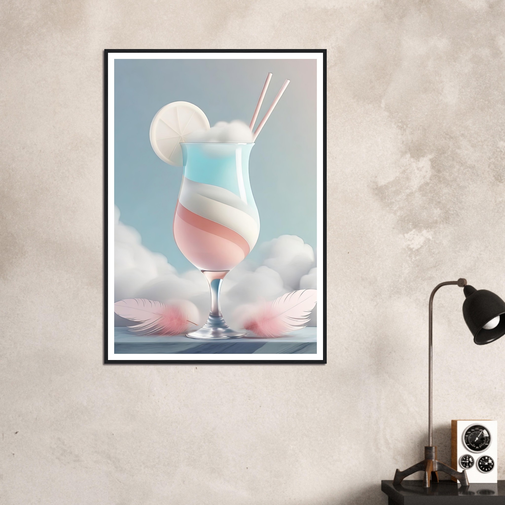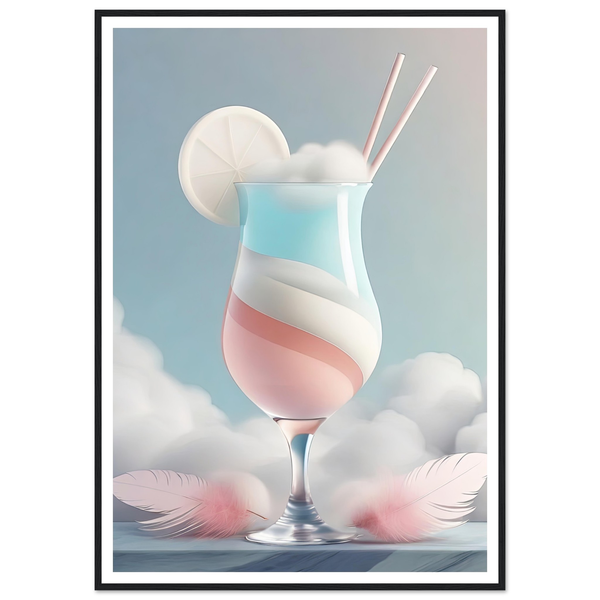 Denna färdiginramade tavla med namnet ”Himmelsk Cocktail” tar betraktaren till en värld av viktlöshet och ljuv njutning. Den avbildar ett stilfullt cocktailglas fylld med skikt av pastellfärgade drycker, toppad med en skiva av vad som verkar vara en citrusfrukt och serverad med två eleganta sugrör. Detta drömlika konstverk är som en frisk fläkt för sinnena, inbjudande till avslappning och dagdrömmeri. De flytande fjädrarna som omger glaset antyder en känsla av flykt och frihet, som om drycken själv vore en portal till en lugnare värld bortom våra egna. En perfekt inredningsdetalj för den som vill tillföra en touch av serenitet och sofistikering till ditt hem eller kontor. Den subtila kontrasten mellan glasets skärpa och fjädrarnas mjukhet gör detta till en oemotståndlig visuell upplevelse.