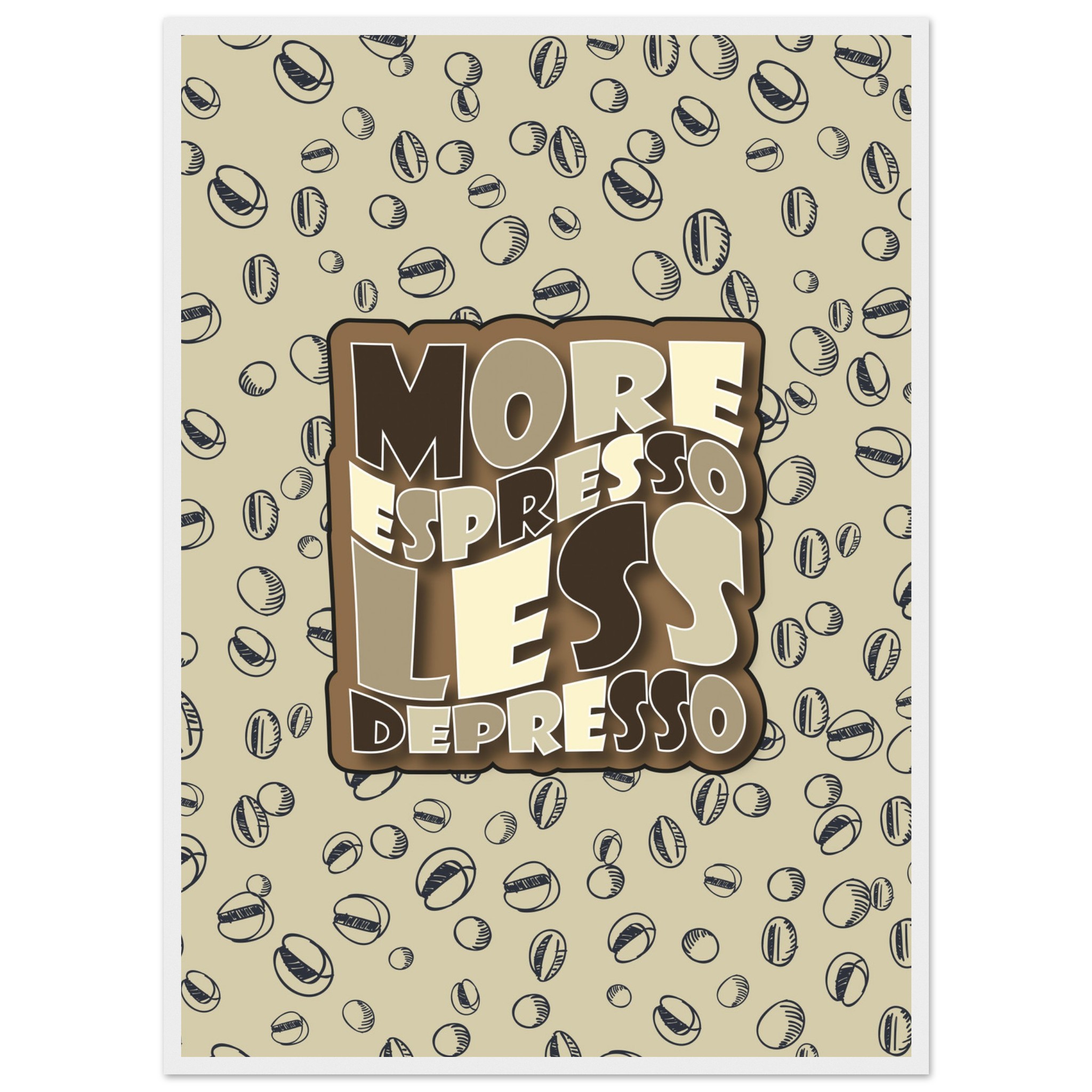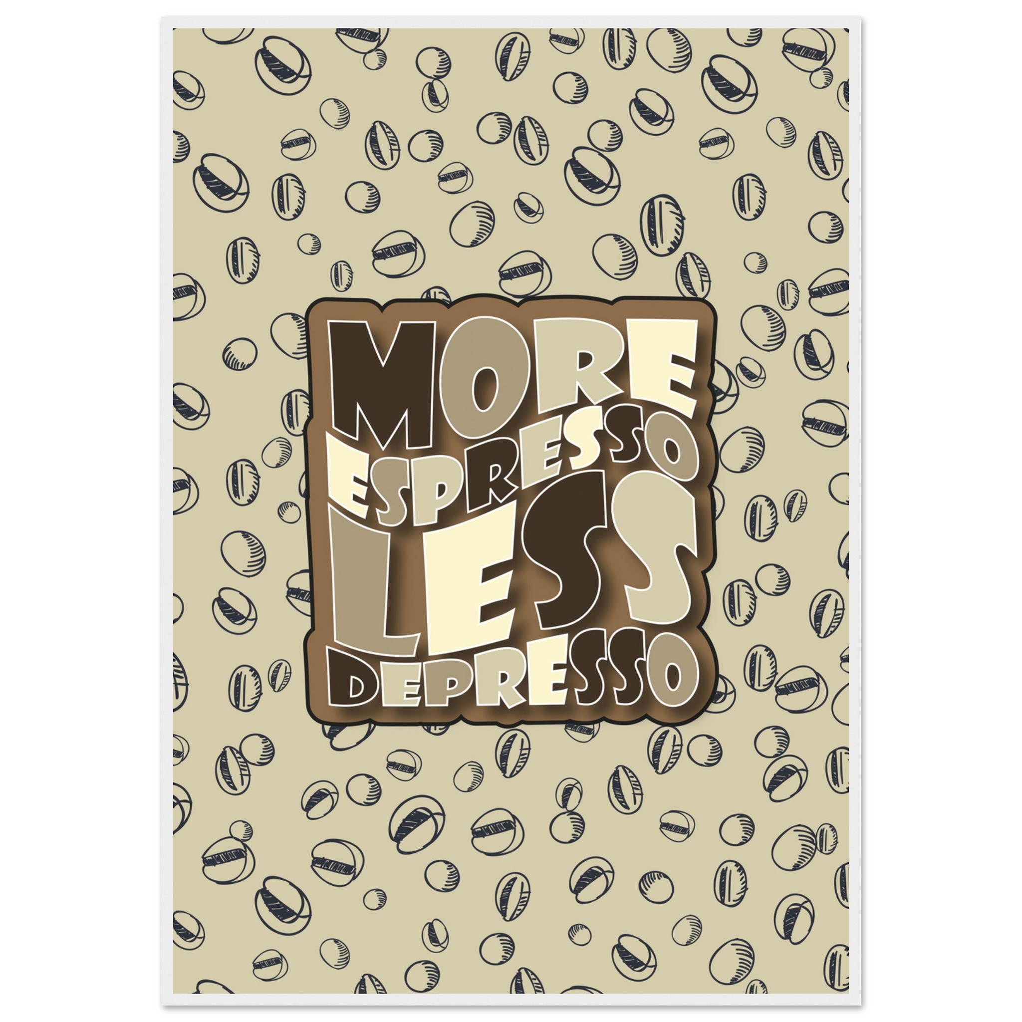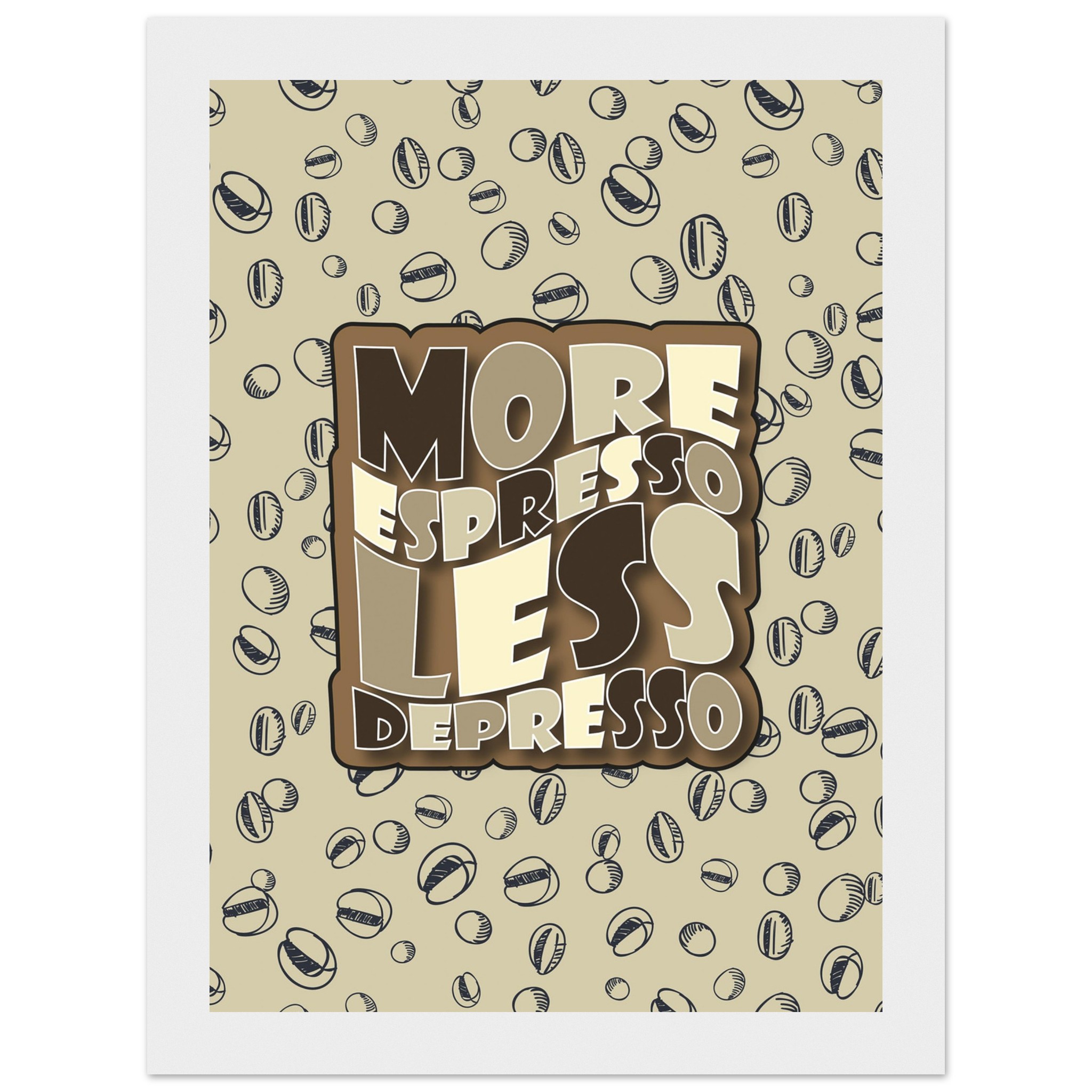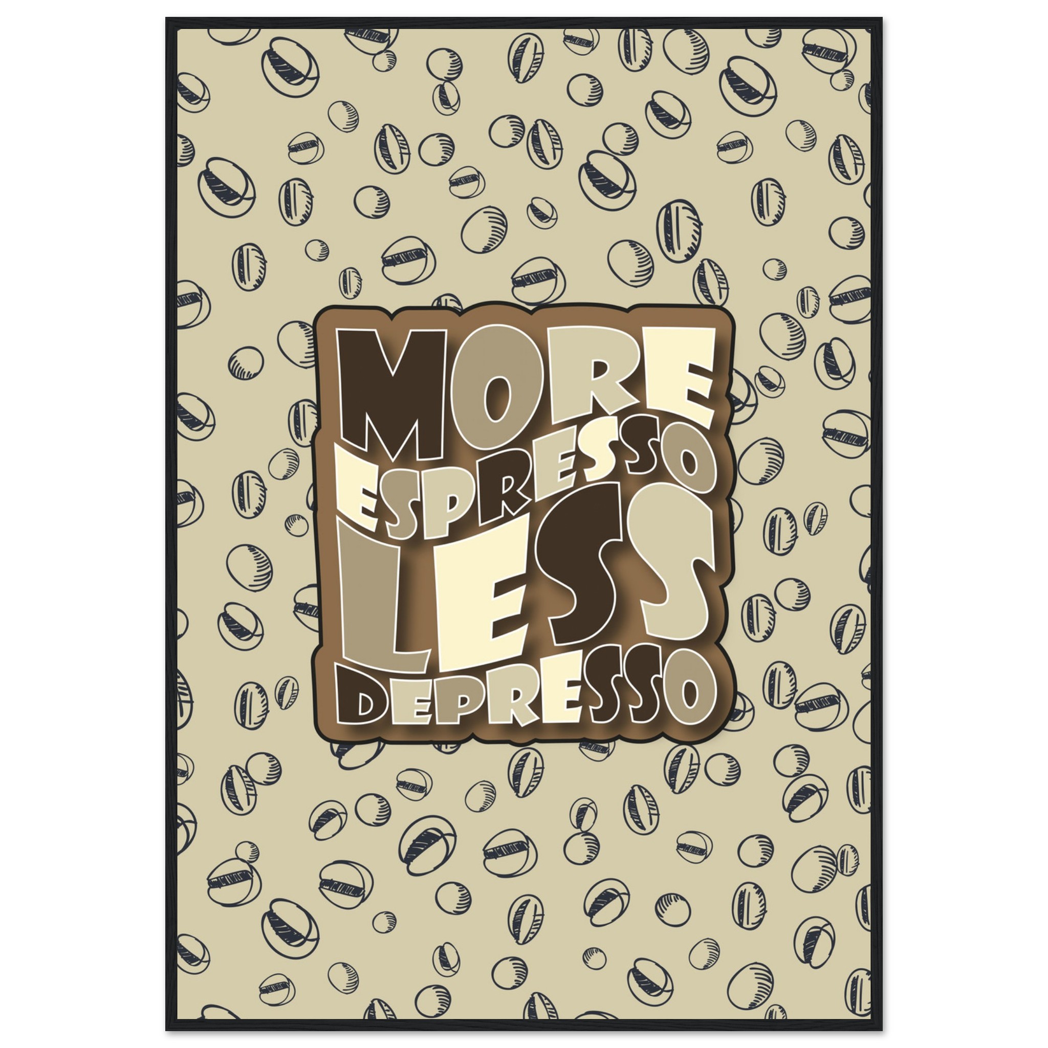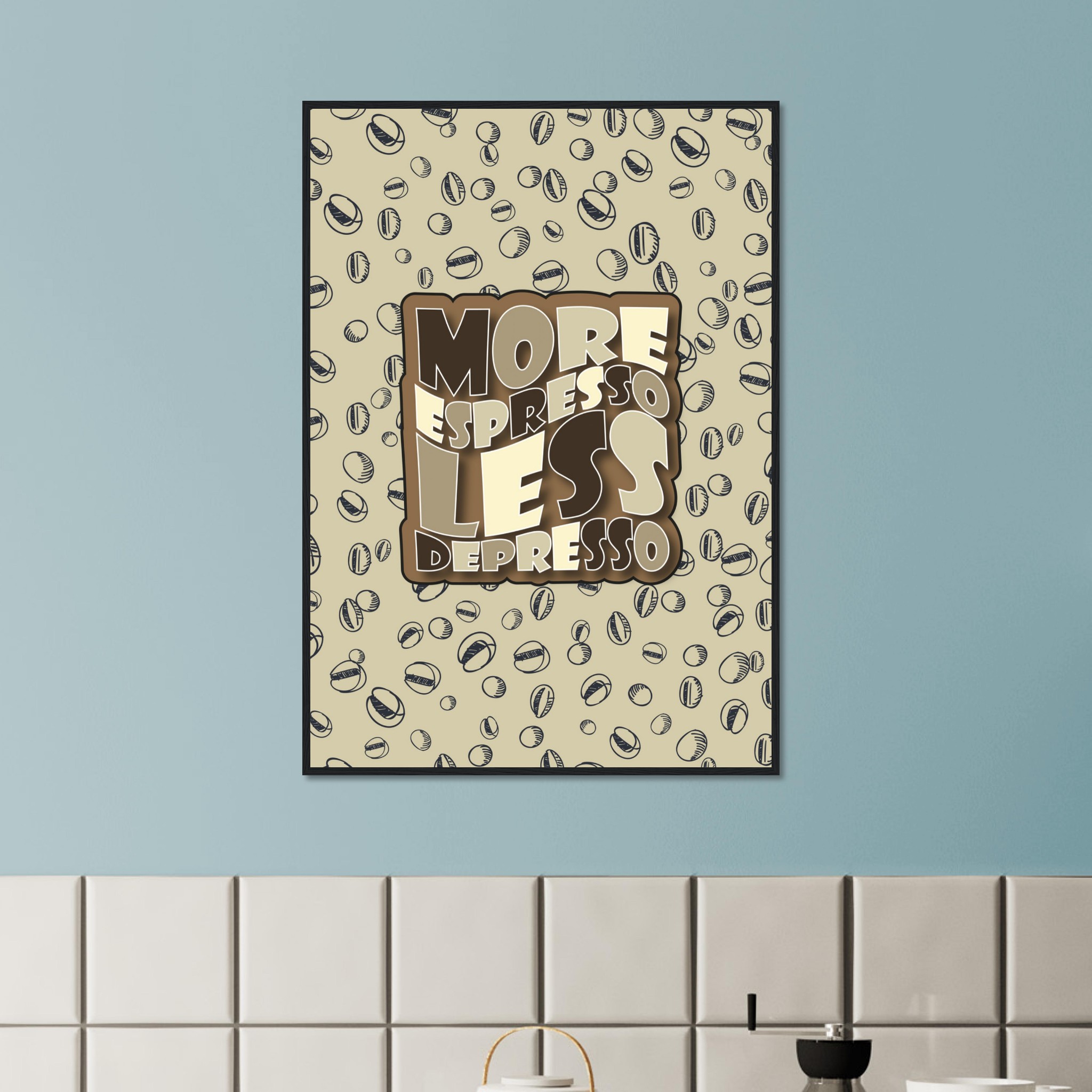 Denna inspirerande och humoristiska affisch presenterar ordleken ”MORE ESPRESSO LESS DEPRESSO” i ett iögonfallande typsnitt med en kaffe-tematisk bakgrund. Den roliga frasen, som är en lekfull uppmaning till att uppskatta livets små glädjeämnen som en god kopp espresso, är placerad mot ett mönster av kaffebönor. Färgschemat är varmt och inbjudande, vilket skapar en mysig känsla. Detta är en perfekt väggdekoration för alla kaffeälskare och passar utmärkt i ett kök, ett café eller ett hemmakontor.