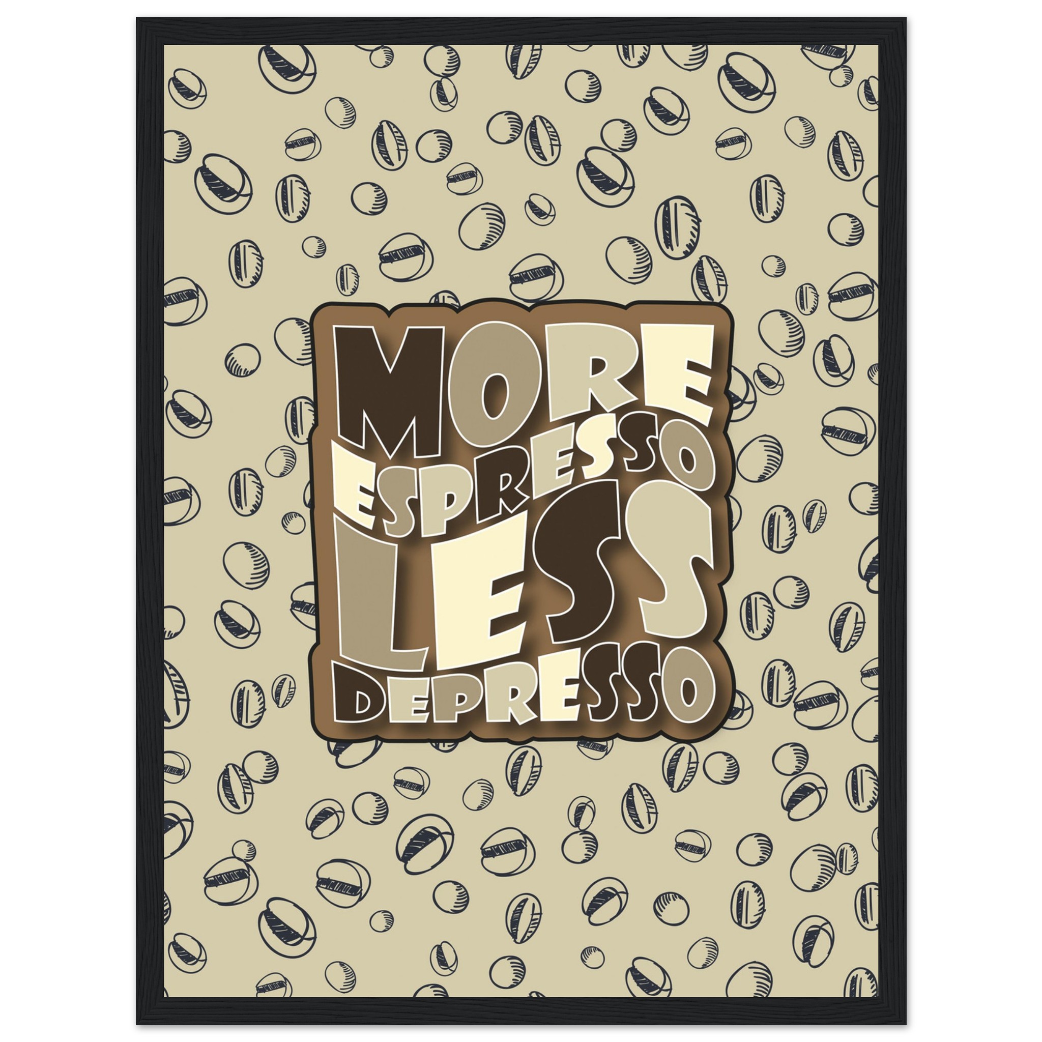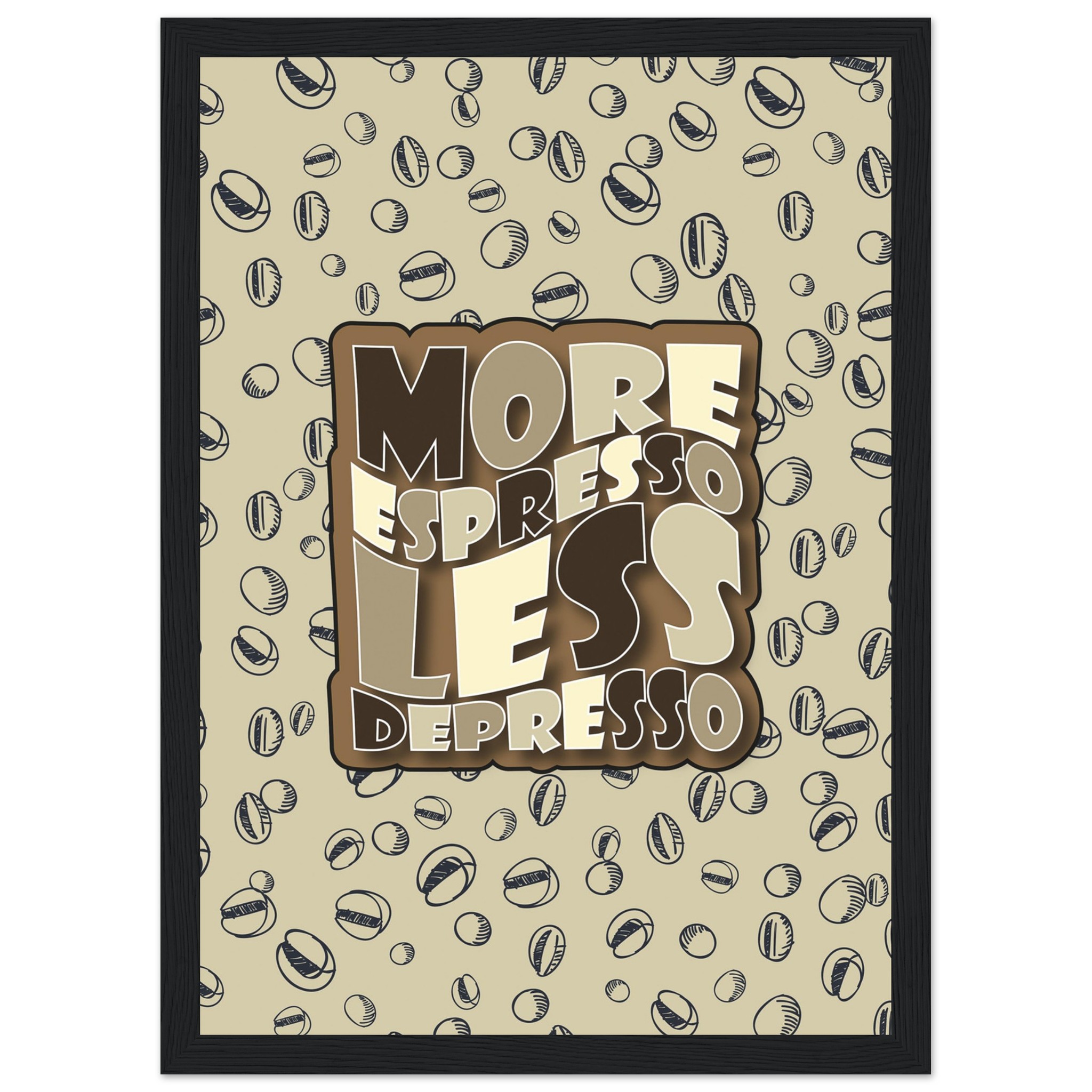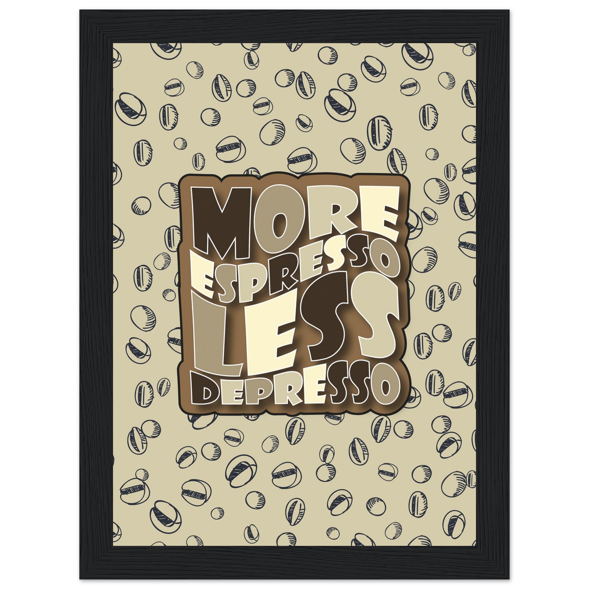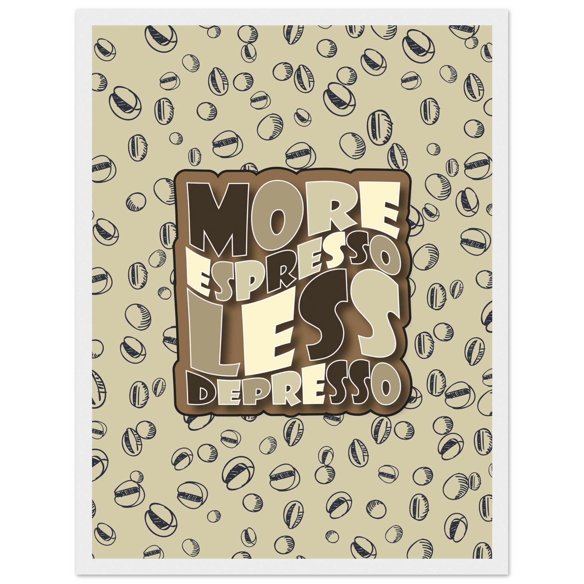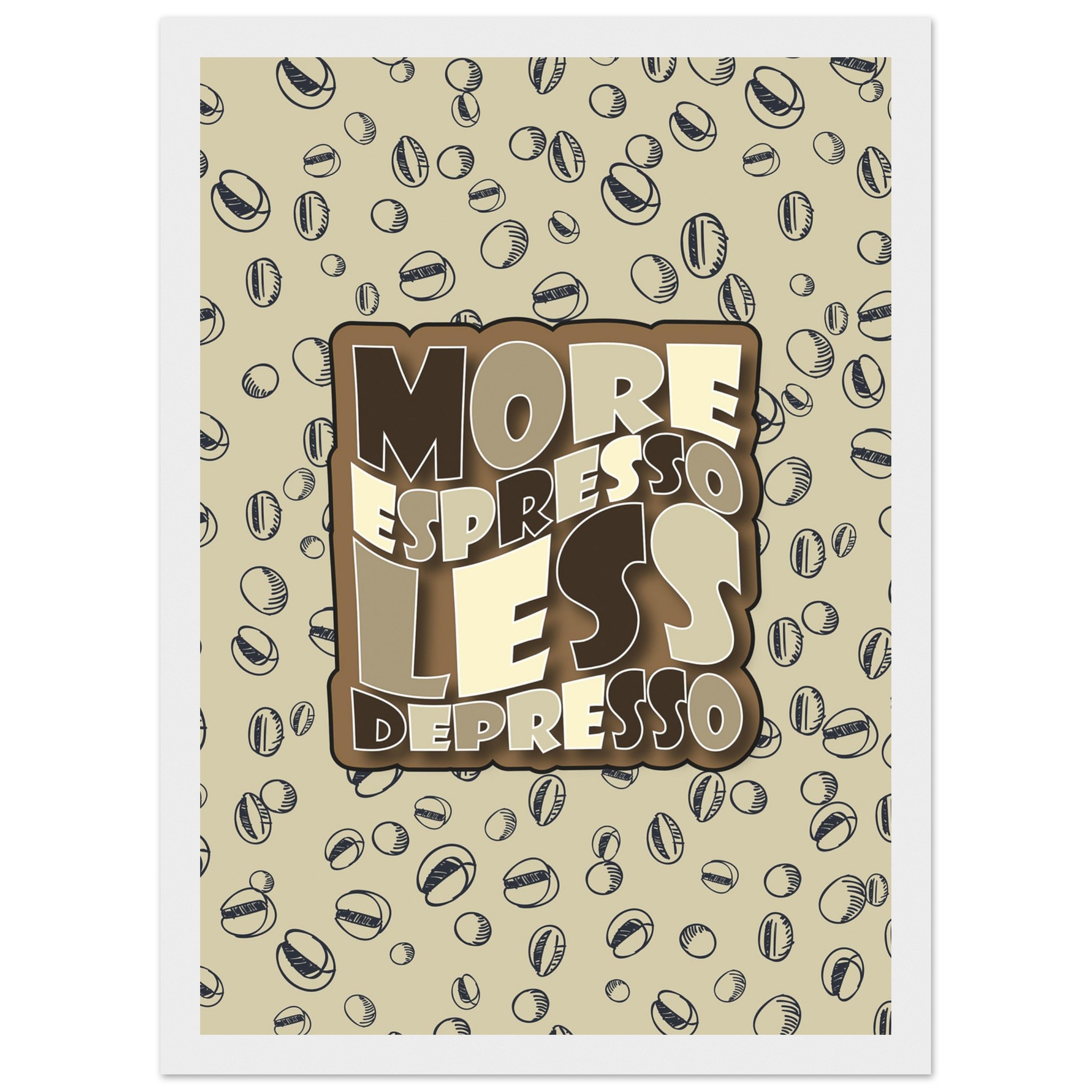 Denna inspirerande och humoristiska affisch presenterar ordleken ”MORE ESPRESSO LESS DEPRESSO” i ett iögonfallande typsnitt med en kaffe-tematisk bakgrund. Den roliga frasen, som är en lekfull uppmaning till att uppskatta livets små glädjeämnen som en god kopp espresso, är placerad mot ett mönster av kaffebönor. Färgschemat är varmt och inbjudande, vilket skapar en mysig känsla. Detta är en perfekt väggdekoration för alla kaffeälskare och passar utmärkt i ett kök, ett café eller ett hemmakontor.