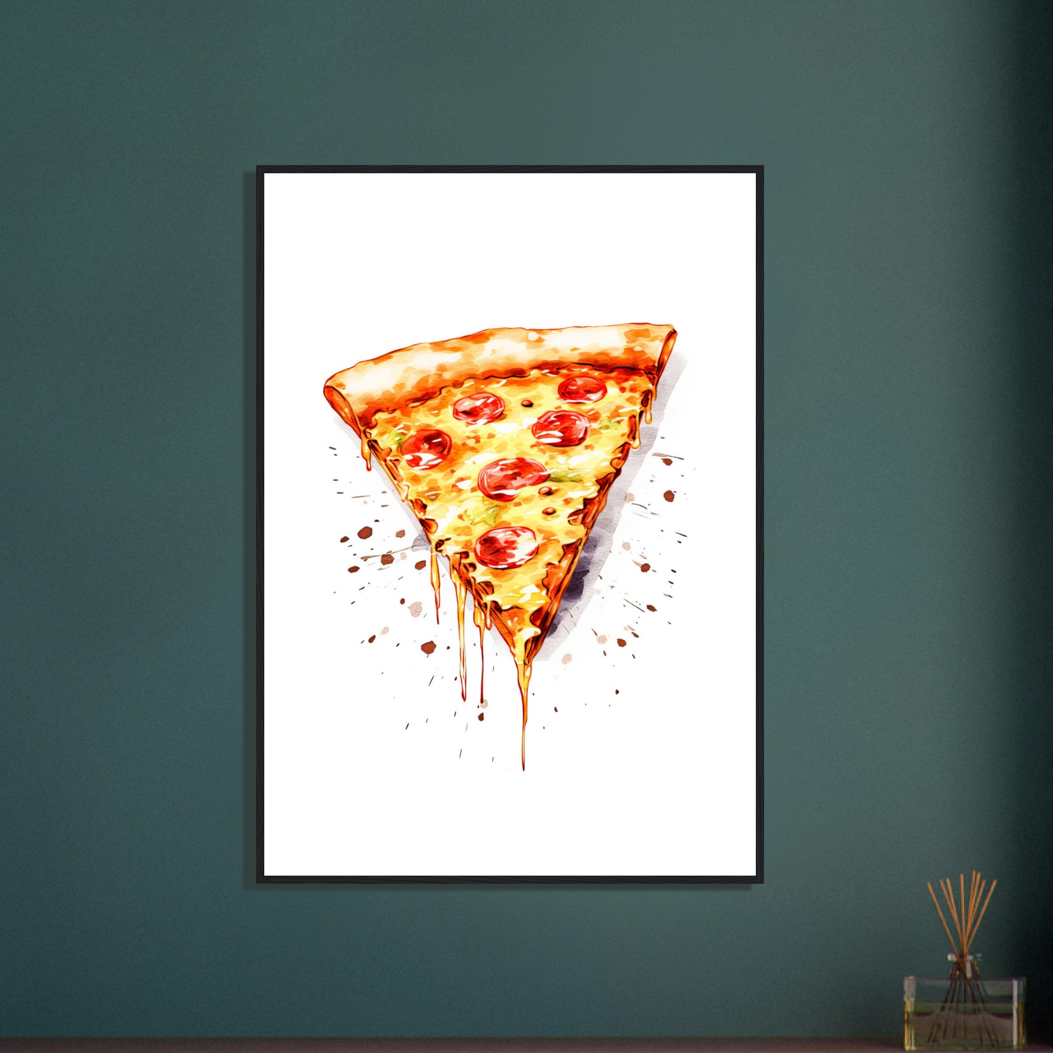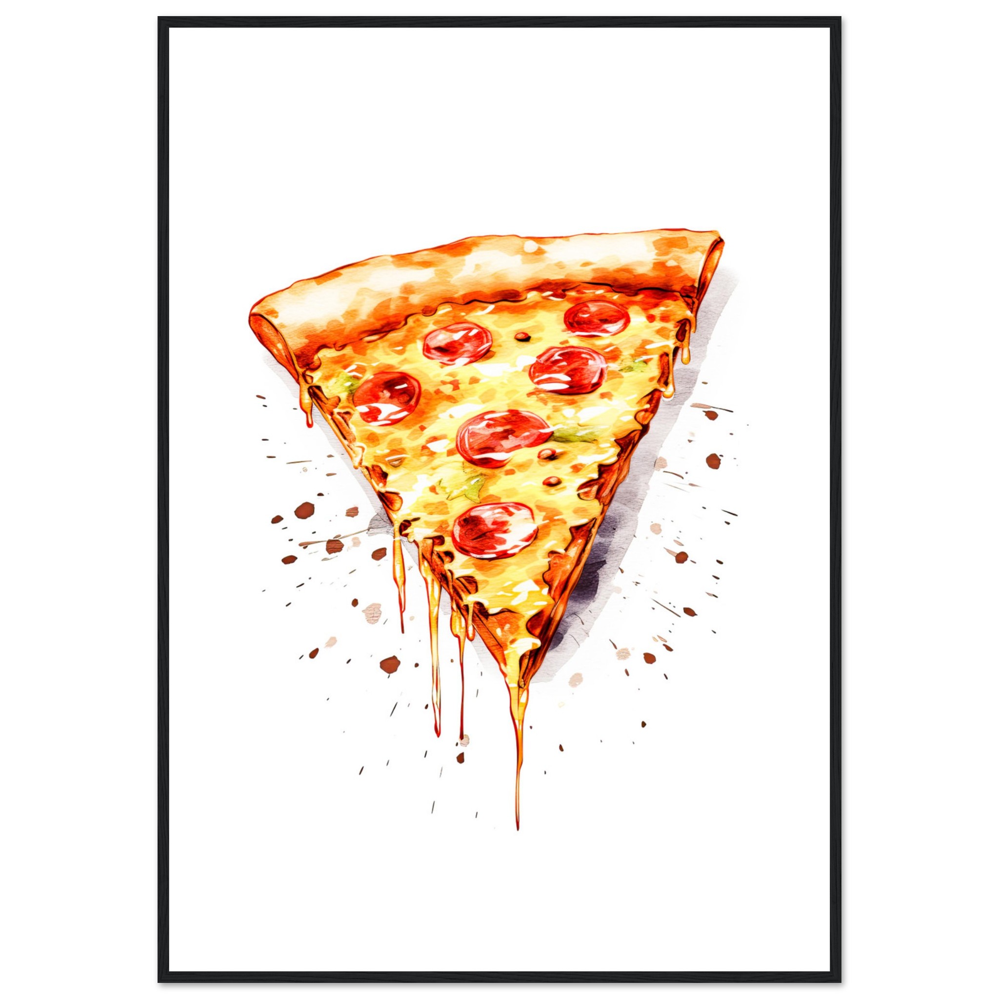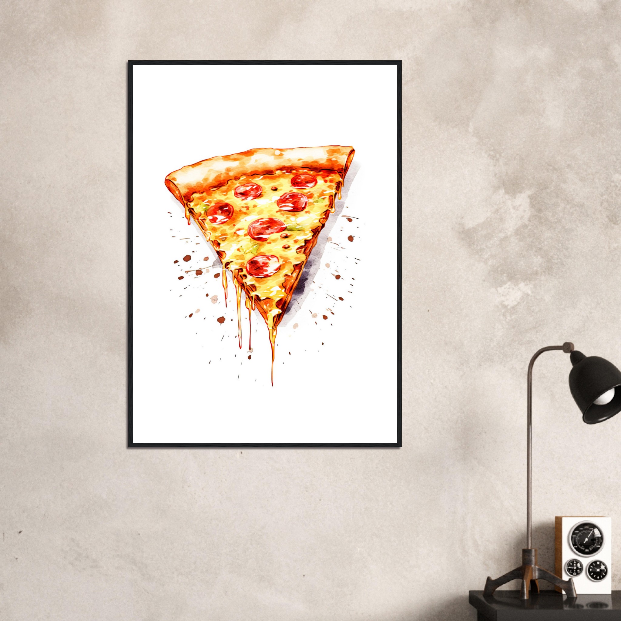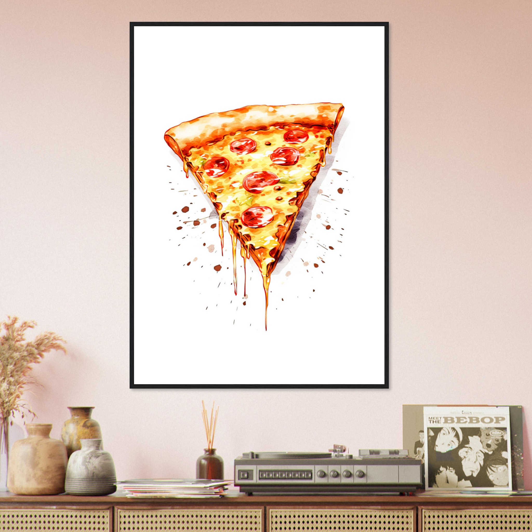 Denna snygga tavla kommer garanterat att göra dig sugen på en härlig pizza! Motivet föreställer en färgsprakande illustration av en saftig pizzaslice. Illustrationen är framställd med hjälp av avancerad AI-teknik och går att få med vit eller svart träram i flera olika storlekar, så oavsett om du vill ha en diskret detalj eller en stor blickfång i ditt hem eller på kontoret, så kommer denna tavla vara ett perfekt val för alla pizzafantaster!