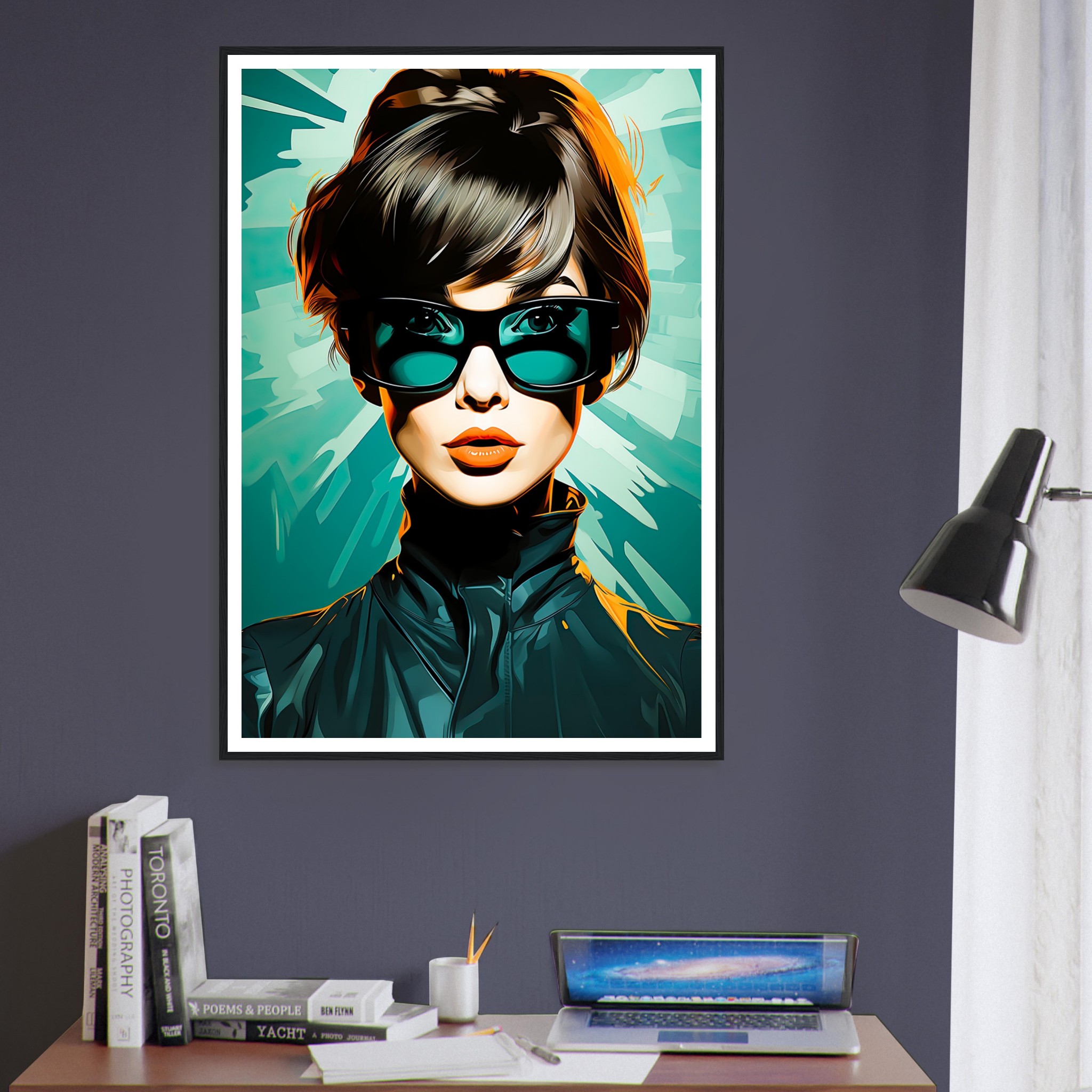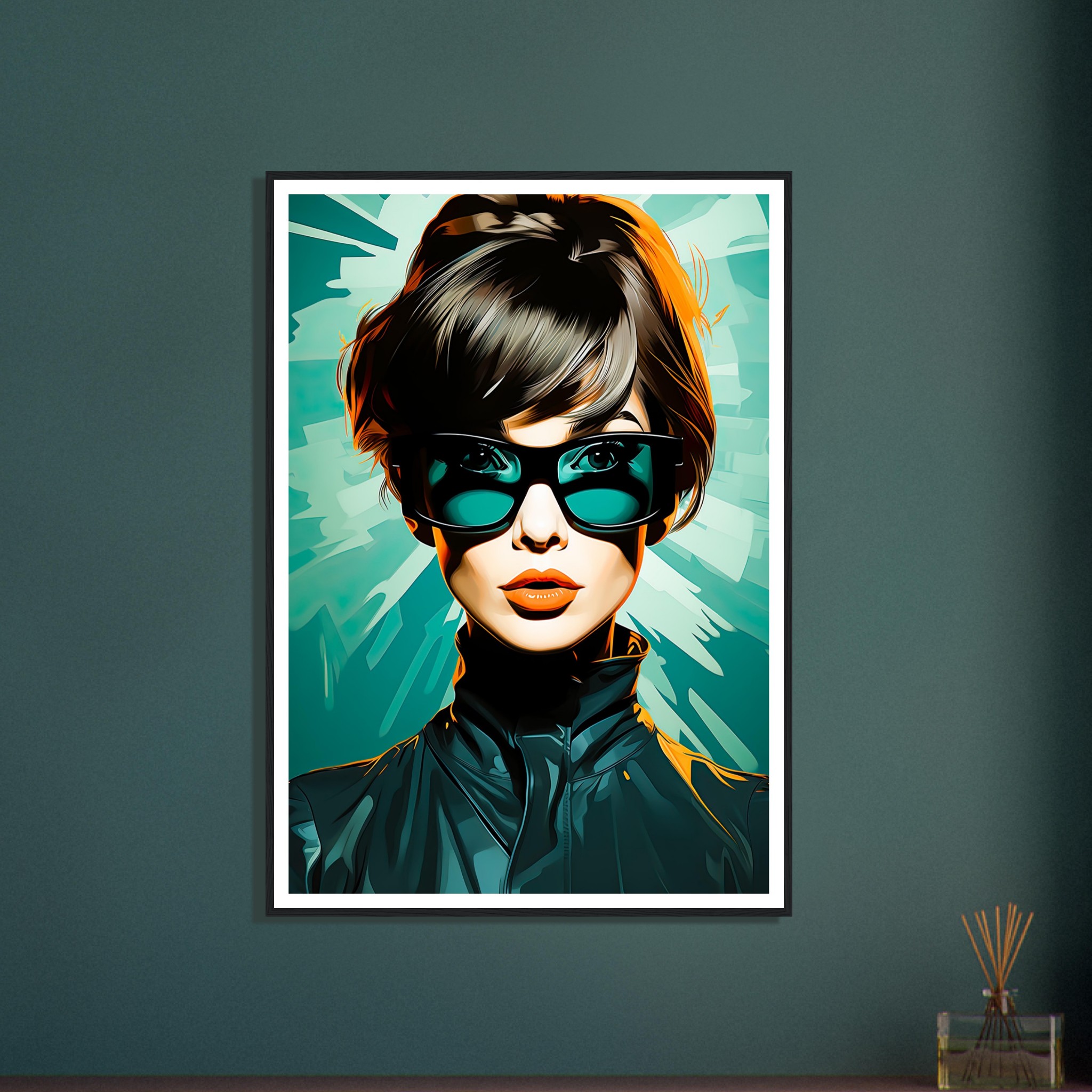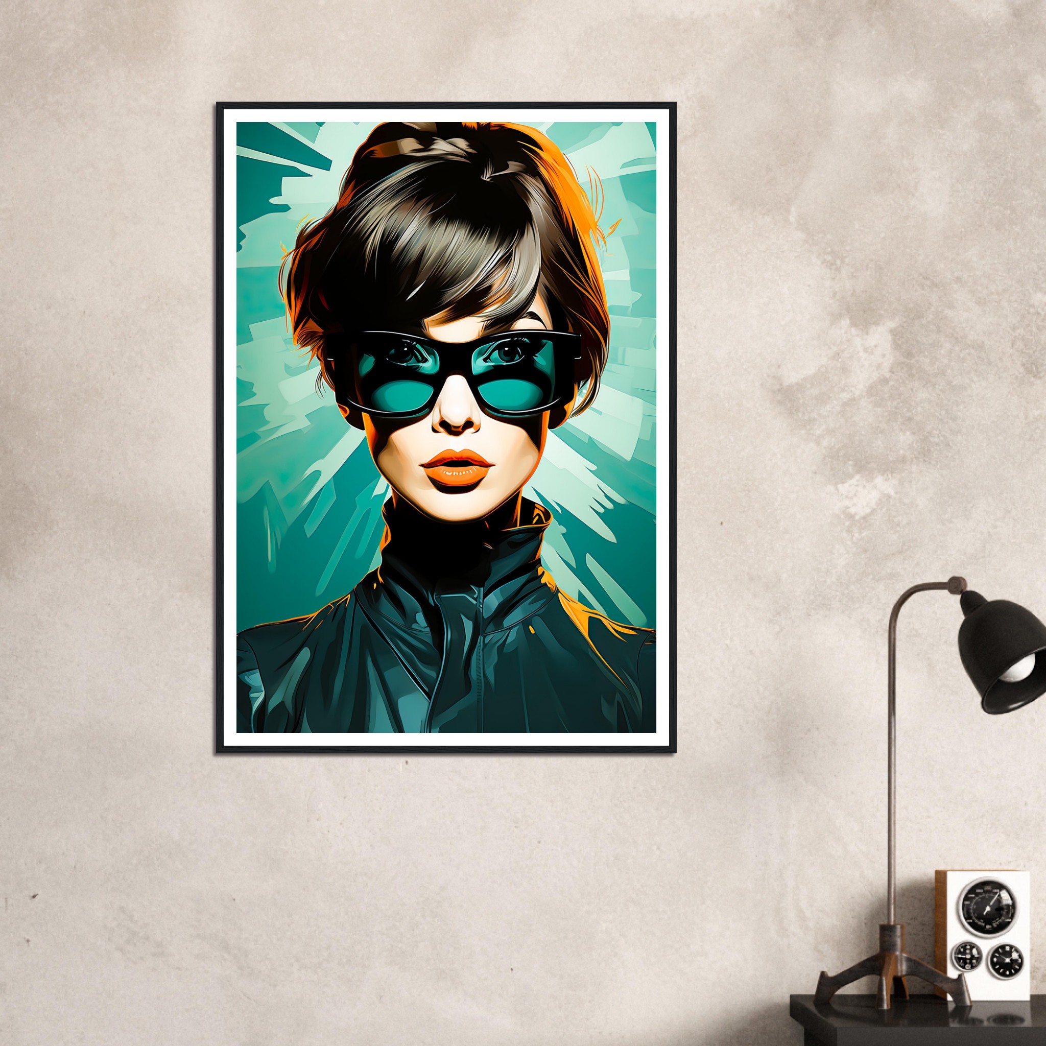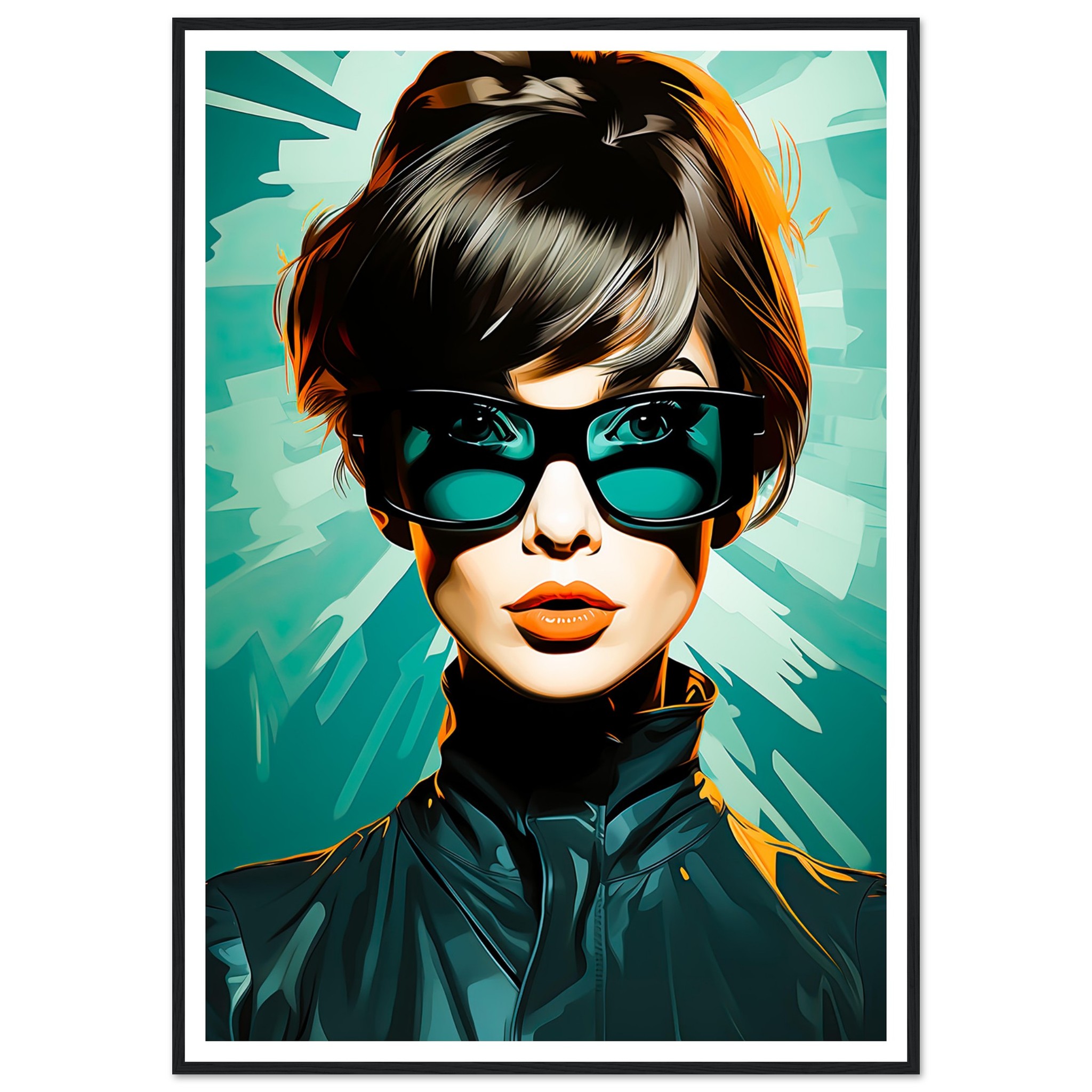 Denna dynamiska poster fångar blicken hos en kvinna med en självsäker och trendig framtoning. Hennes stora solglasögon och det snyggt stylade håret kombineras med den rika tealbakgrunden för att skapa en bild som är både retro och samtida. Hennes blick och de skarpa konturerna av hennes jacka mot de abstrakta formerna i bakgrunden ger intrycket av rörelse och modernitet. Det är en bild som förkroppsligar en stark kvinnlig karaktär och en känsla av frihet och självständighet.
