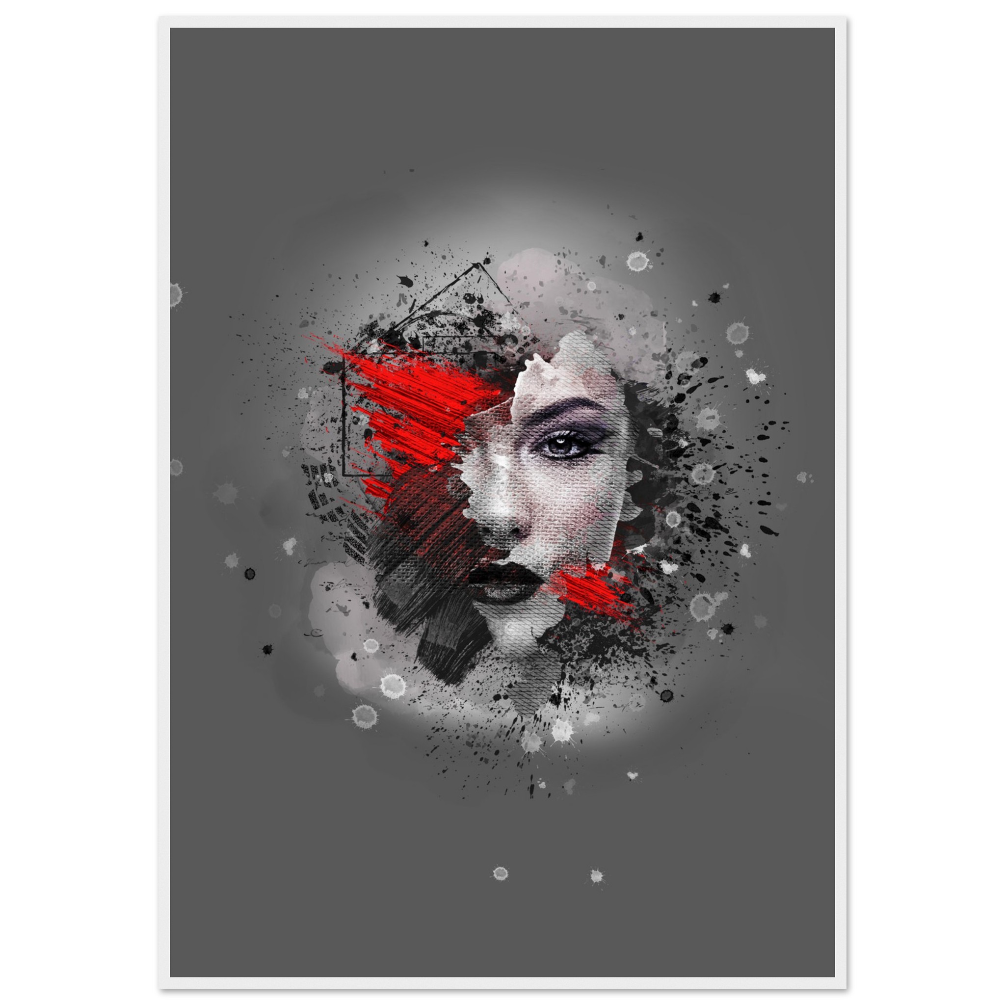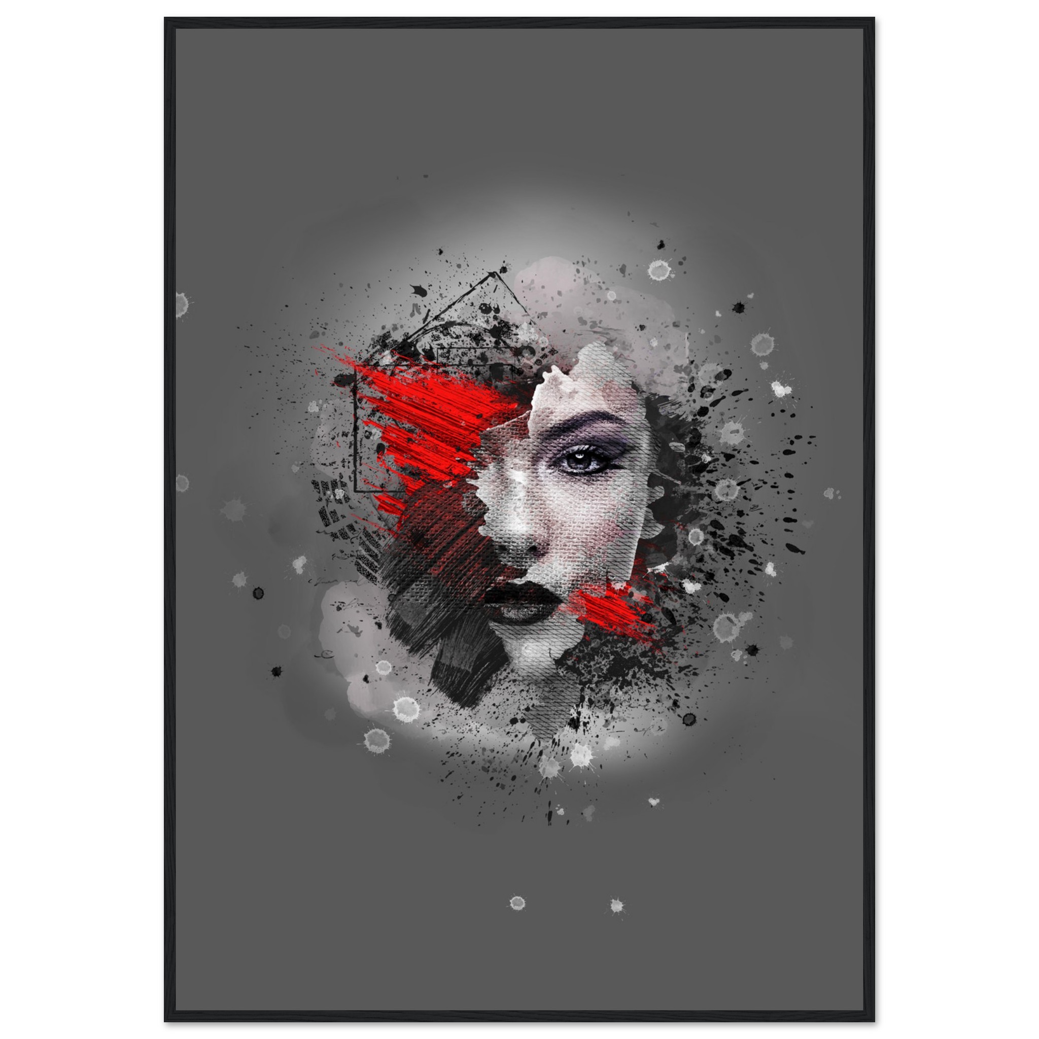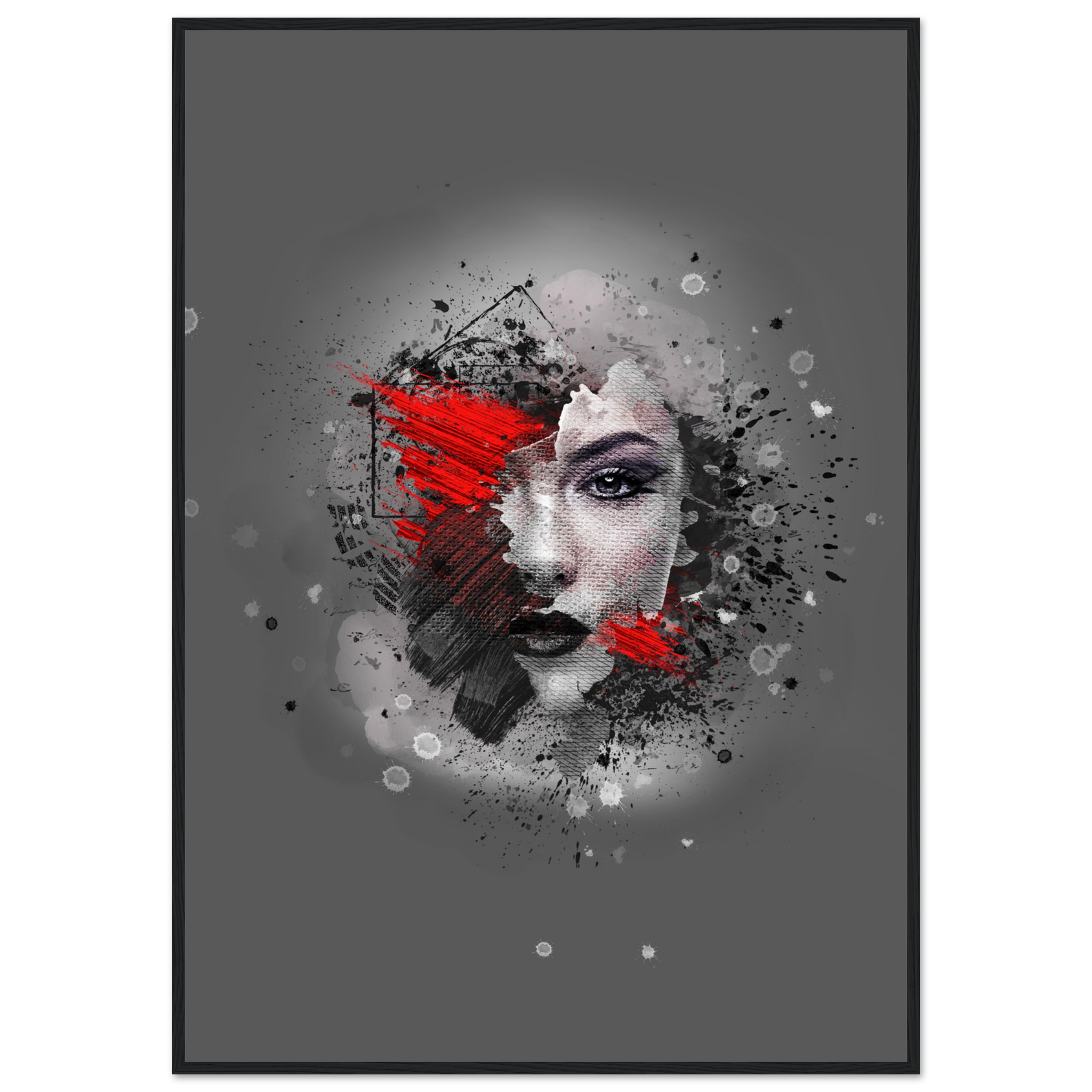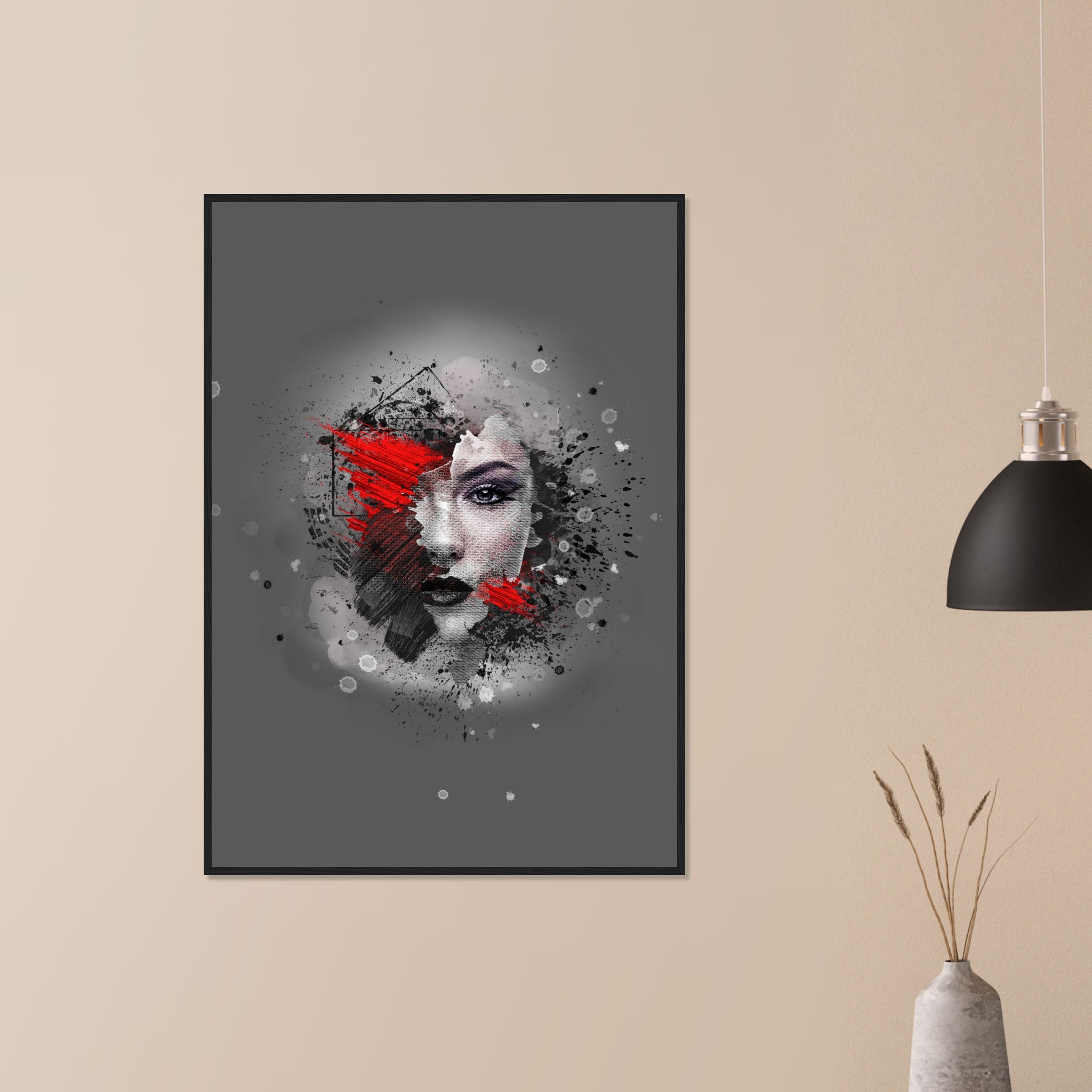 Denna djärva och uttrycksfulla poster framställer ett porträtt av en kvinna, fragmenterat och sammanvävt med abstrakta element och intensiva färgstänk. Den kontrasterande användningen av rött mot en monokrom bakgrund ger en stark visuell påverkan som väcker känslor och eftertanke. Porträttet, som är både detaljerat och avbrott i sin representation, illustrerar komplexiteten och mångsidigheten i mänskliga känslor. Det är en iögonfallande konstnärlig pjäs som skulle passa väl i en modern inredning, i utrymmen dedikerade till samtida konst eller som en centrerande tavla i ett minimalistiskt rum.