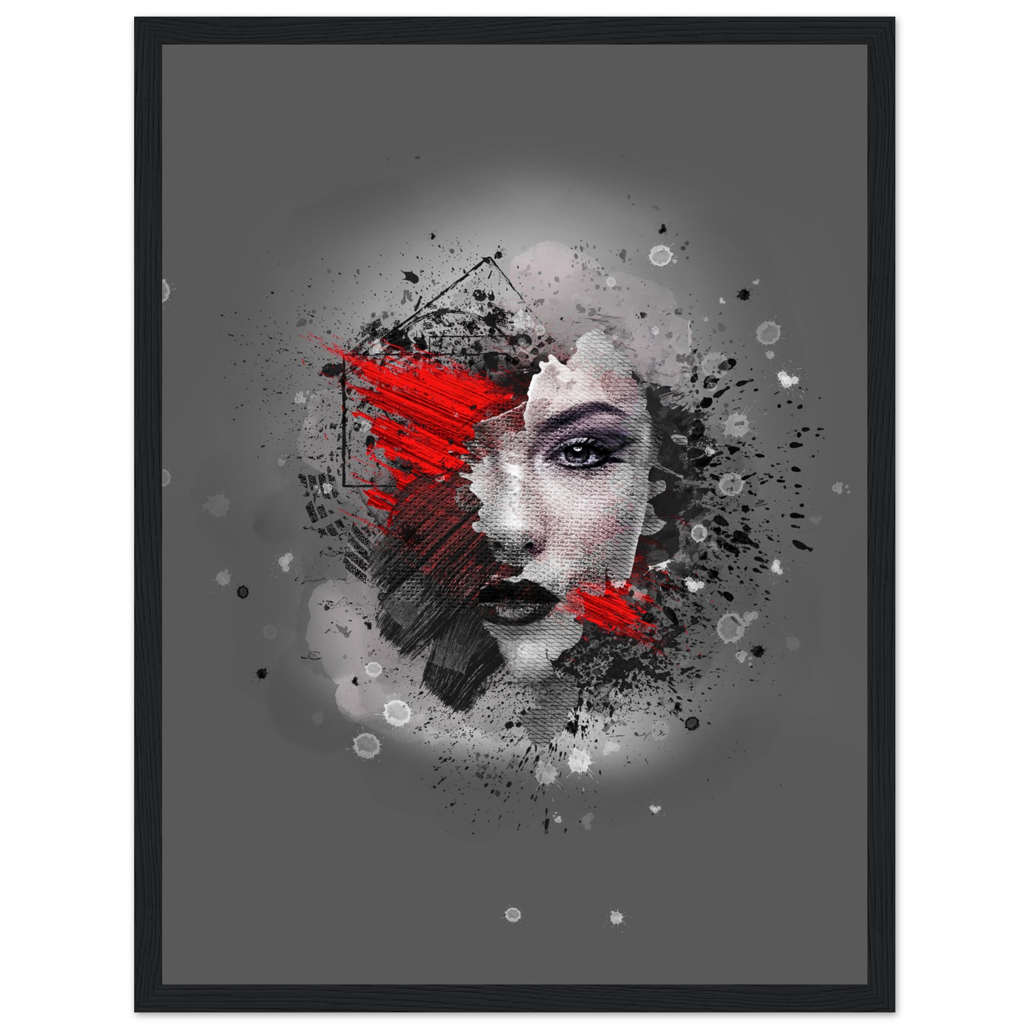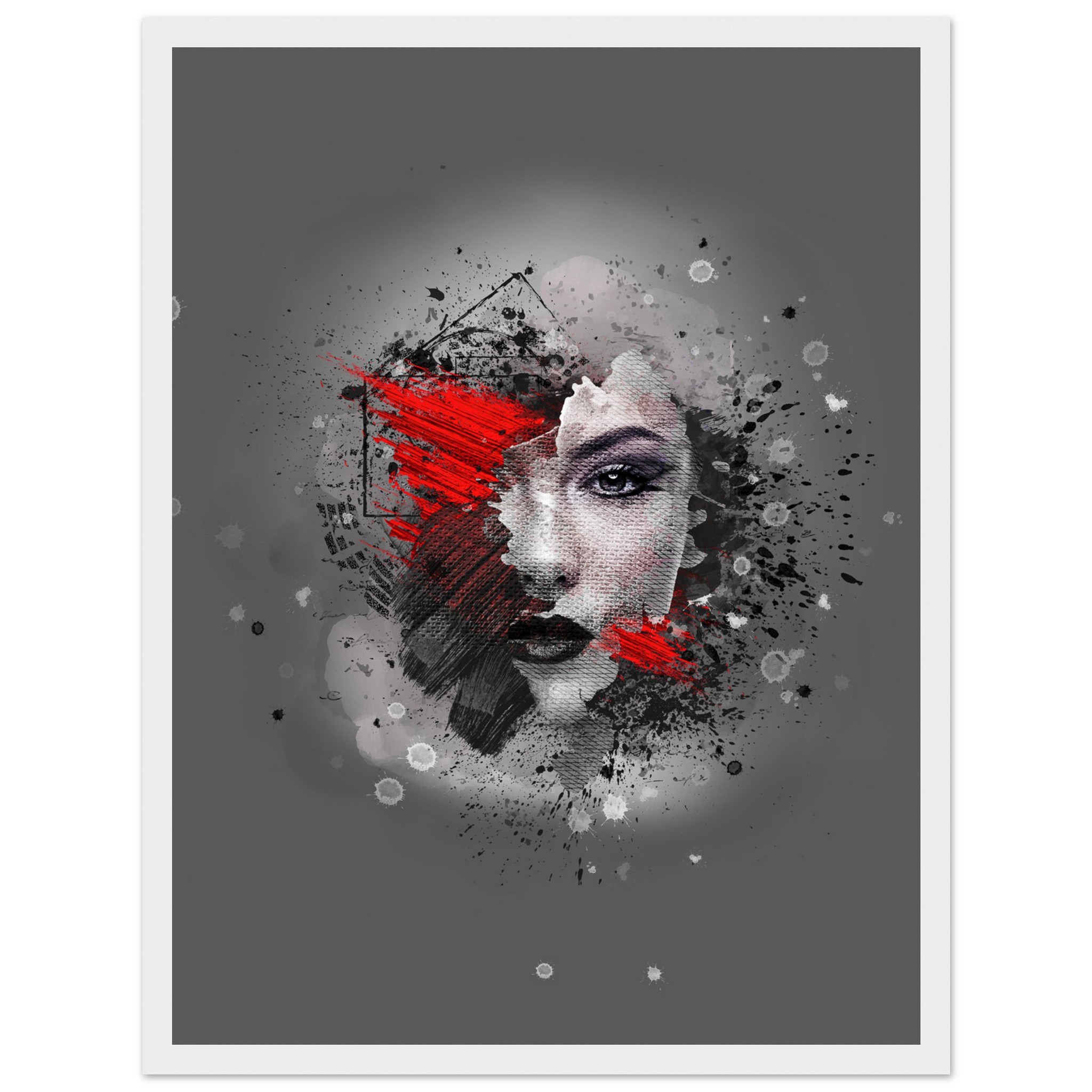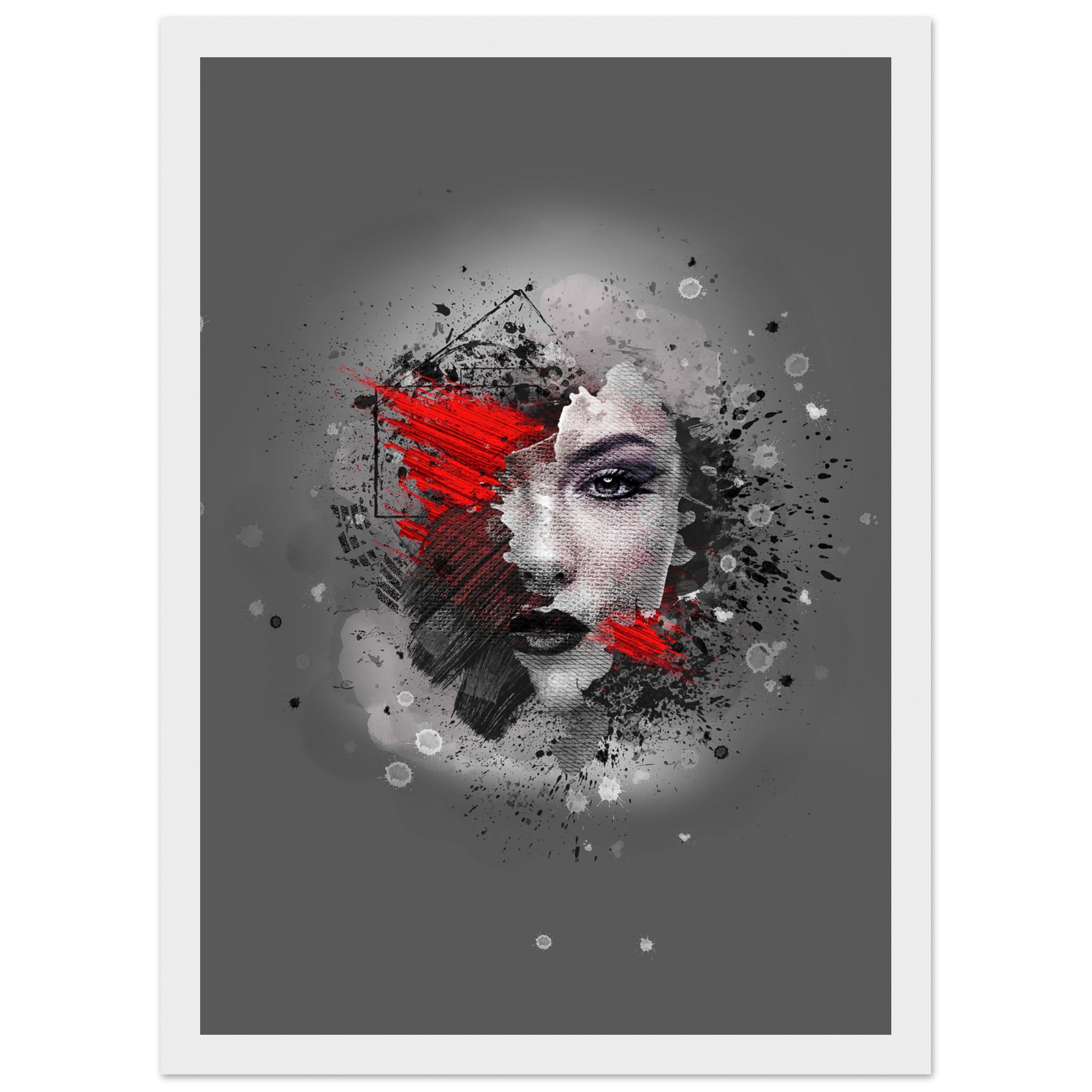 Denna djärva och uttrycksfulla poster framställer ett porträtt av en kvinna, fragmenterat och sammanvävt med abstrakta element och intensiva färgstänk. Den kontrasterande användningen av rött mot en monokrom bakgrund ger en stark visuell påverkan som väcker känslor och eftertanke. Porträttet, som är både detaljerat och avbrott i sin representation, illustrerar komplexiteten och mångsidigheten i mänskliga känslor. Det är en iögonfallande konstnärlig pjäs som skulle passa väl i en modern inredning, i utrymmen dedikerade till samtida konst eller som en centrerande tavla i ett minimalistiskt rum.