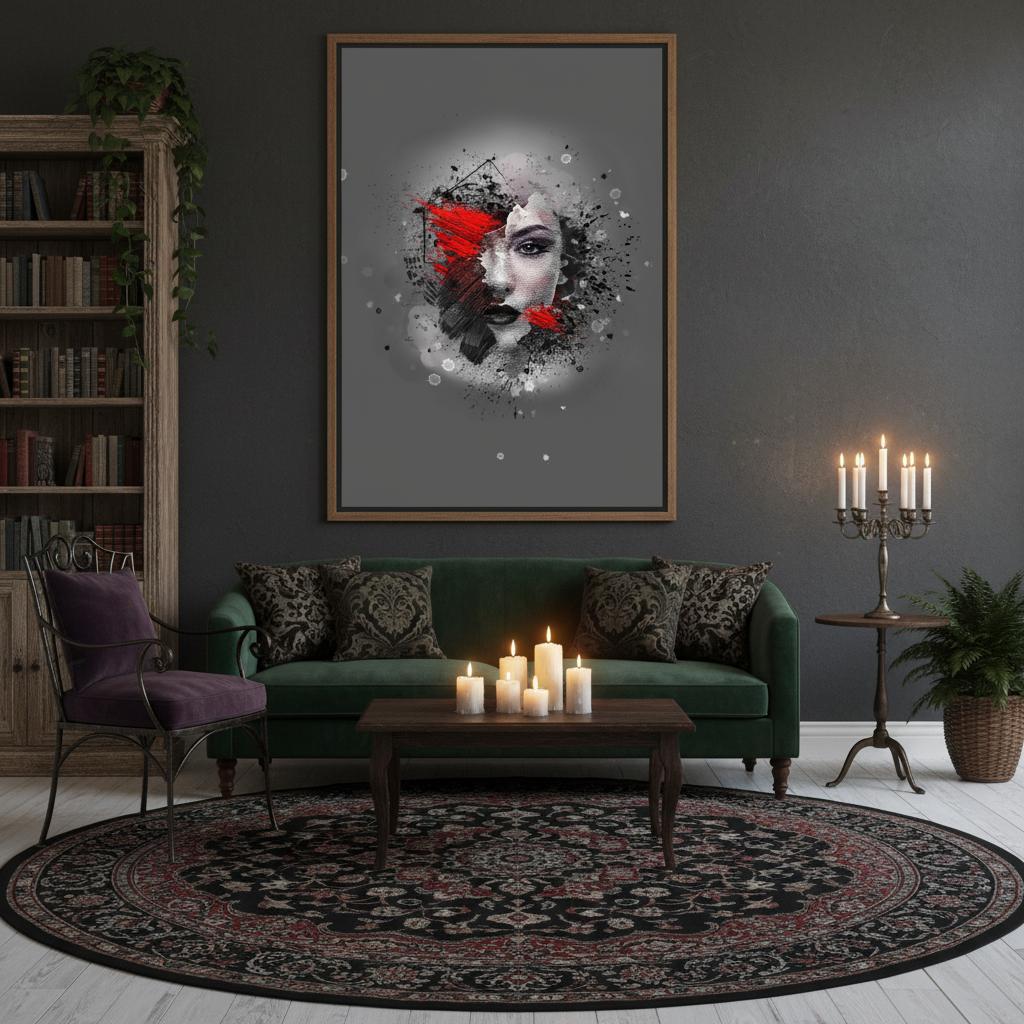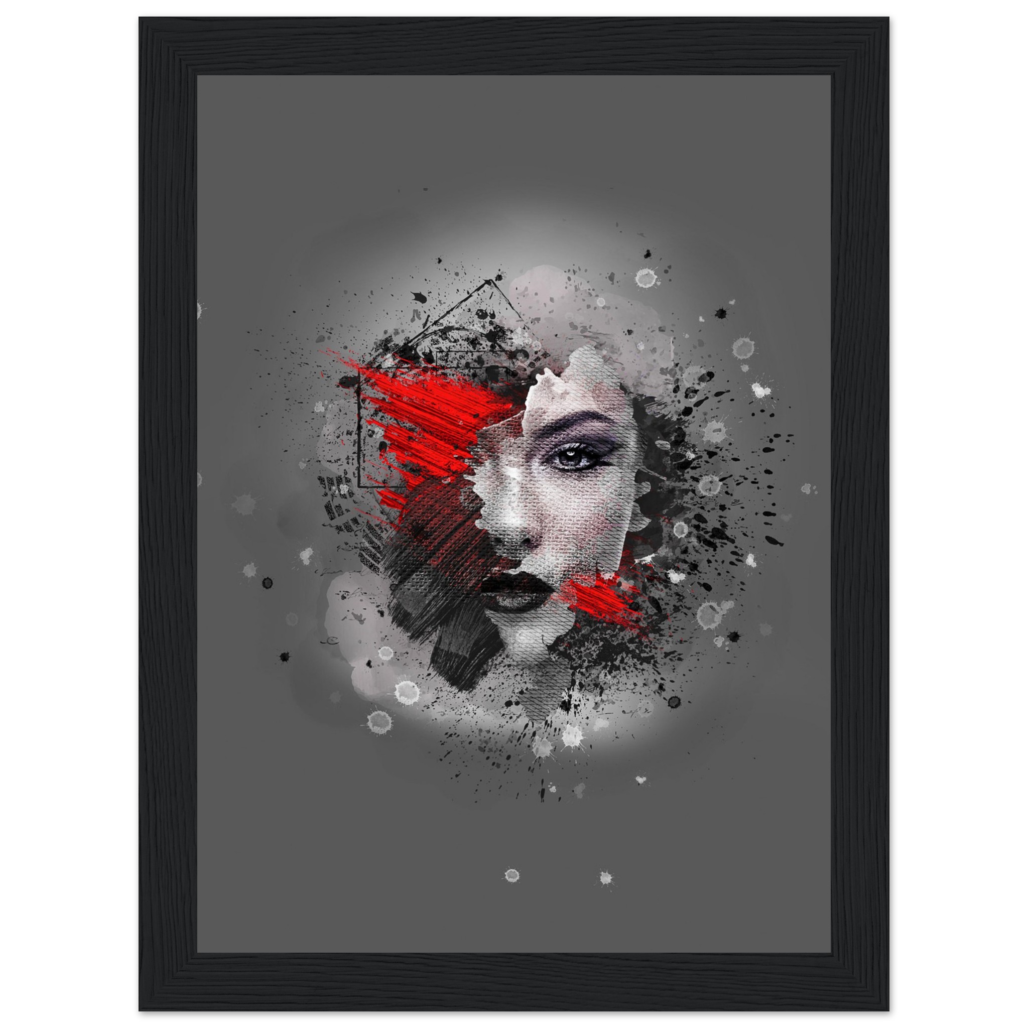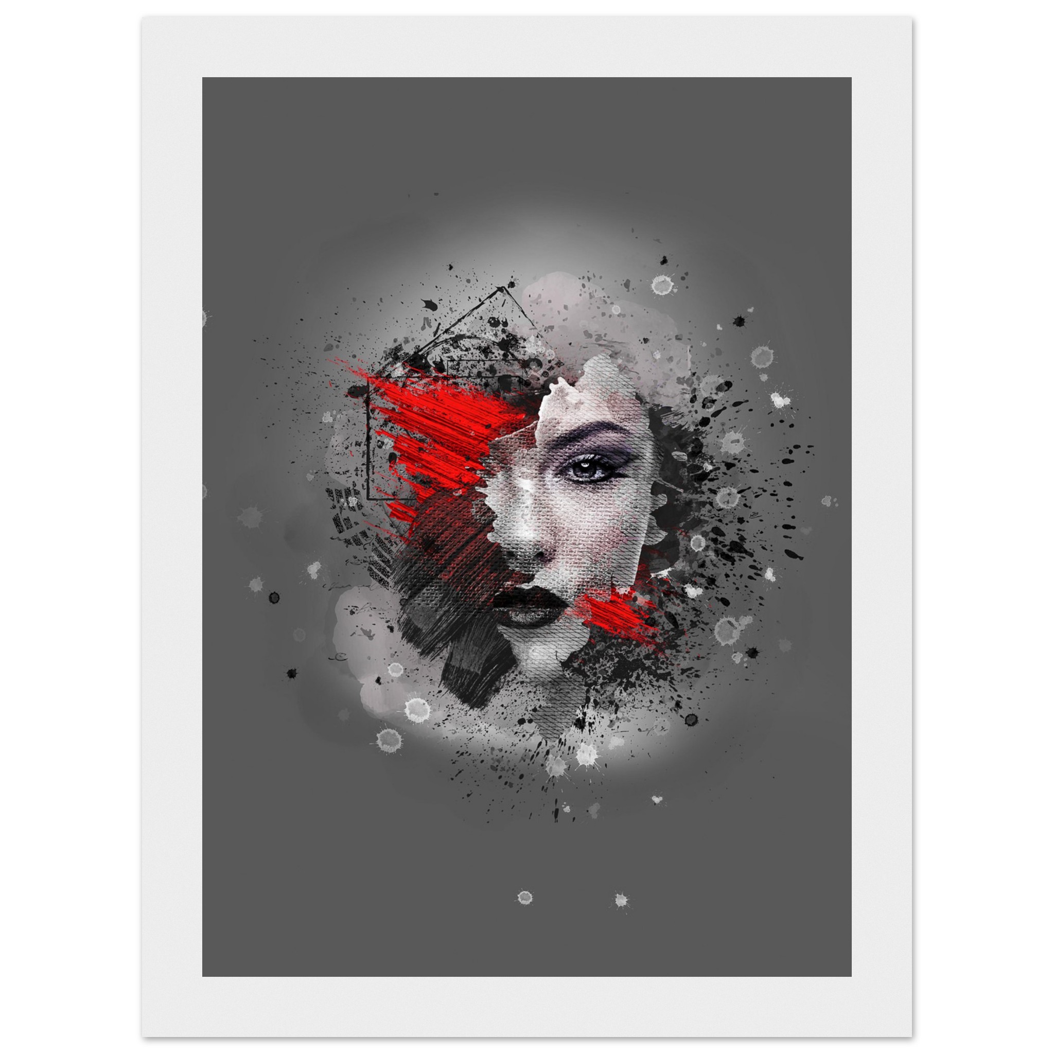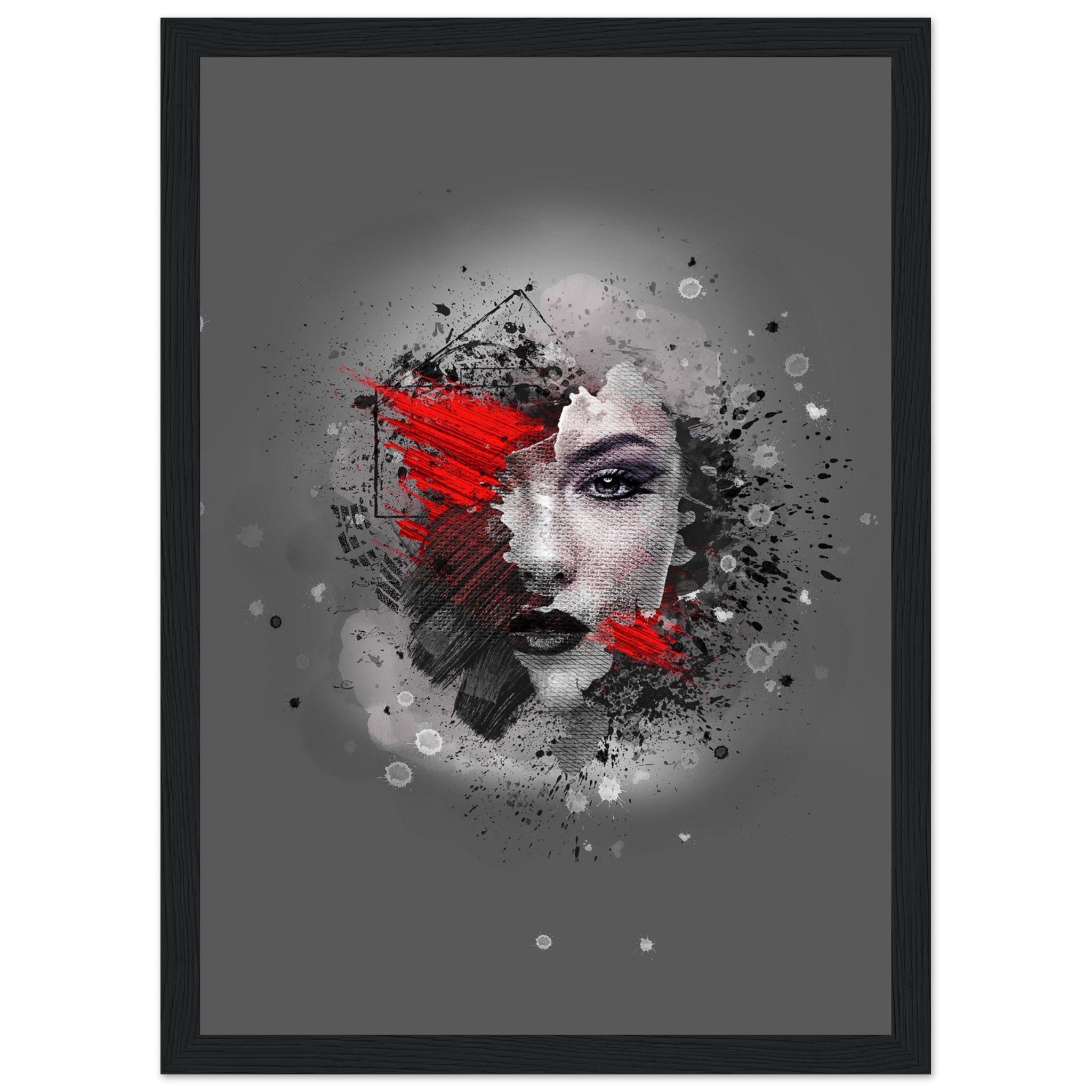 Denna djärva och uttrycksfulla poster framställer ett porträtt av en kvinna, fragmenterat och sammanvävt med abstrakta element och intensiva färgstänk. Den kontrasterande användningen av rött mot en monokrom bakgrund ger en stark visuell påverkan som väcker känslor och eftertanke. Porträttet, som är både detaljerat och avbrott i sin representation, illustrerar komplexiteten och mångsidigheten i mänskliga känslor. Det är en iögonfallande konstnärlig pjäs som skulle passa väl i en modern inredning, i utrymmen dedikerade till samtida konst eller som en centrerande tavla i ett minimalistiskt rum.
