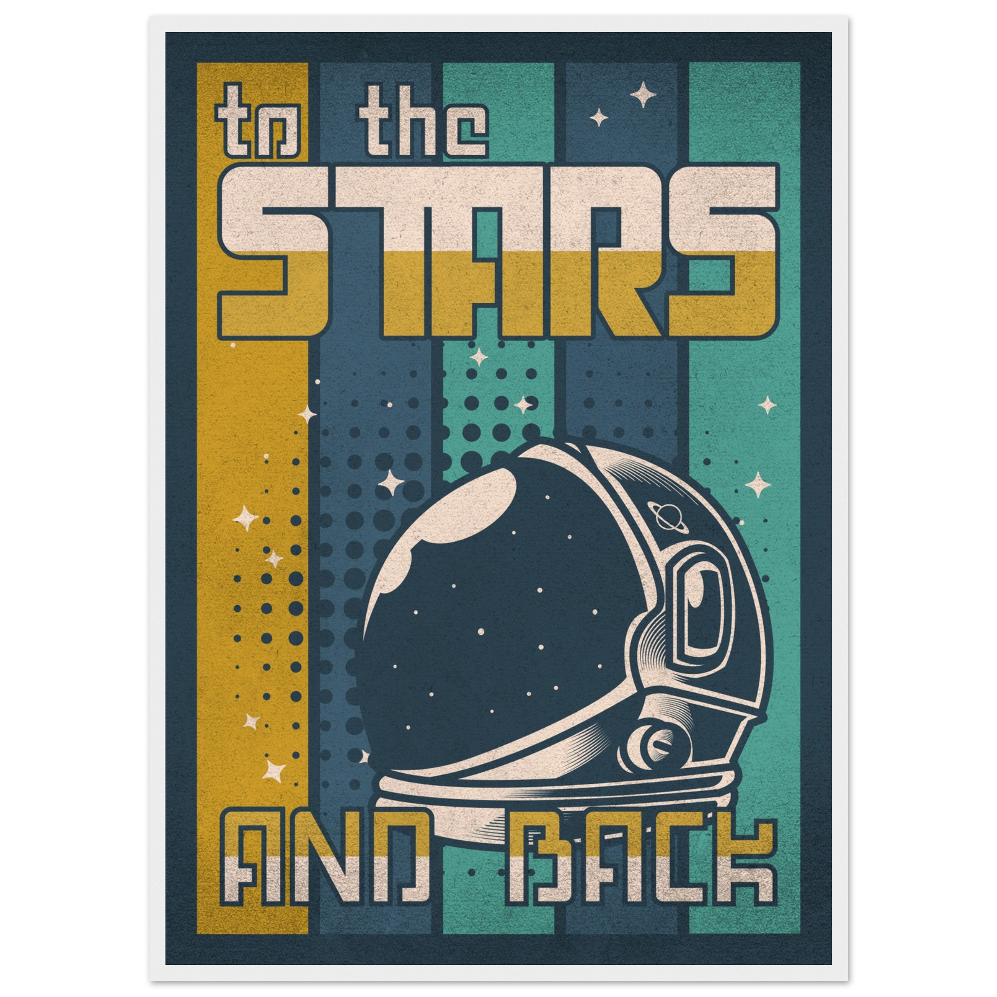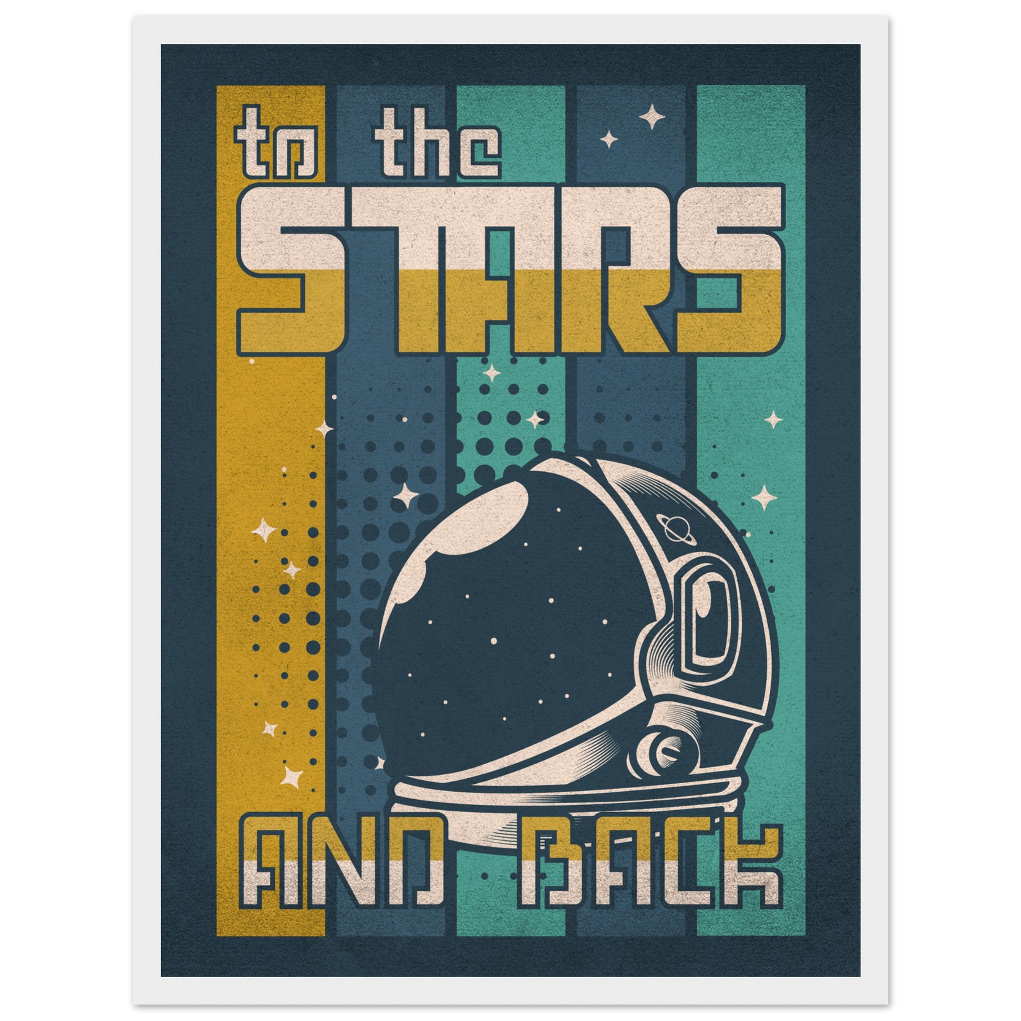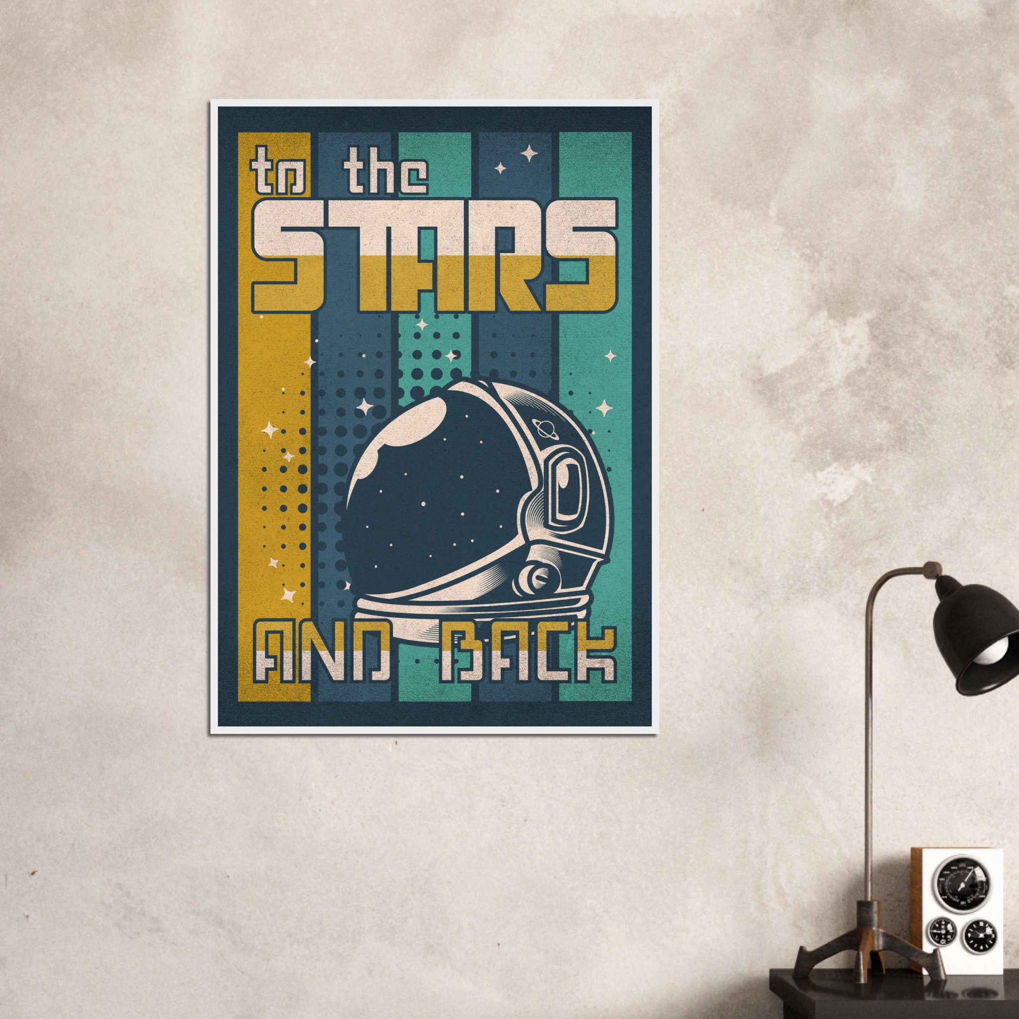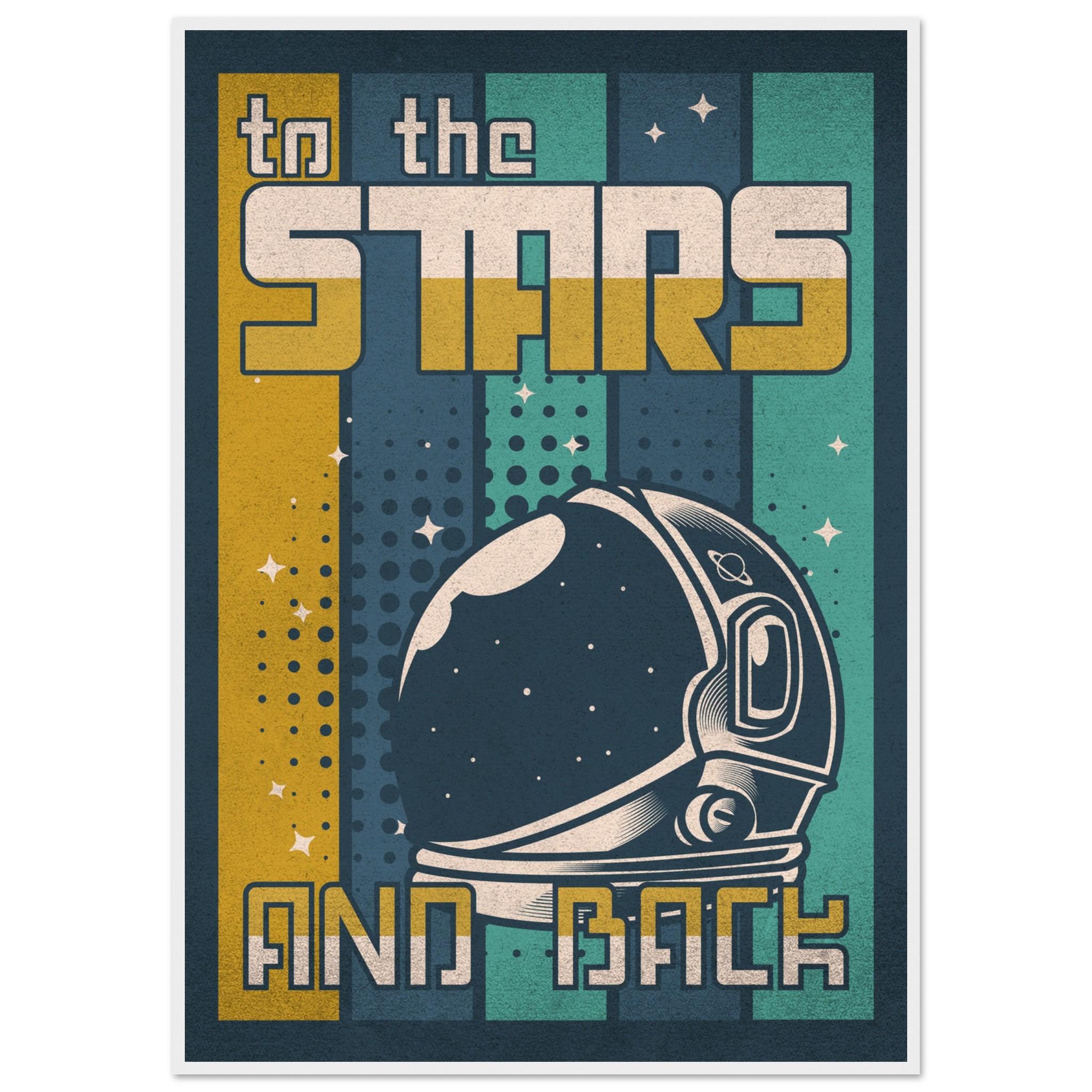 Denna retroinspirerade affisch med sloganen ”To the Stars and Back” firar rymdutforskningens ära och äventyr. Med en klassisk astronaut-hjälm i förgrunden och en bakgrund som leker med element av rymden, stjärnor och kosmiska mönster, är denna konst ett perfekt komplement till varje rymdentusiasts samlingsutrymme. Den grafiska designen och färgpaletten i vintagestil tillför en känsla av nostalgi och drömska upptäckter.