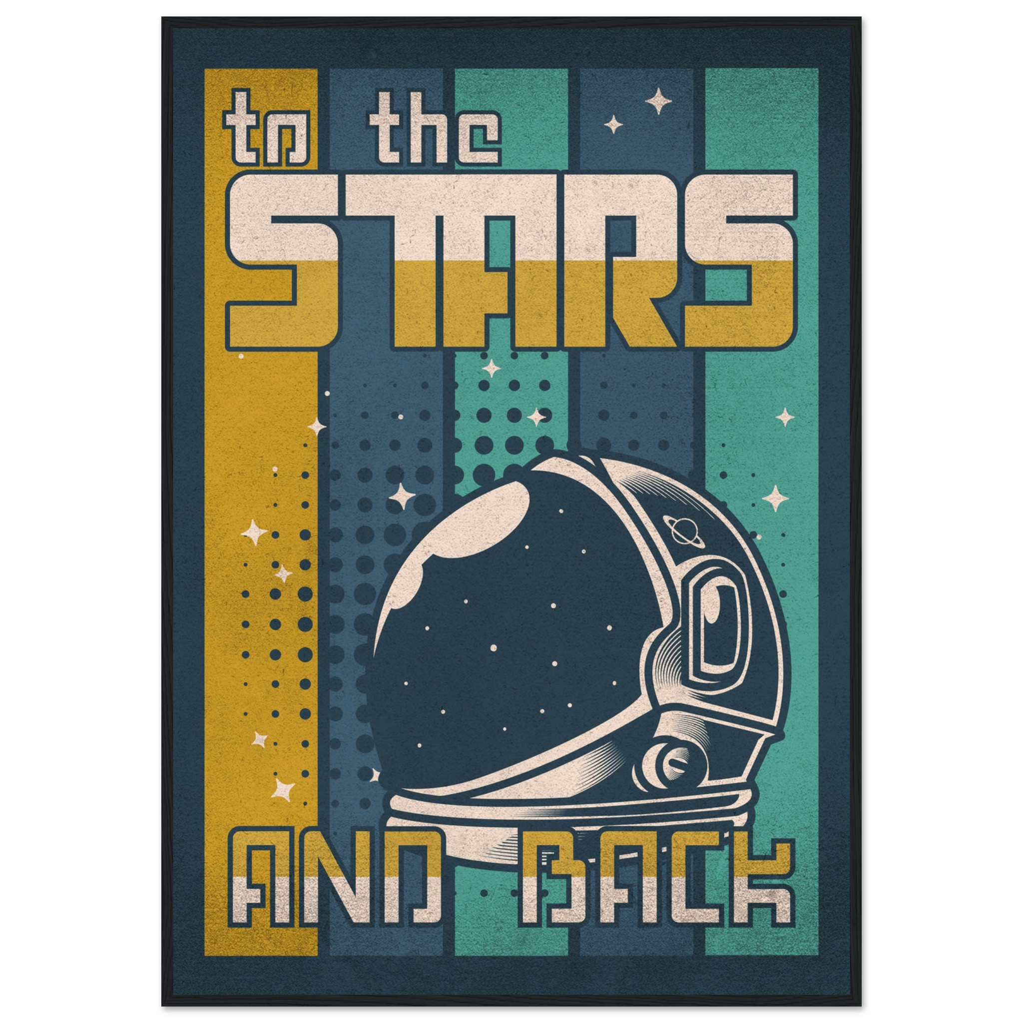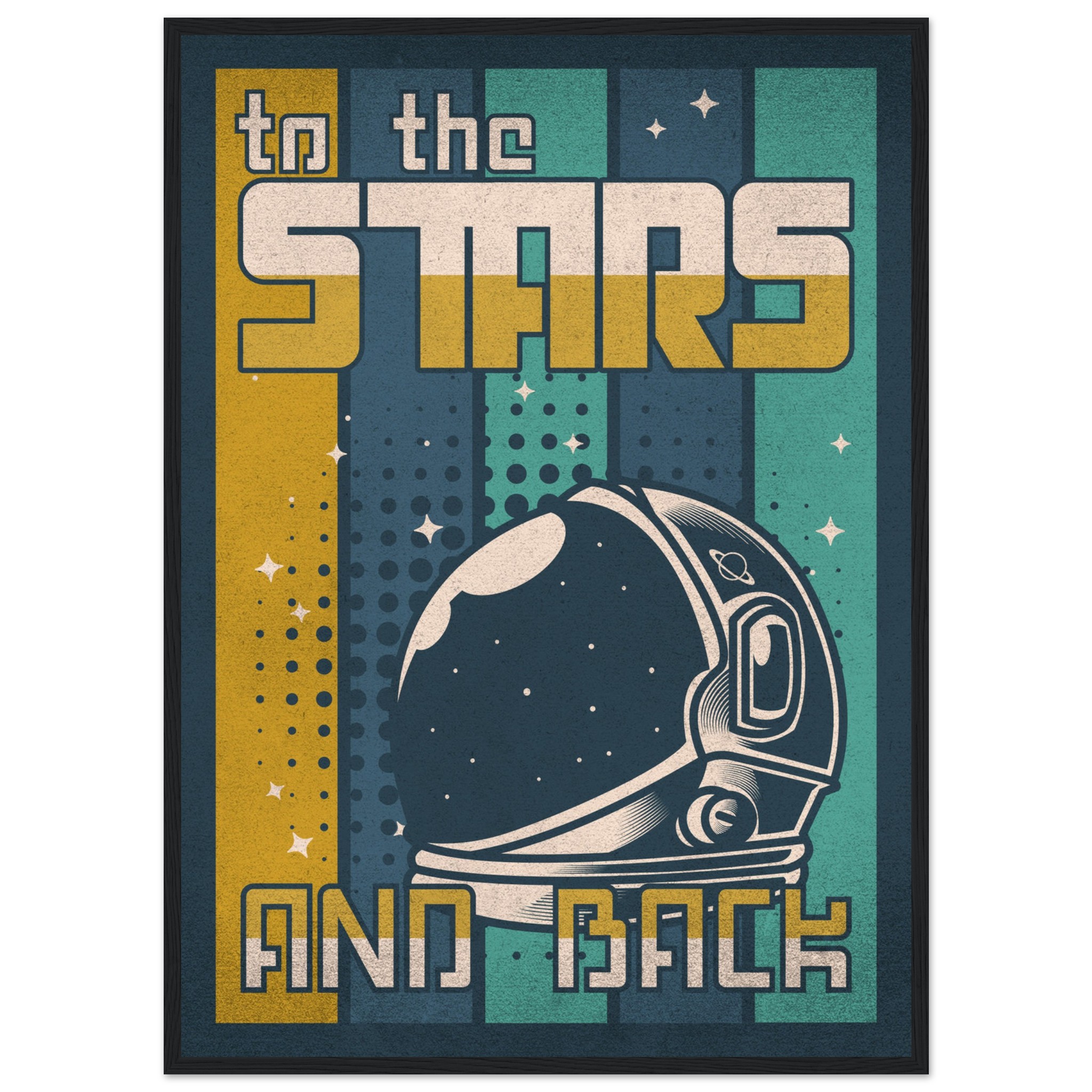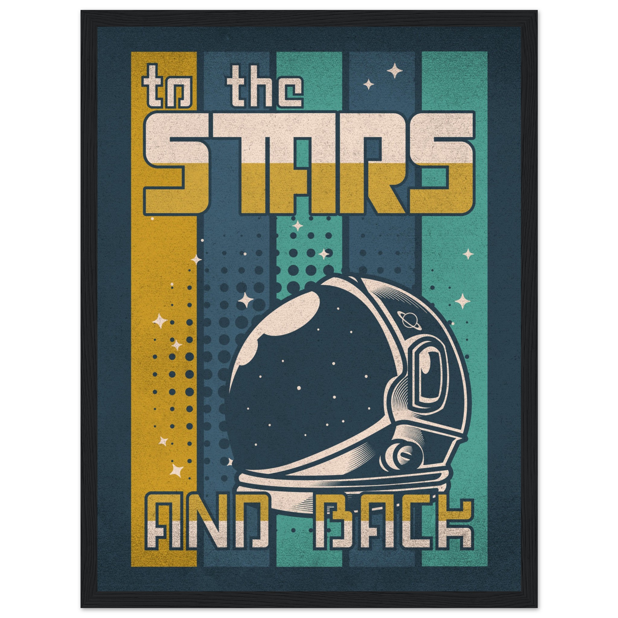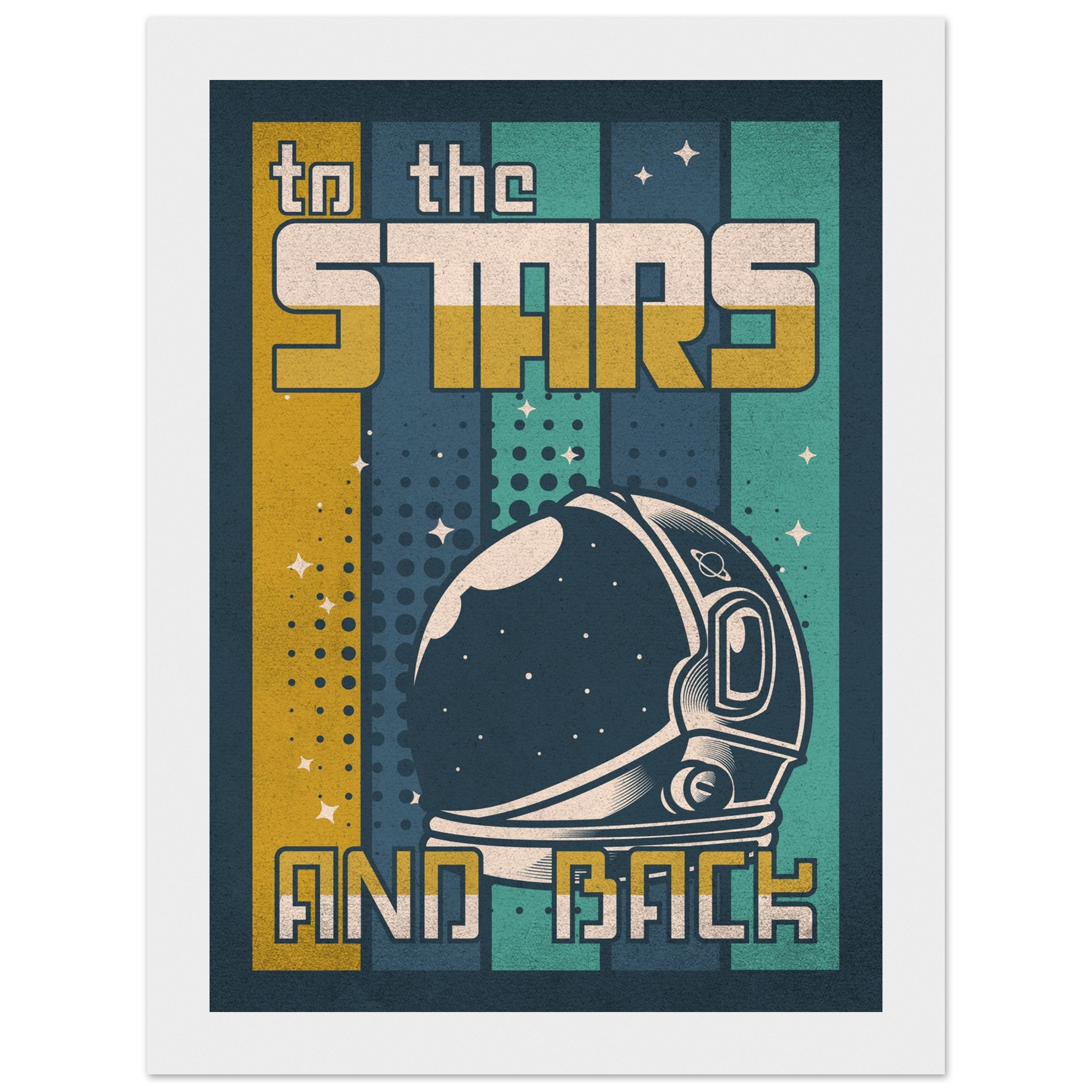 Denna retroinspirerade affisch med sloganen ”To the Stars and Back” firar rymdutforskningens ära och äventyr. Med en klassisk astronaut-hjälm i förgrunden och en bakgrund som leker med element av rymden, stjärnor och kosmiska mönster, är denna konst ett perfekt komplement till varje rymdentusiasts samlingsutrymme. Den grafiska designen och färgpaletten i vintagestil tillför en känsla av nostalgi och drömska upptäckter.