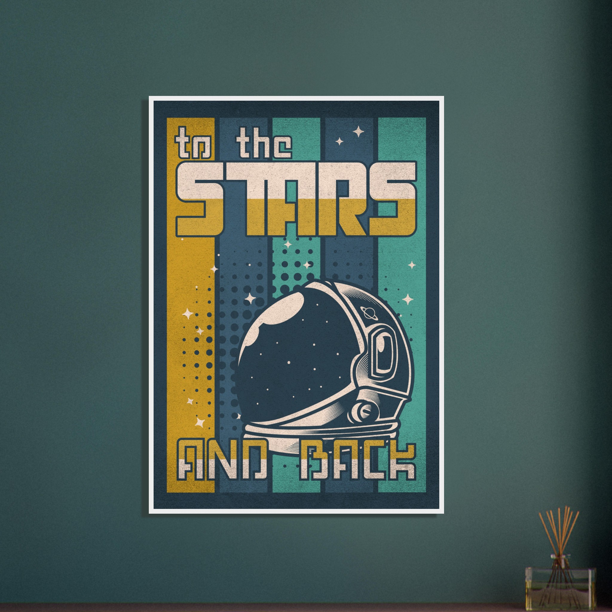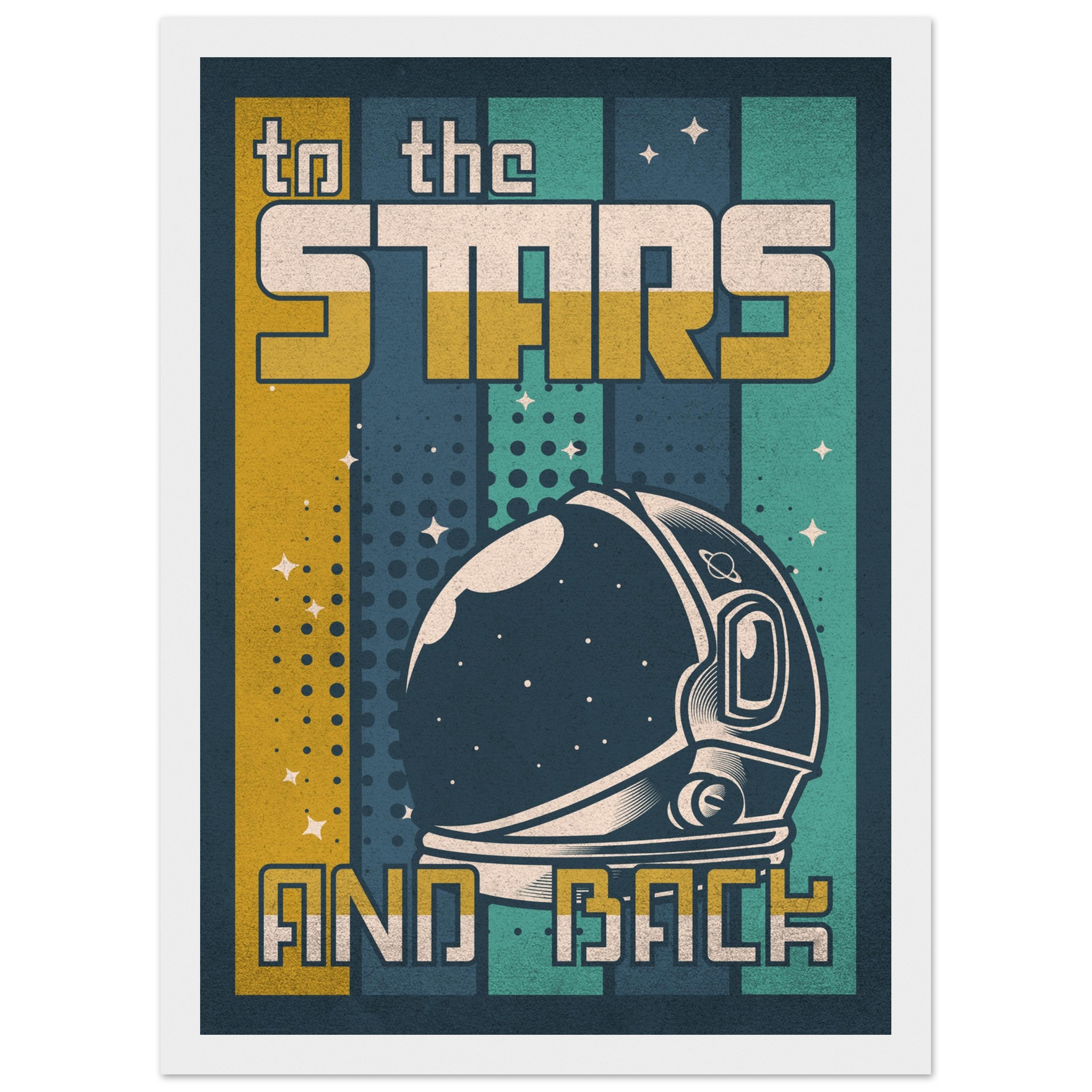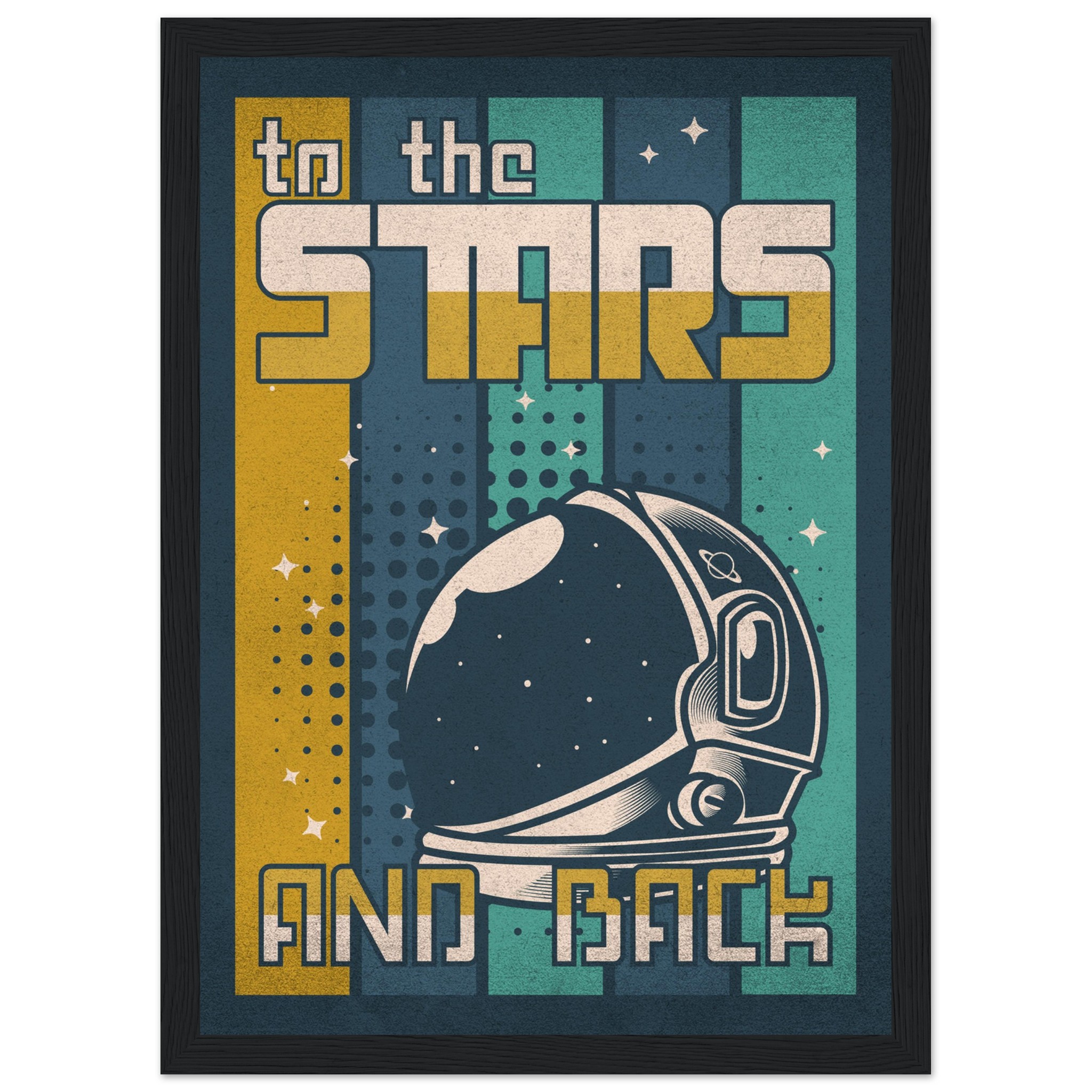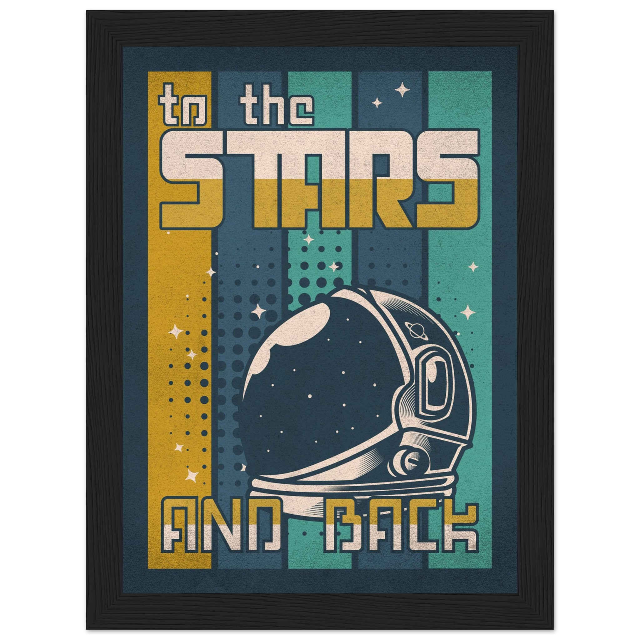 Denna retroinspirerade affisch med sloganen ”To the Stars and Back” firar rymdutforskningens ära och äventyr. Med en klassisk astronaut-hjälm i förgrunden och en bakgrund som leker med element av rymden, stjärnor och kosmiska mönster, är denna konst ett perfekt komplement till varje rymdentusiasts samlingsutrymme. Den grafiska designen och färgpaletten i vintagestil tillför en känsla av nostalgi och drömska upptäckter.