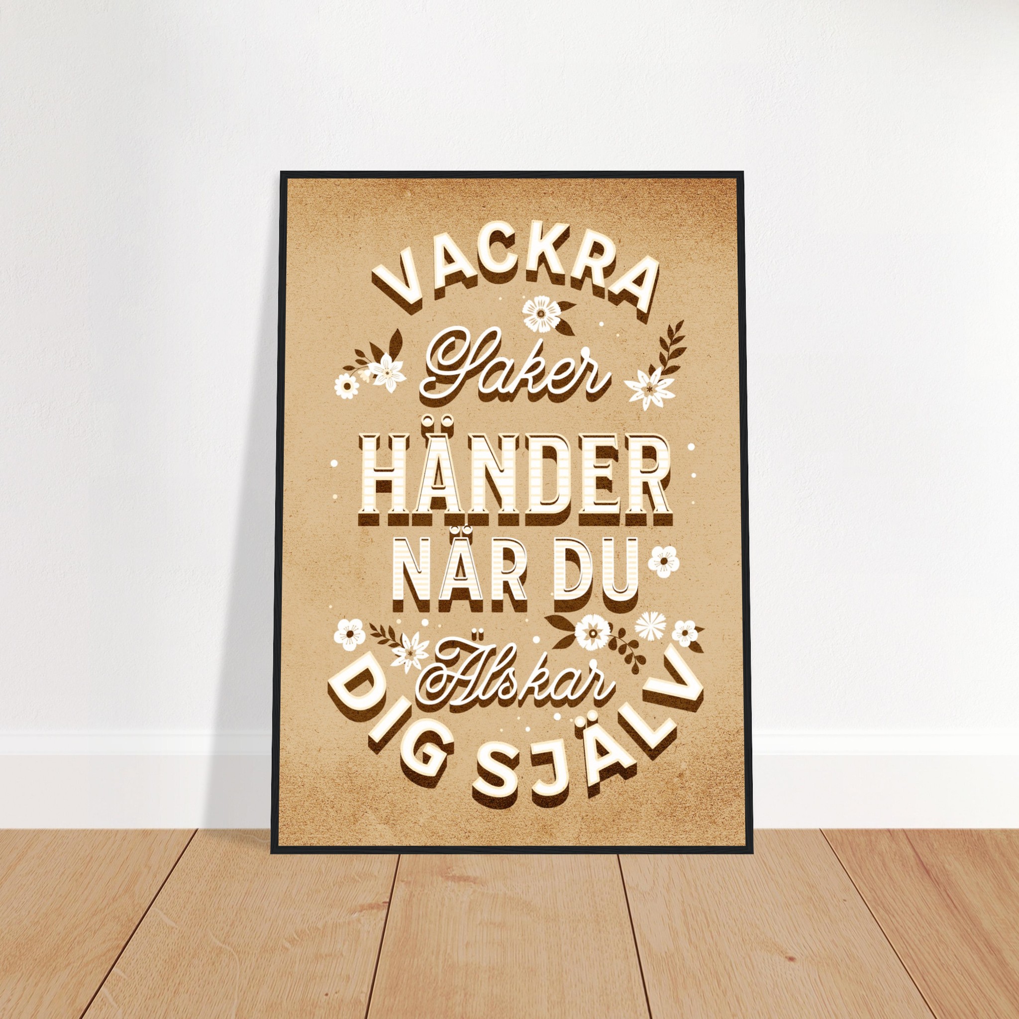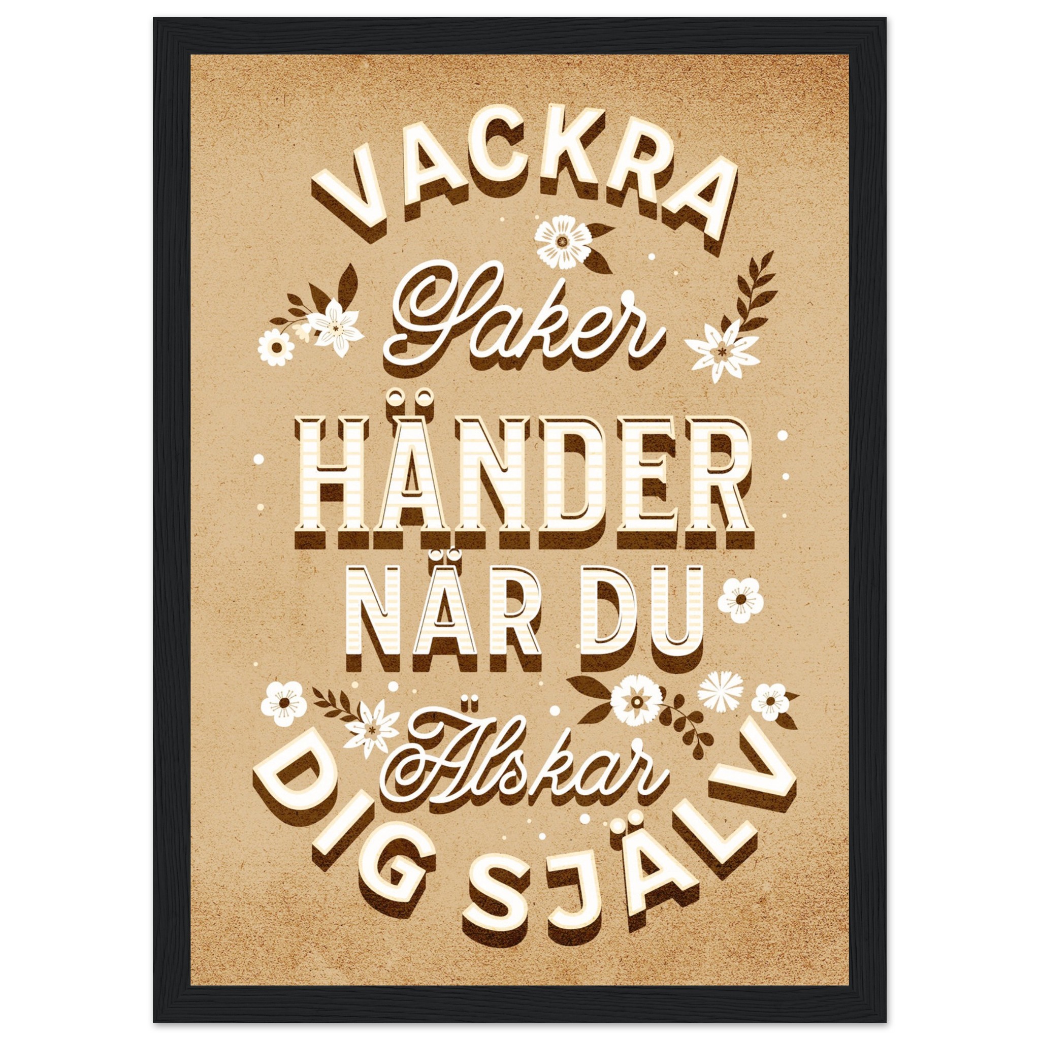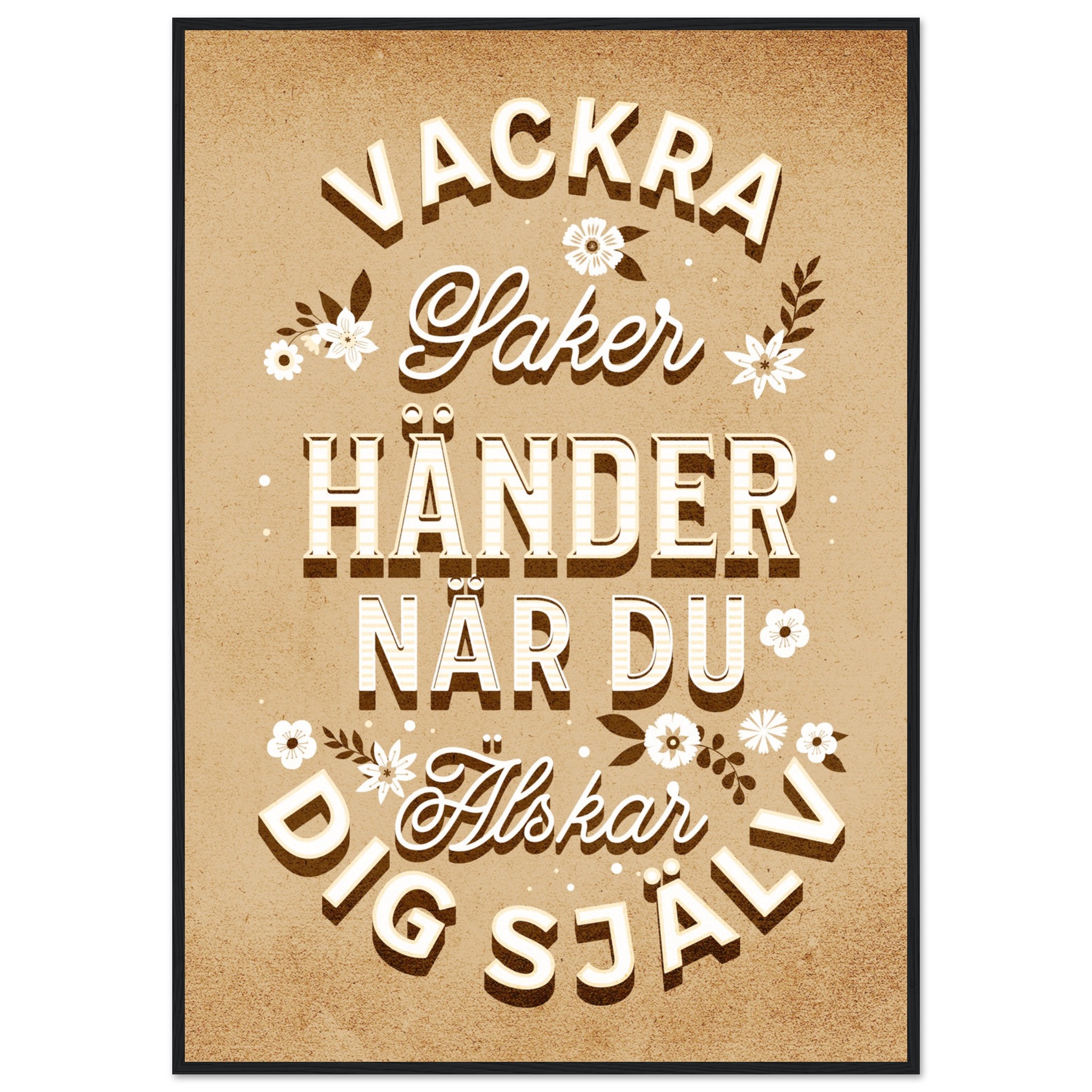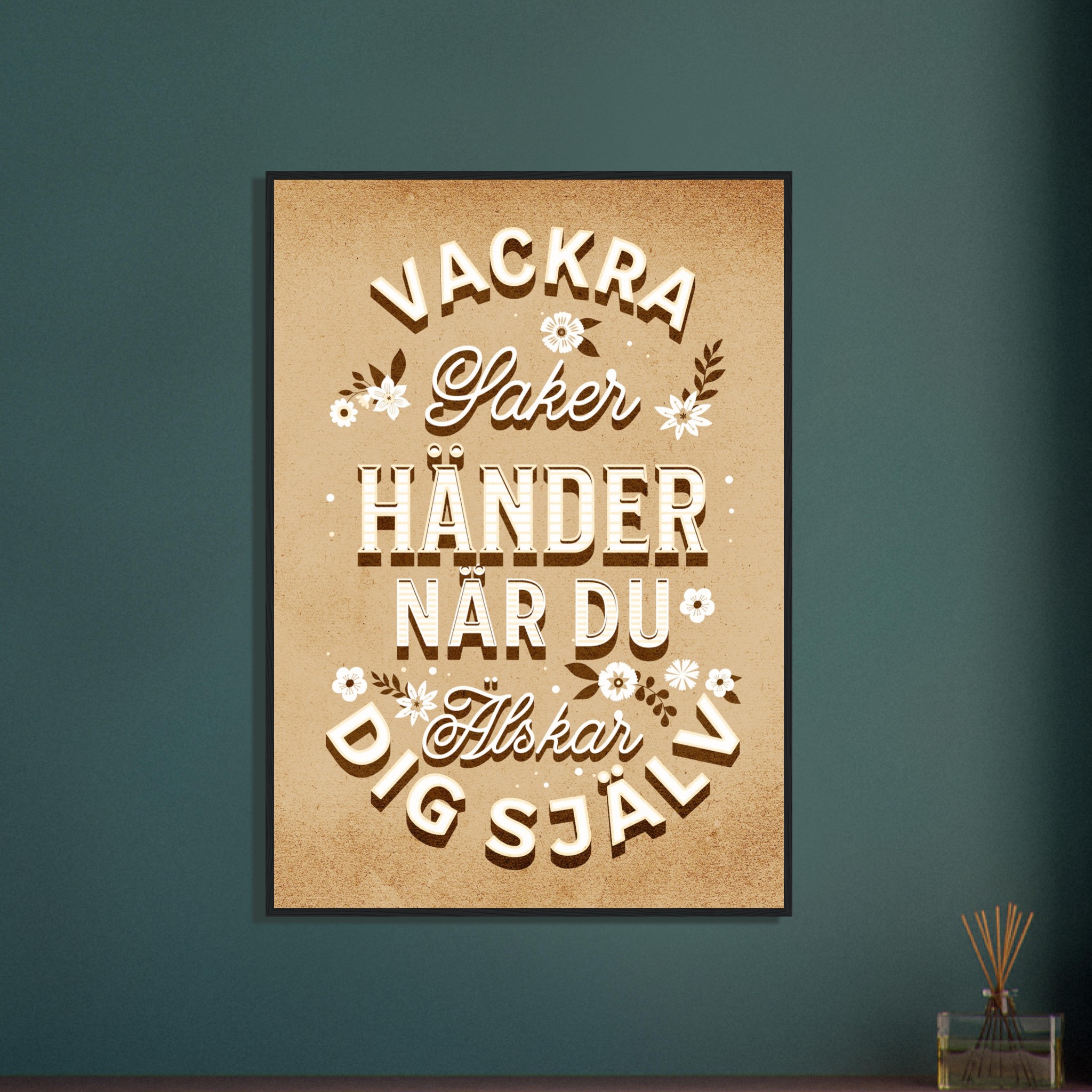 Denna ’Älska dig själv’-poster är inte bara en vacker väggdekoration, utan också en inspirerande påminnelse om självkärlekens kraft. Med orden ’Vackra saker händer när du älskar dig själv’ i framträdande stiliserad typografi, sprider den en daglig dos av positivitet i ditt hem. Dess vintageinspirerade design och varma färgpalett kompletteras med detaljerade blommiga dekorationer, vilket skapar en känsla av tröst och uppmuntran. Perfekt för sovrummet, vardagsrummet eller något utrymme där du vill införa en positiv atmosfär. Tryckt på högkvalitativt matt papper och tillgänglig med en svart eller vit ram.