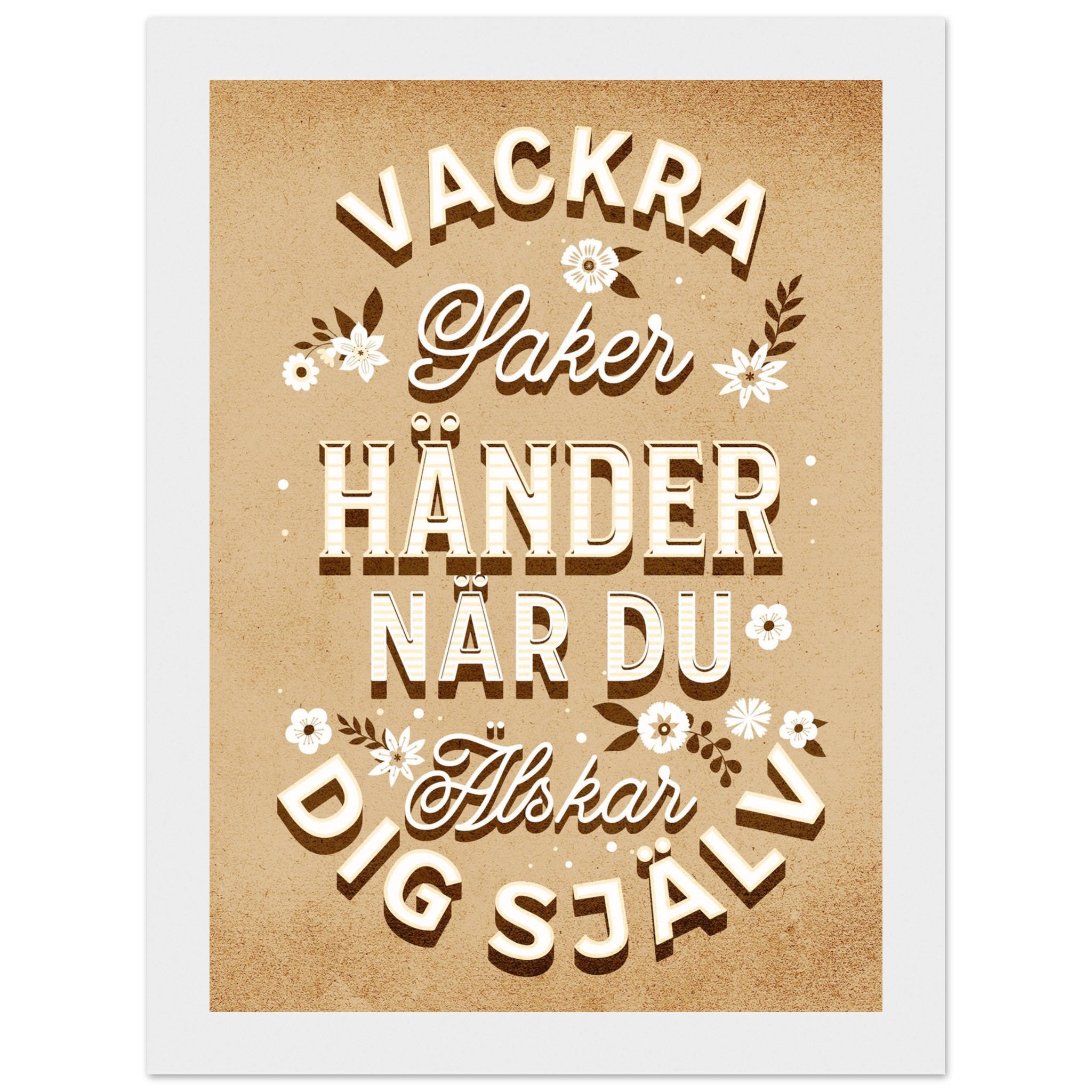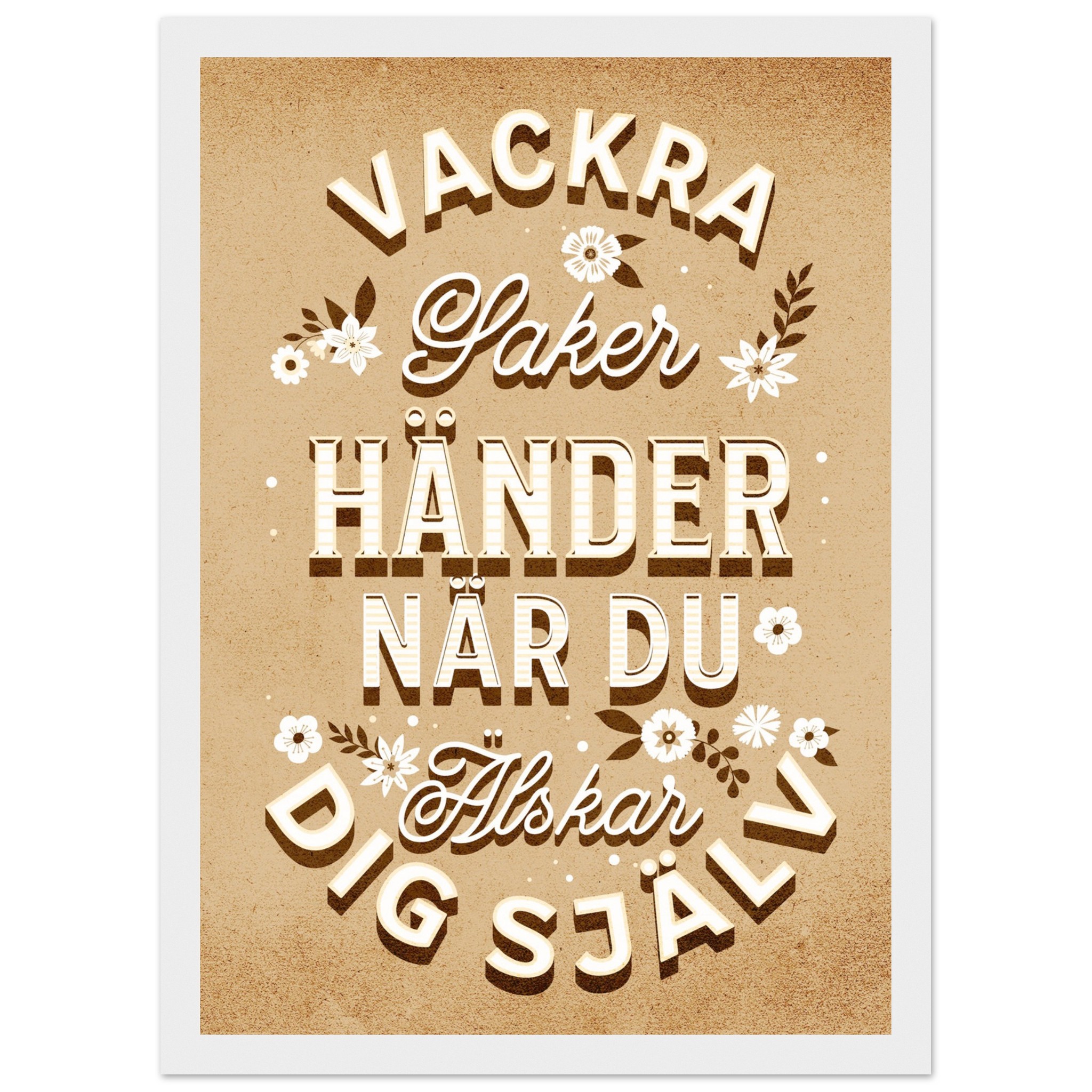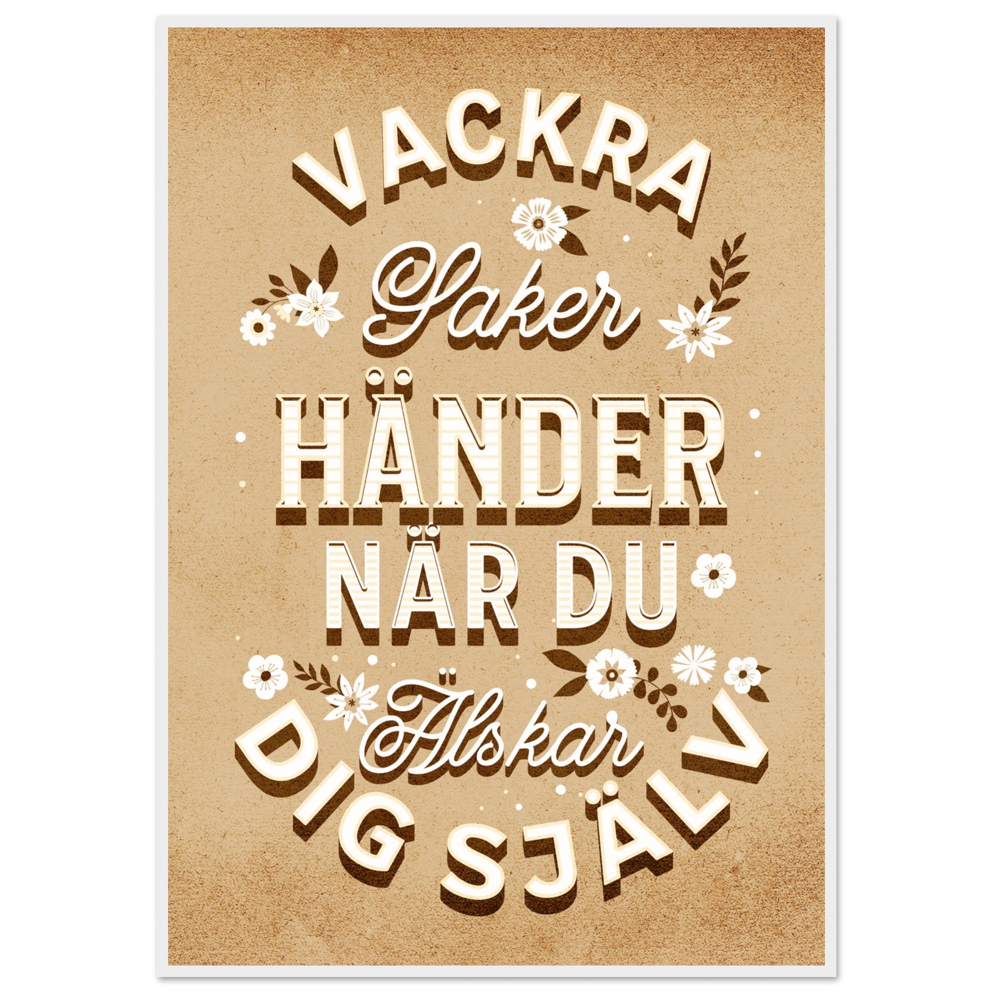 Denna ’Älska dig själv’-poster är inte bara en vacker väggdekoration, utan också en inspirerande påminnelse om självkärlekens kraft. Med orden ’Vackra saker händer när du älskar dig själv’ i framträdande stiliserad typografi, sprider den en daglig dos av positivitet i ditt hem. Dess vintageinspirerade design och varma färgpalett kompletteras med detaljerade blommiga dekorationer, vilket skapar en känsla av tröst och uppmuntran. Perfekt för sovrummet, vardagsrummet eller något utrymme där du vill införa en positiv atmosfär. Tryckt på högkvalitativt matt papper och tillgänglig med en svart eller vit ram.
