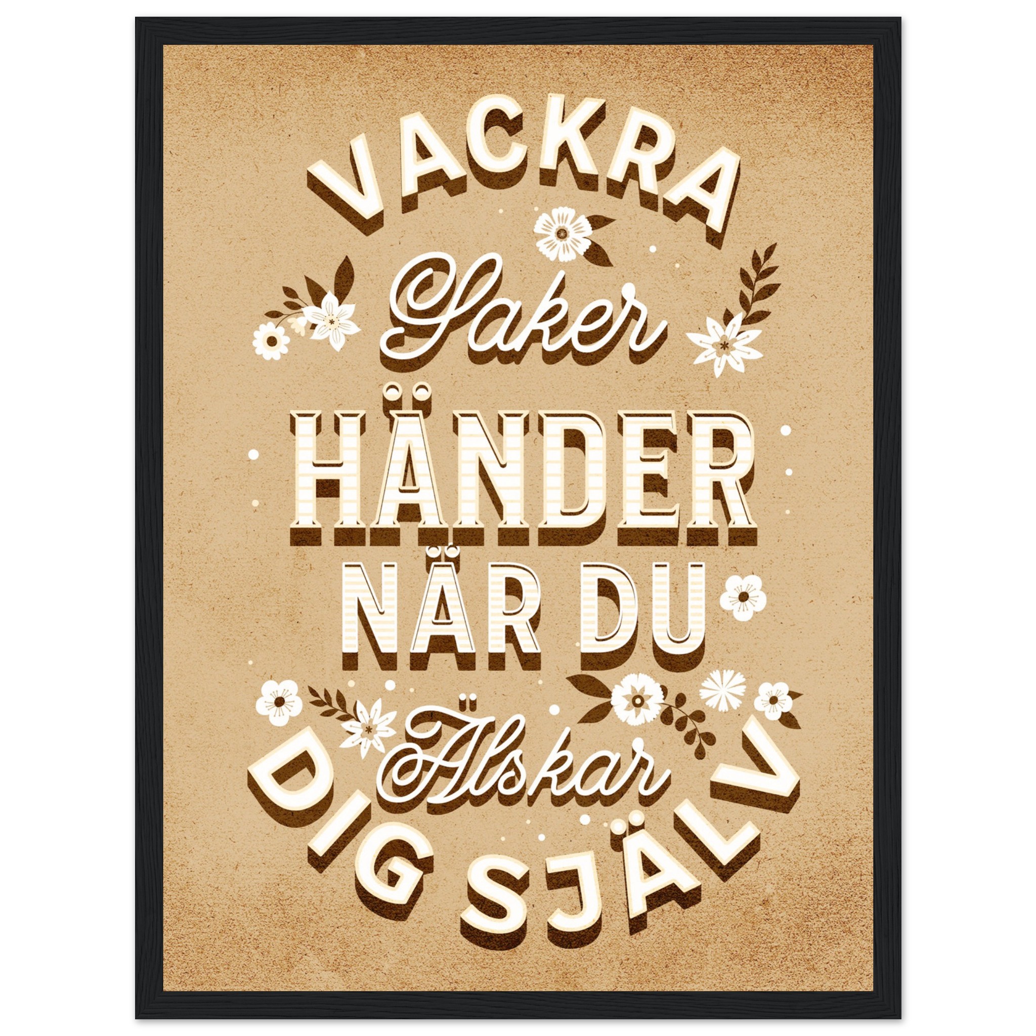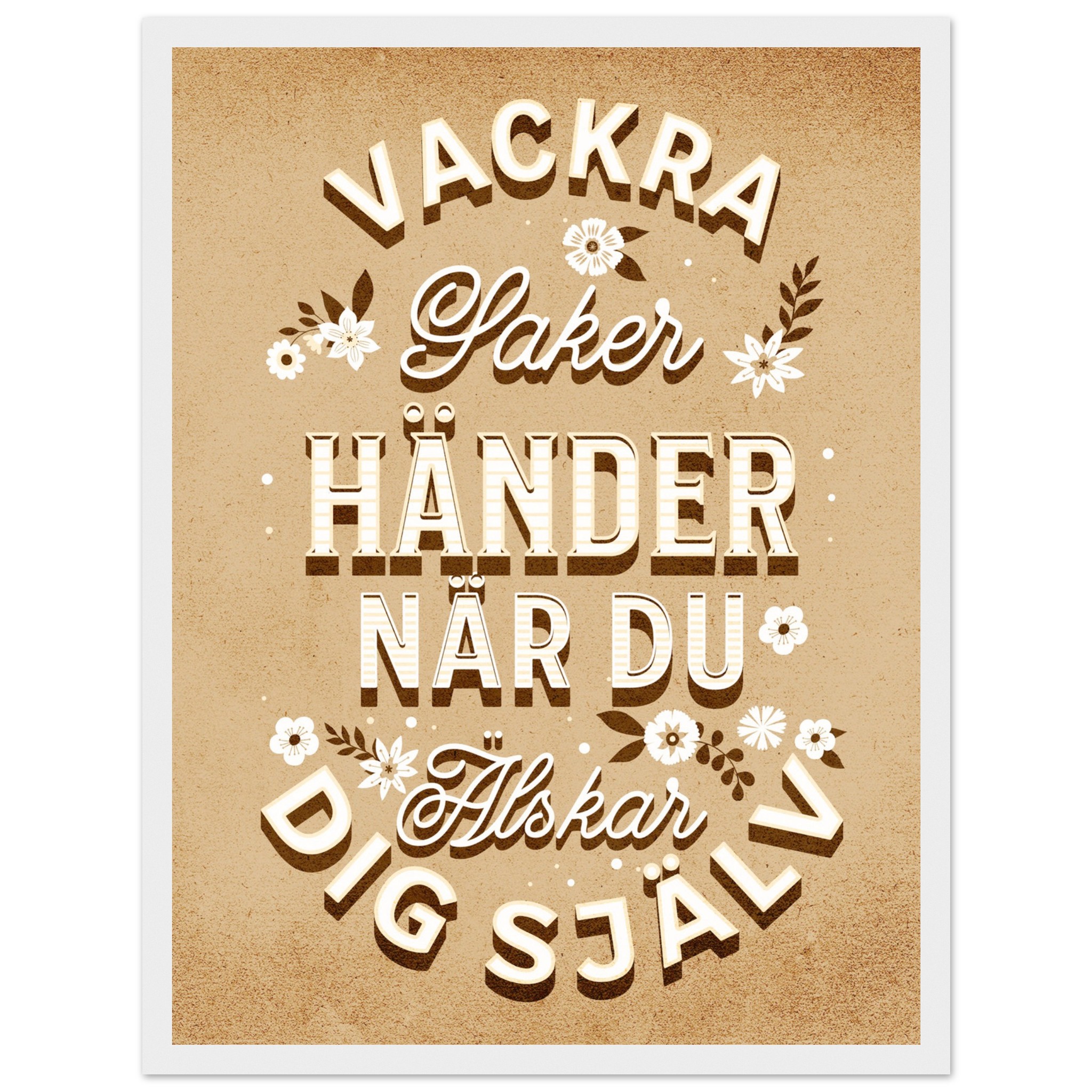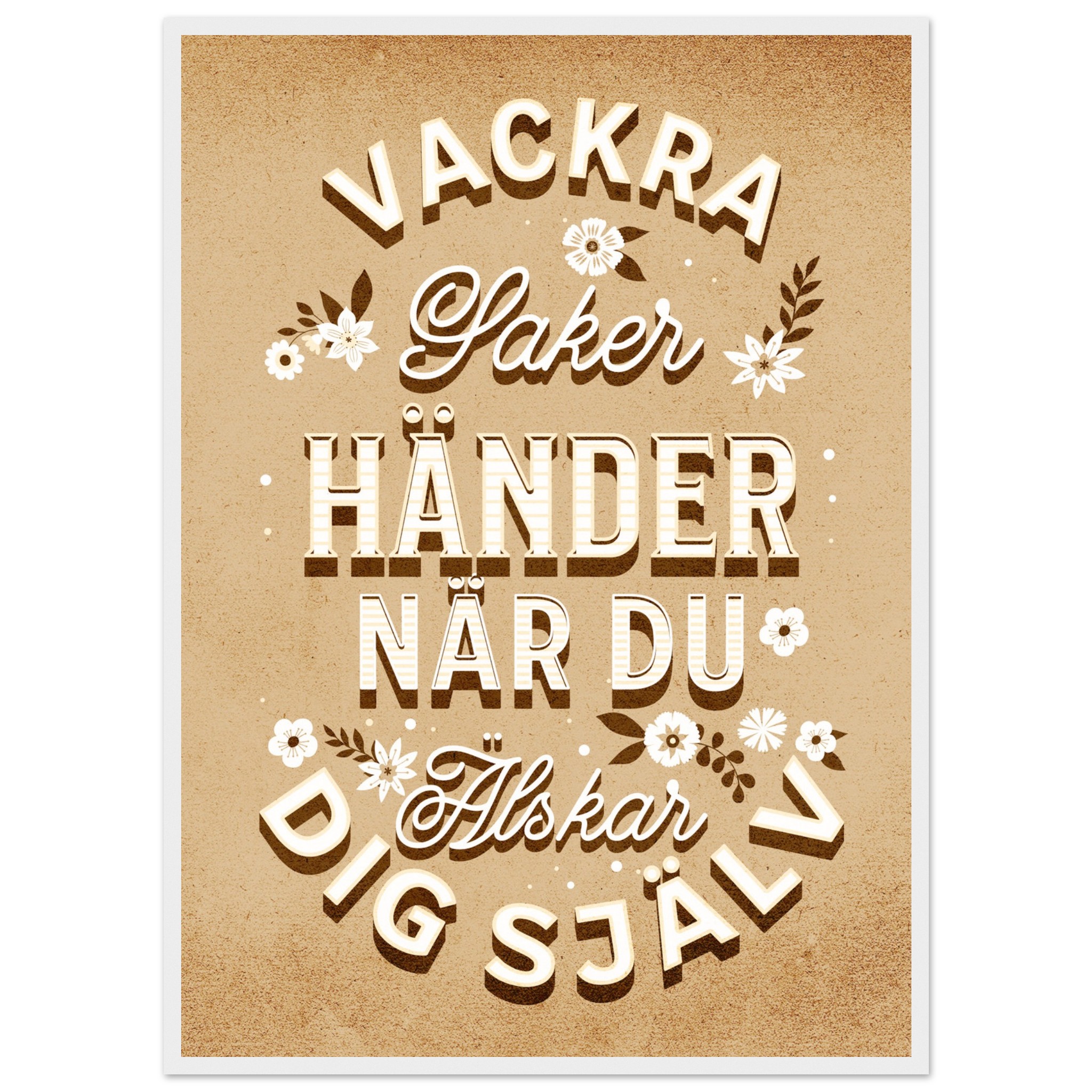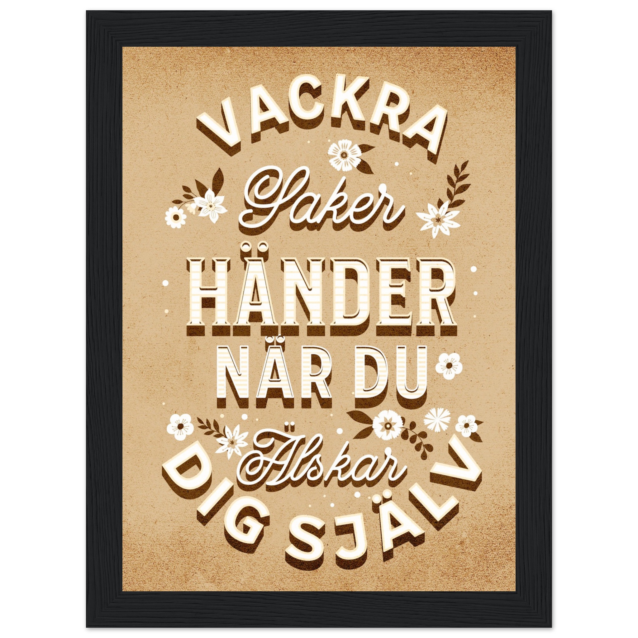 Denna ’Älska dig själv’-poster är inte bara en vacker väggdekoration, utan också en inspirerande påminnelse om självkärlekens kraft. Med orden ’Vackra saker händer när du älskar dig själv’ i framträdande stiliserad typografi, sprider den en daglig dos av positivitet i ditt hem. Dess vintageinspirerade design och varma färgpalett kompletteras med detaljerade blommiga dekorationer, vilket skapar en känsla av tröst och uppmuntran. Perfekt för sovrummet, vardagsrummet eller något utrymme där du vill införa en positiv atmosfär. Tryckt på högkvalitativt matt papper och tillgänglig med en svart eller vit ram.